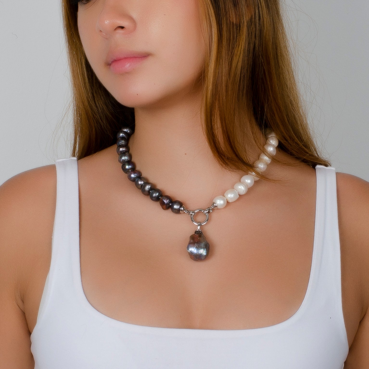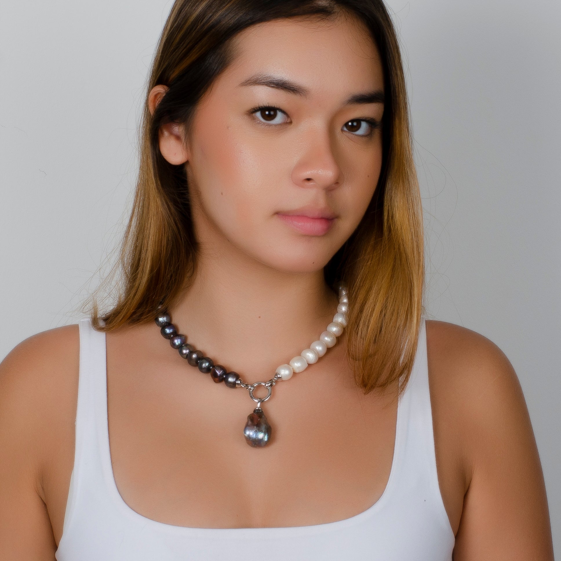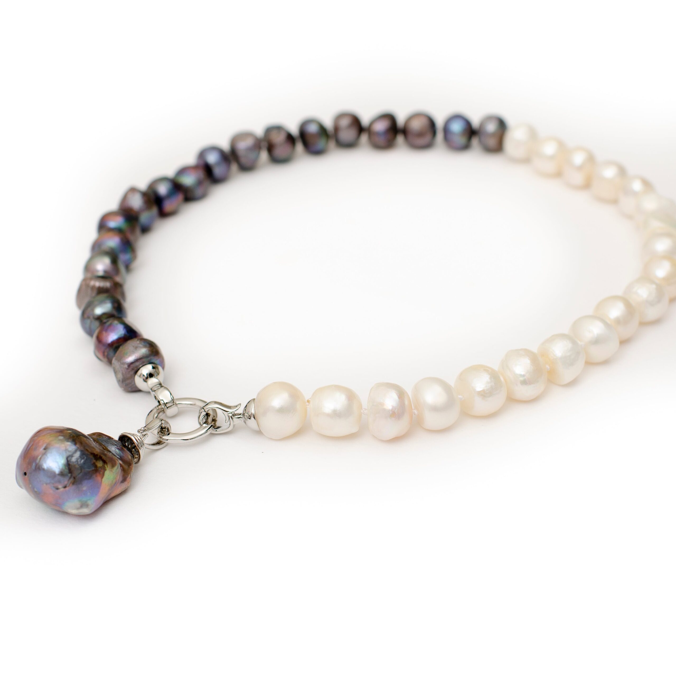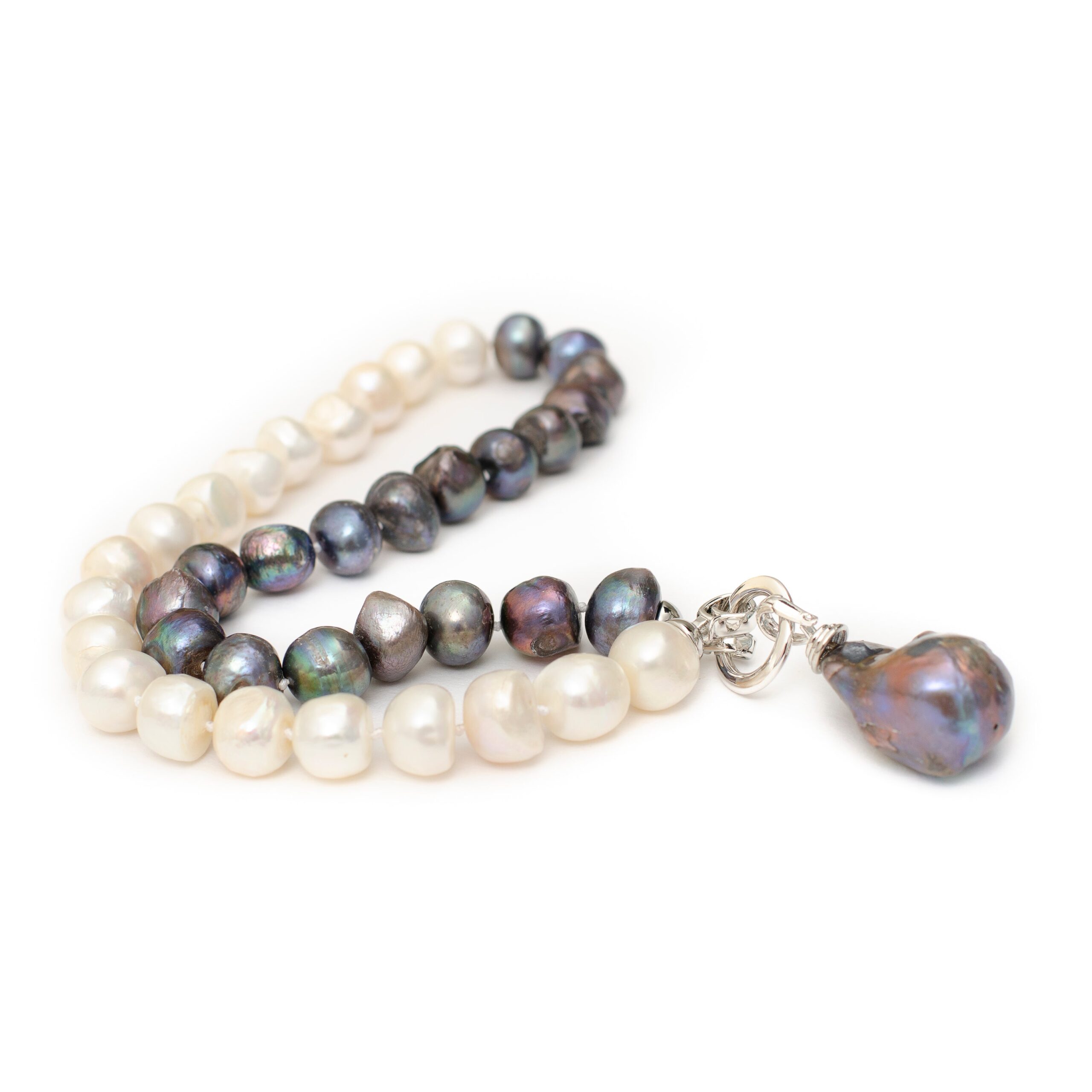 -Classic black and white fresh water pearl necklace with a baroque pearl drop
