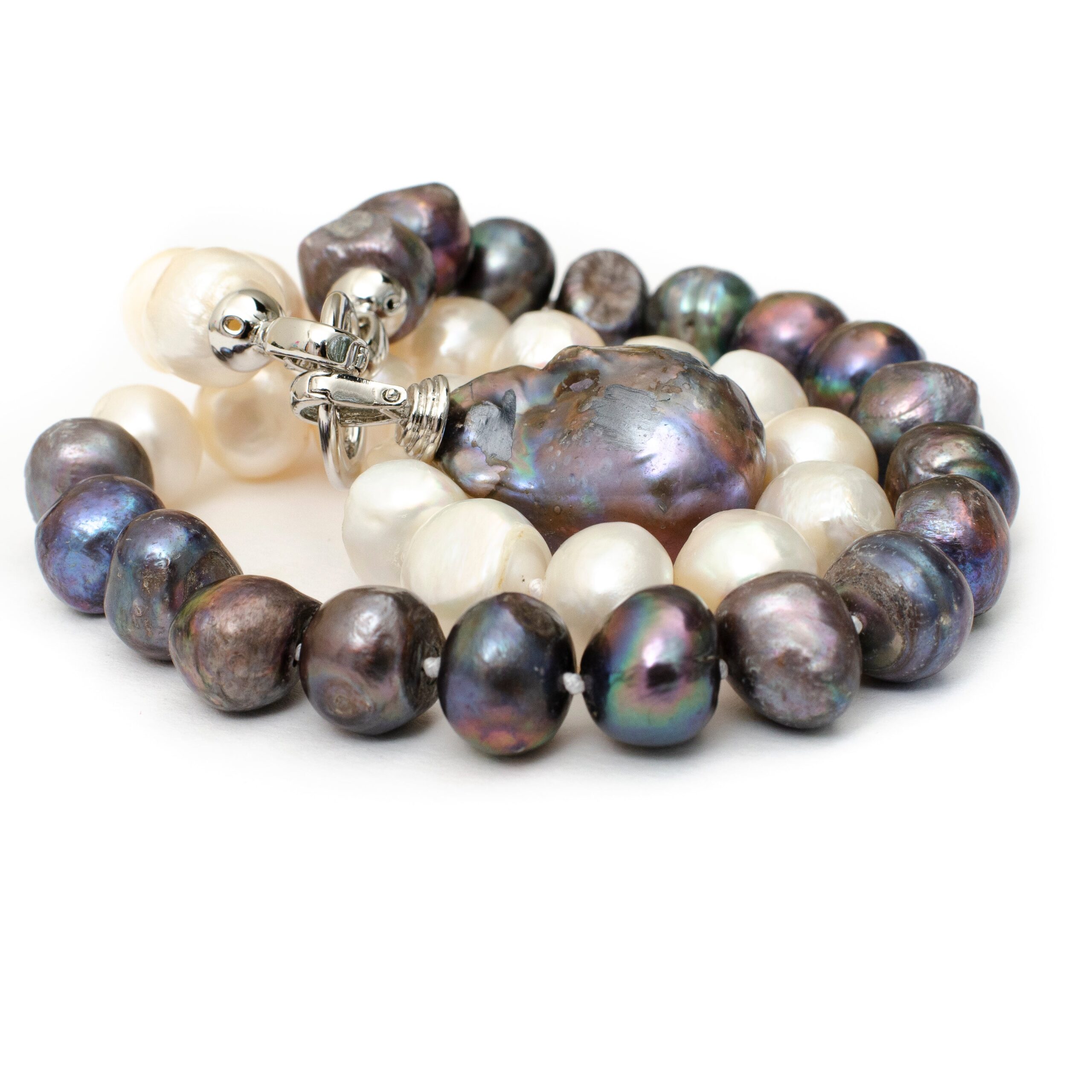 -Each pearl is hand knotted together with a silver clasp that closes from the front