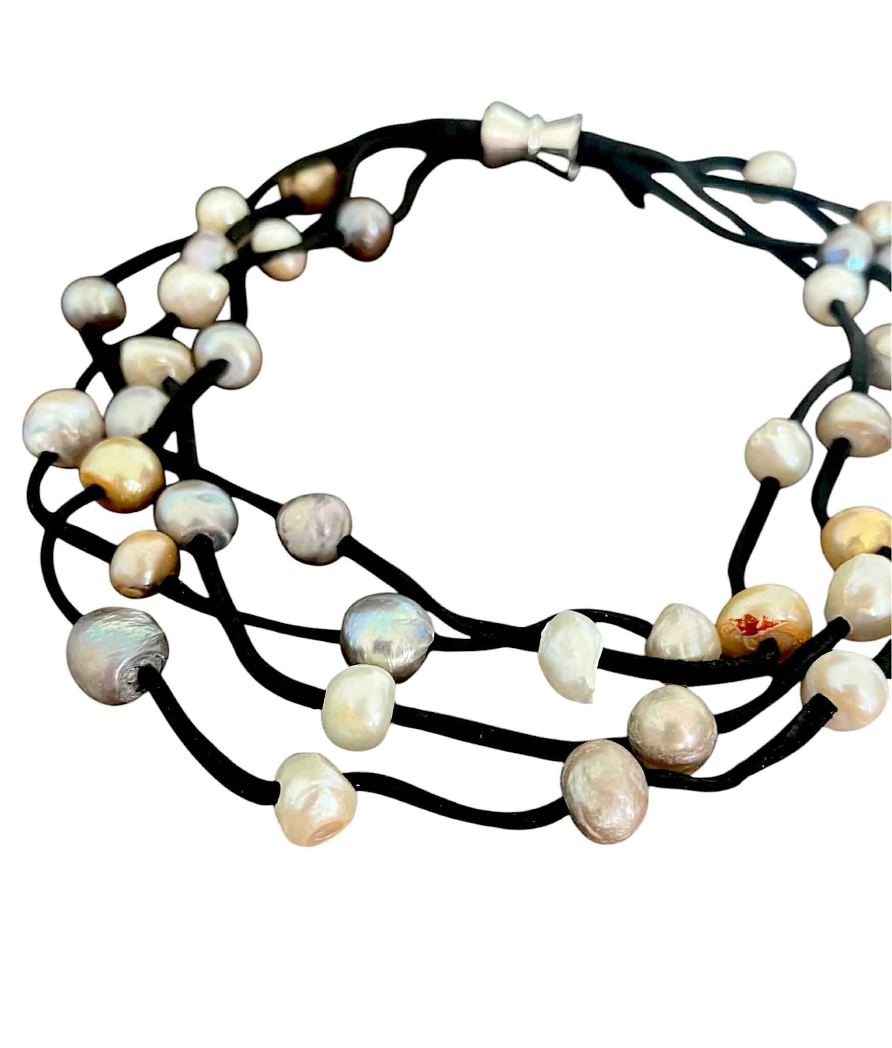 -Beautiful multi coloured pearl necklace hand strung in black  suede