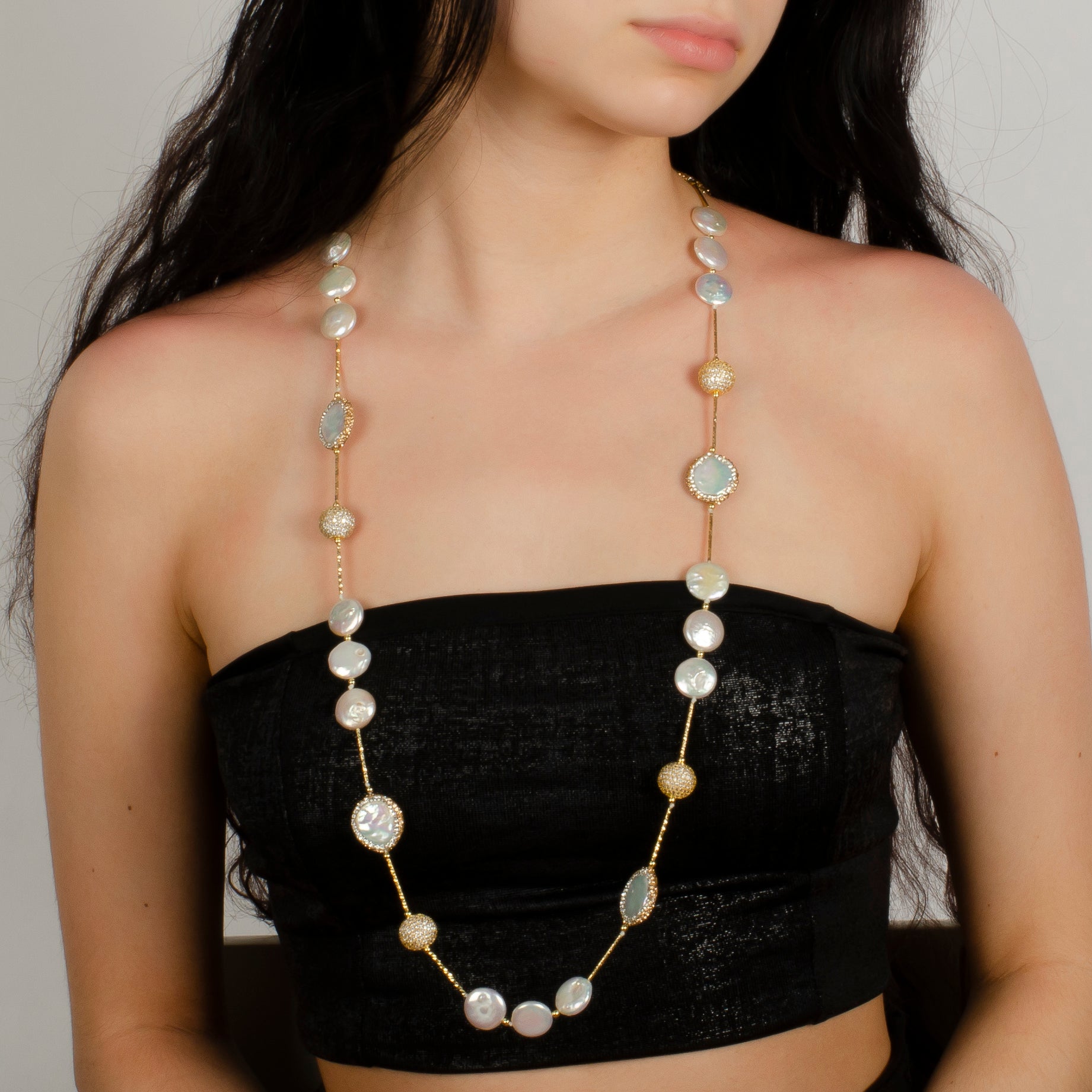-Necklace is made with fine quality white coin pearls outlined in gold shimmer crystals                                                                   -The pearls are hand knotted with a gold bead and 18K gold plated wireÂ