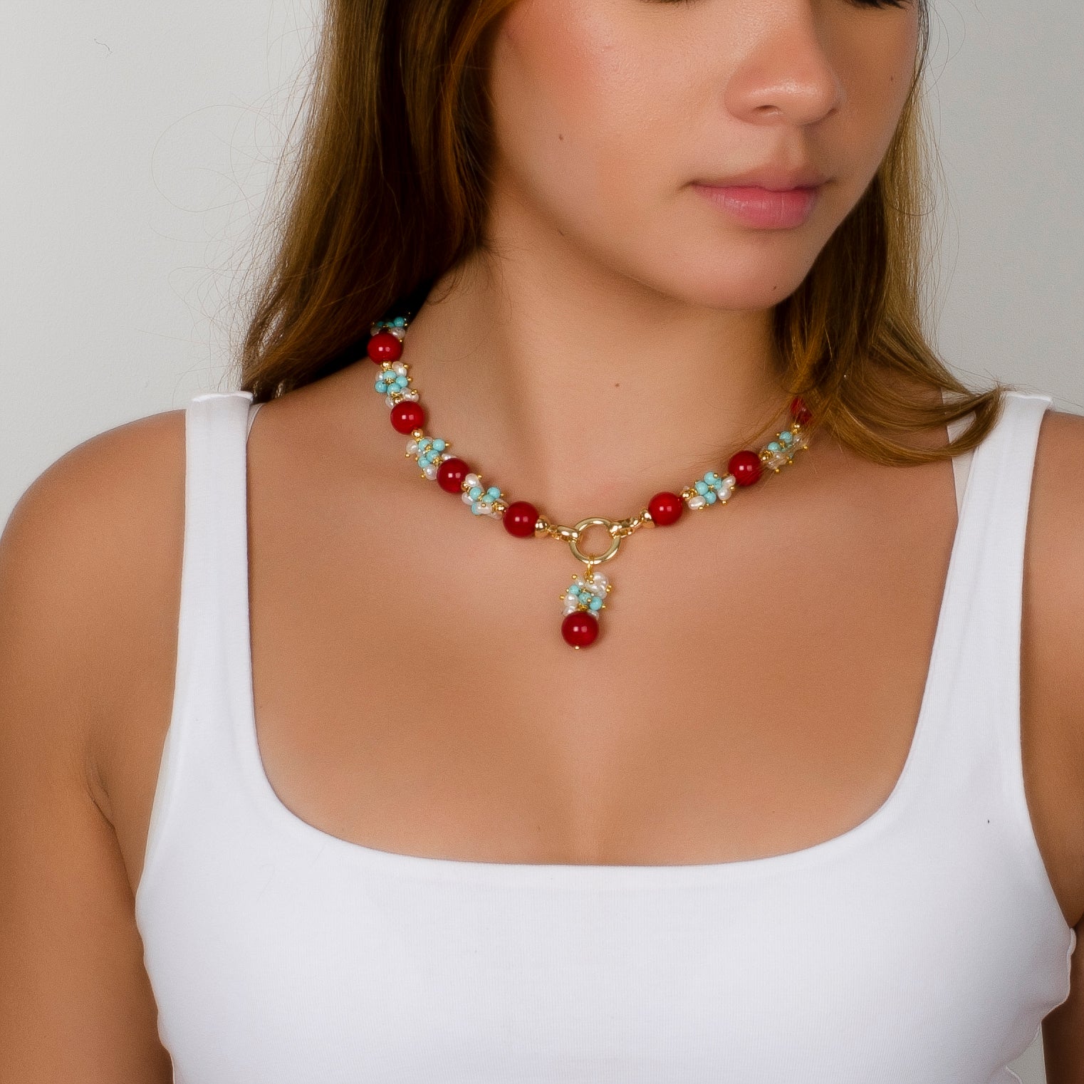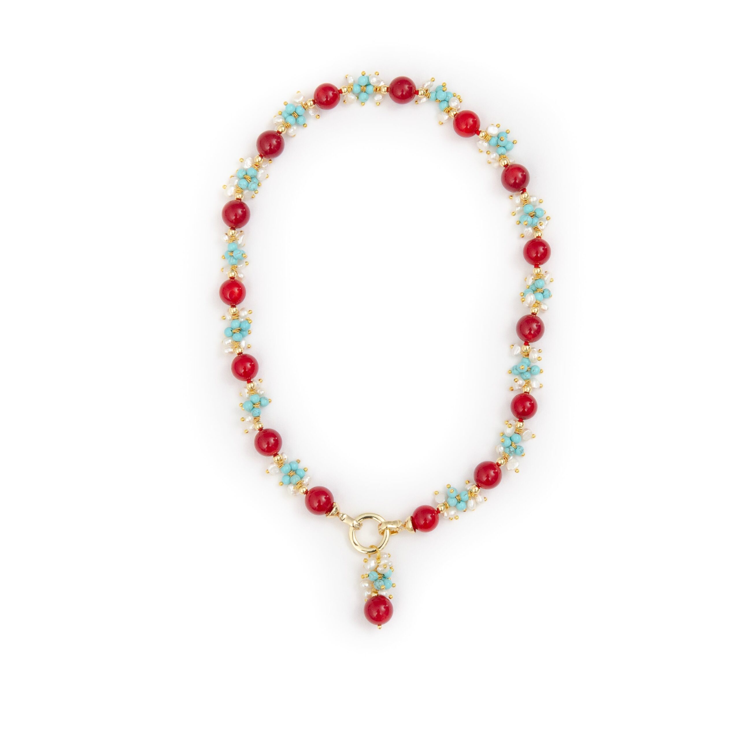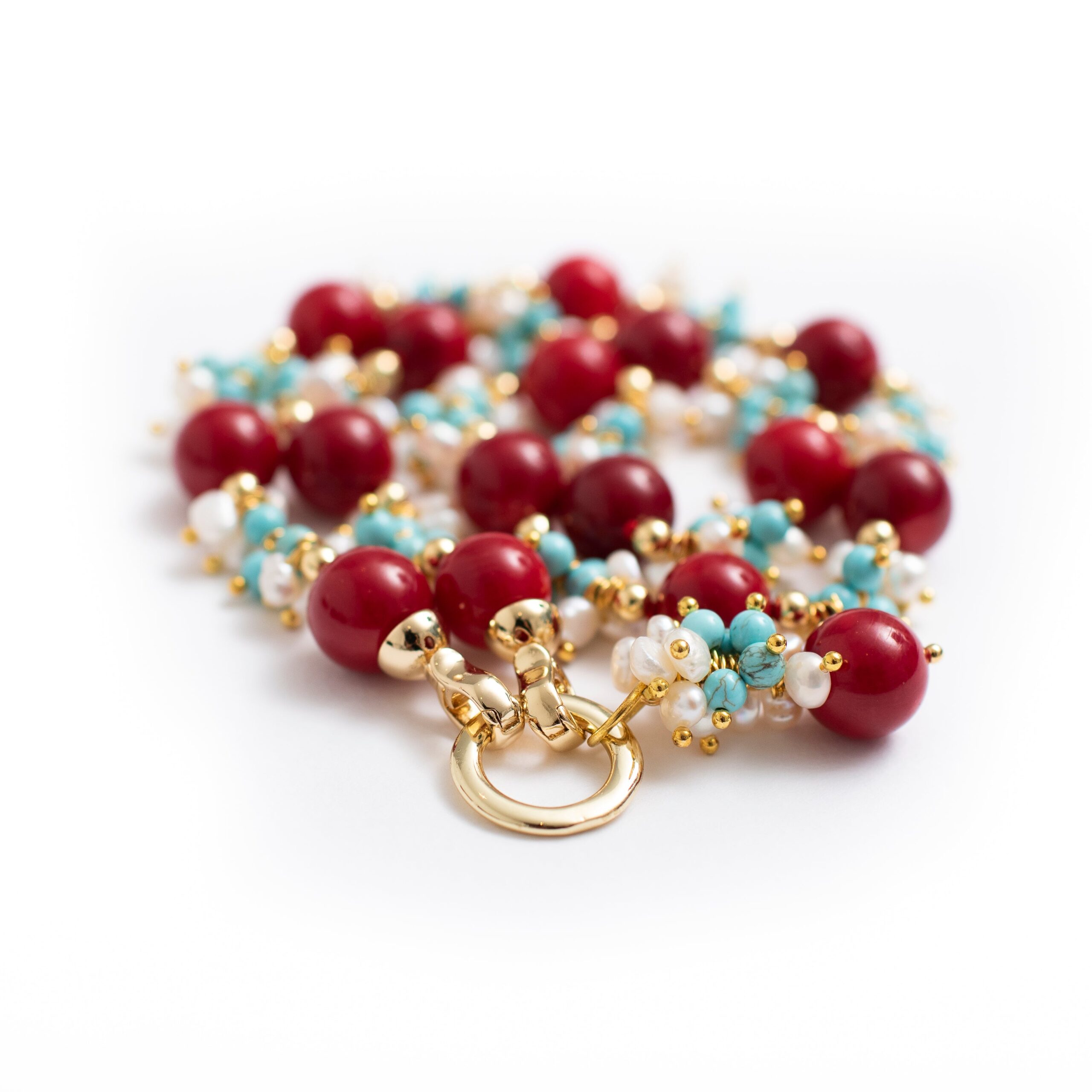 -The necklace is hand strung with gold beads, turquoise and fresh water pearls                                   -It has a comfortable clasp in front with a coral drop