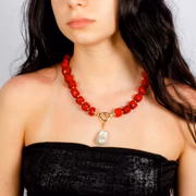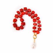 The necklace is hand knotted with gold beads in between each coral and has a chunky white baroque drop -It has a comfortable front clasp
