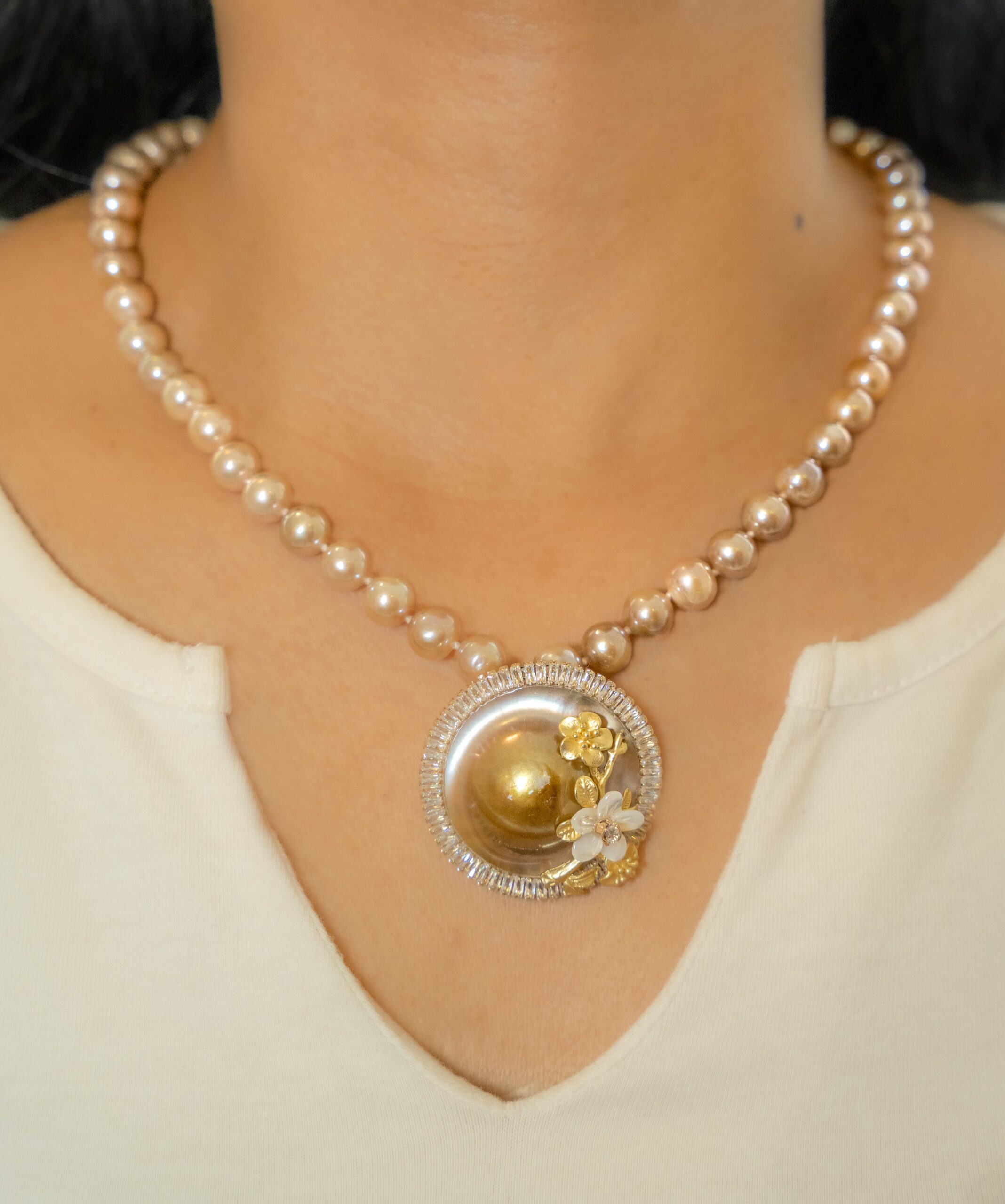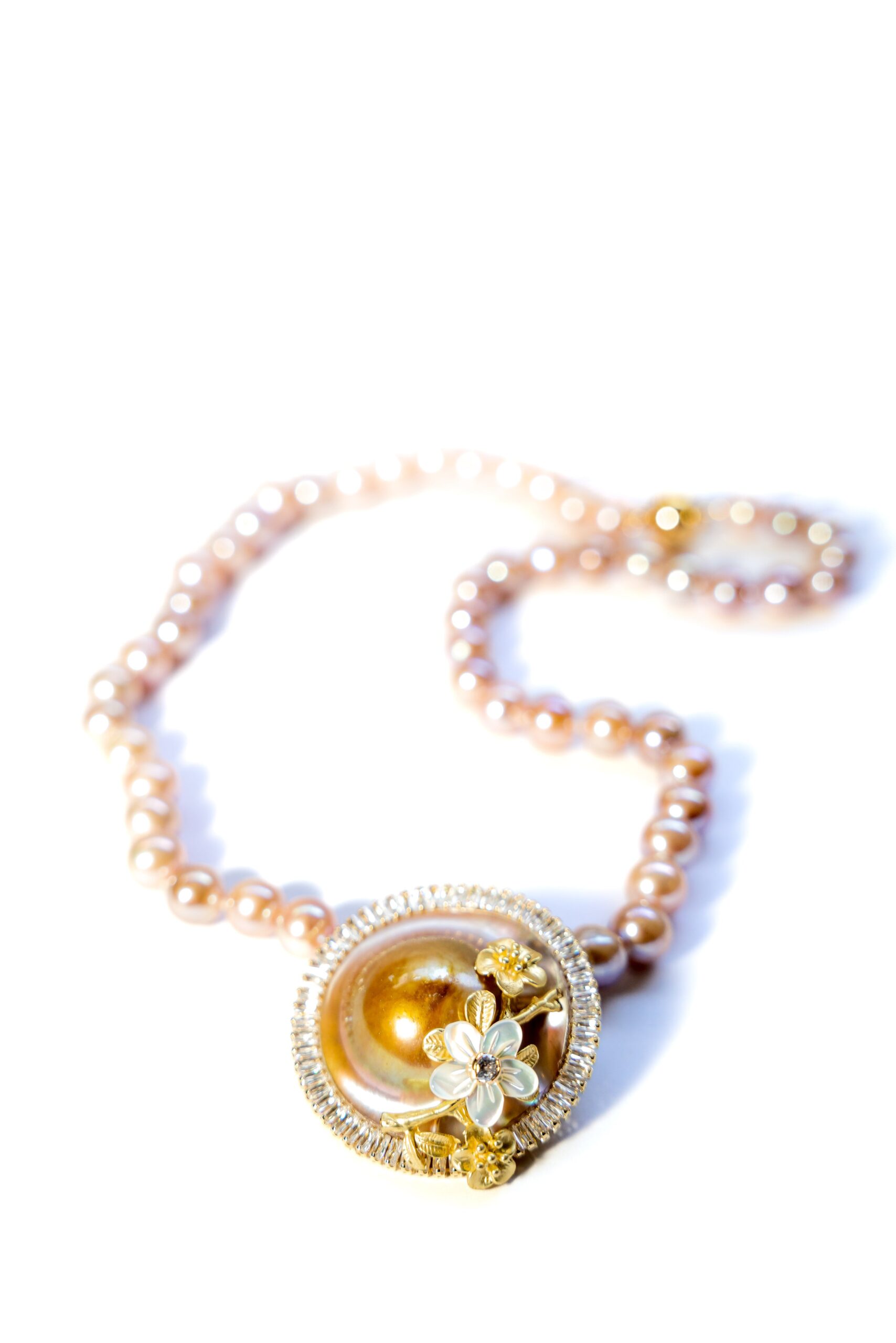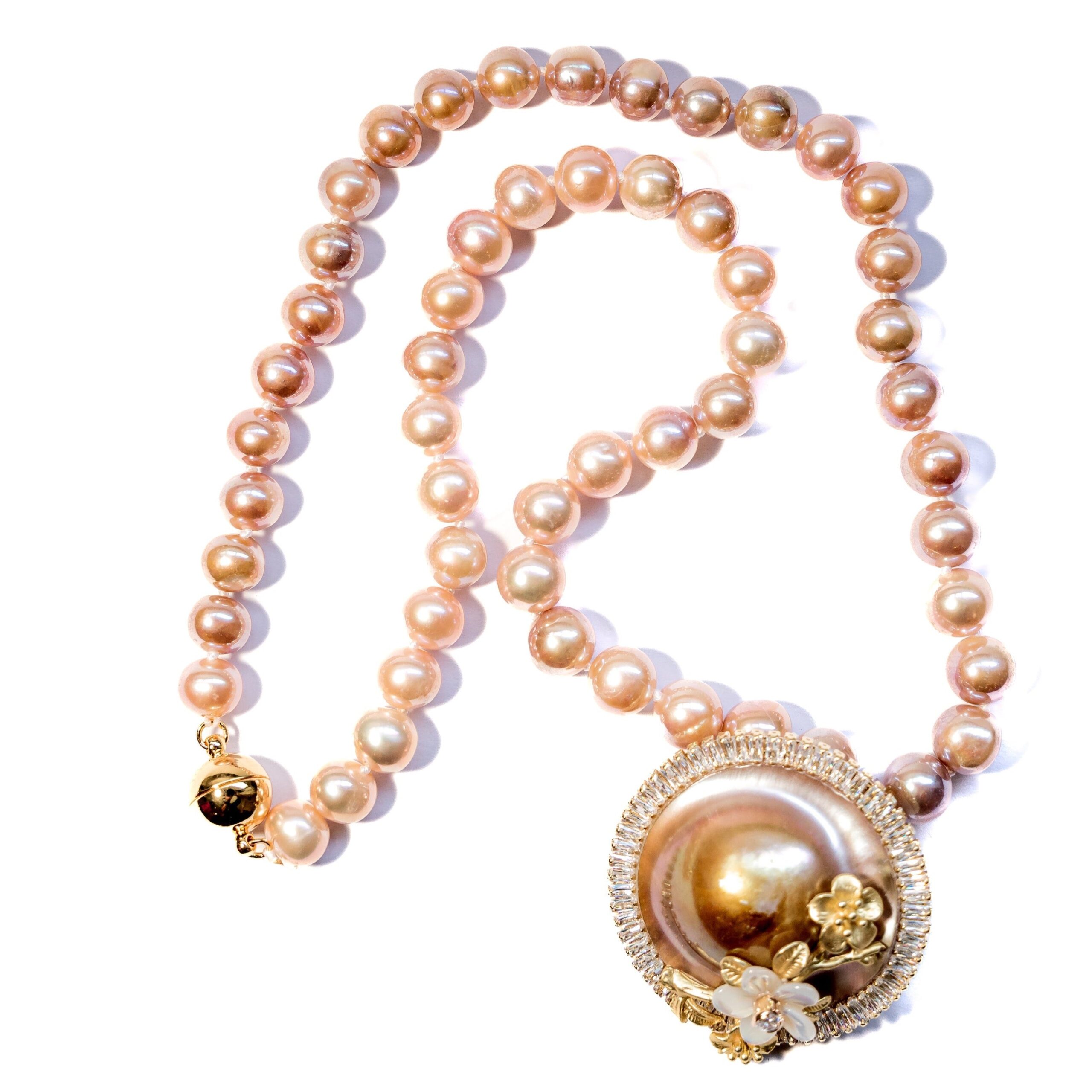 -Each strand is hand knotted with gold beads in between each pearl and has a chunky mabe pearl pendant