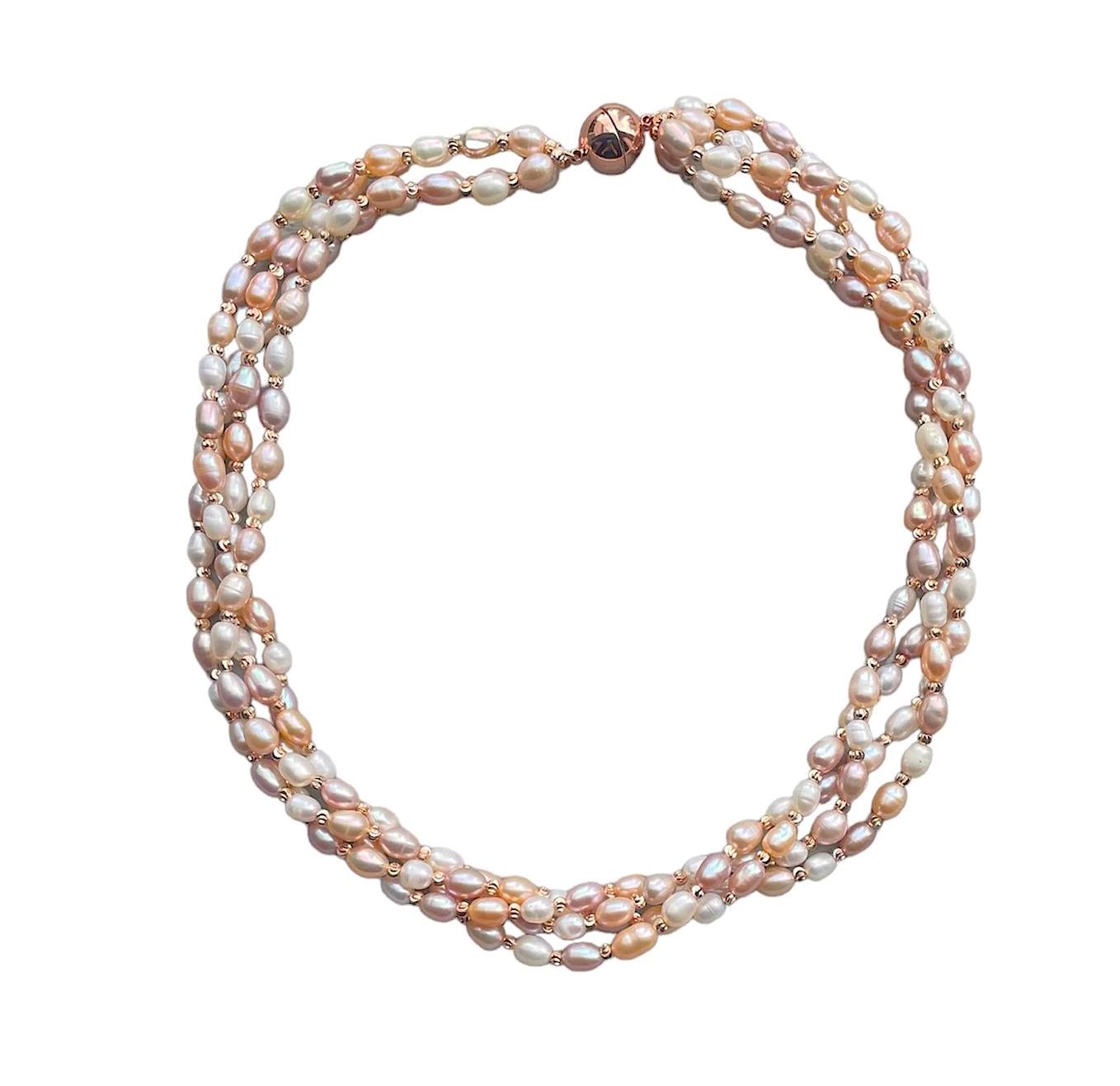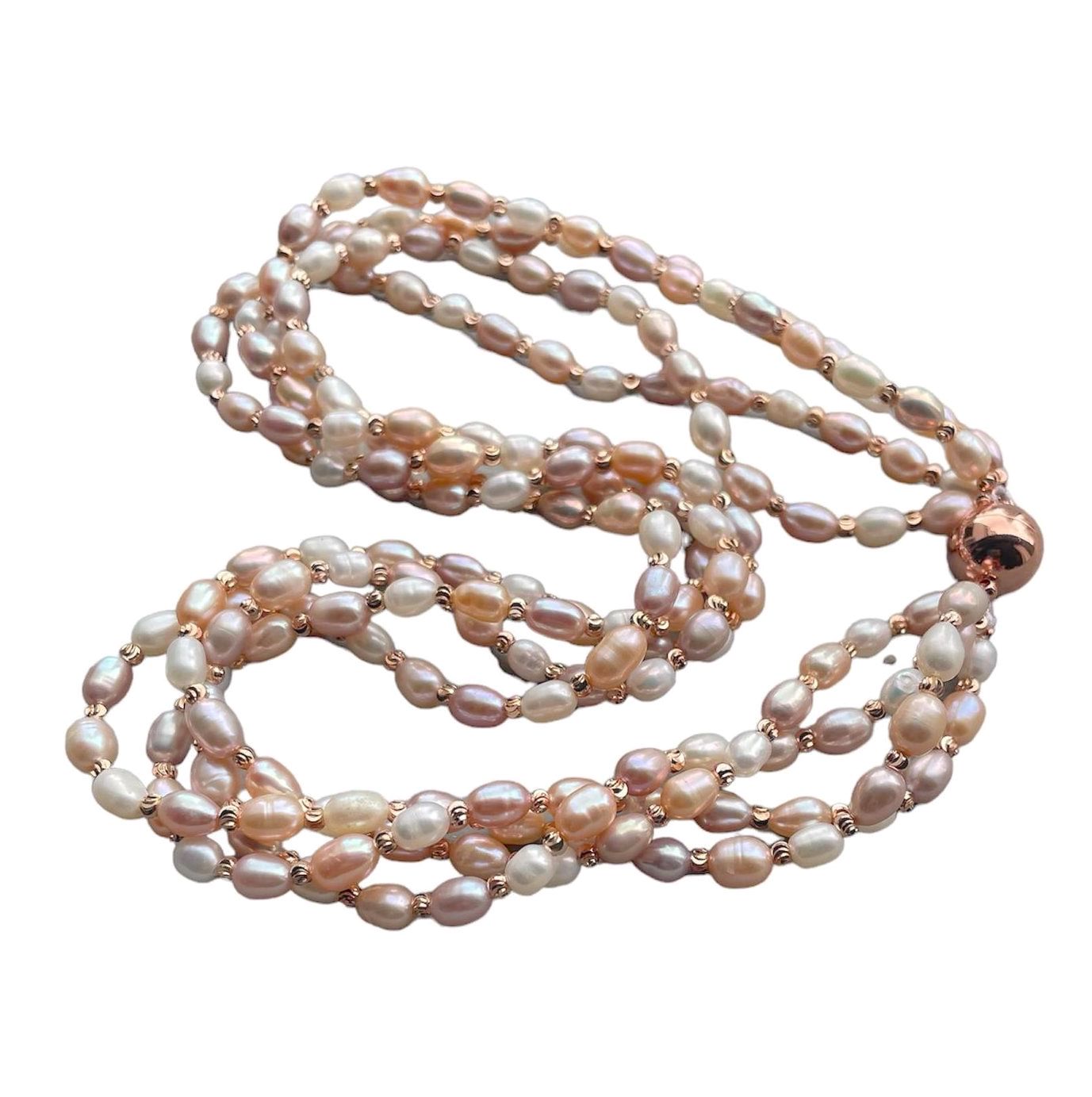 -Each pearl is hand knotted with rose gold beads in between each pearl a comfortable magnetic clasp                                                                    -Length of the necklace is 20 inches                                            -Due to nature of natural pearls, each piece may slightly vary in size, shape and shade of pearls from the picture taken of the product.