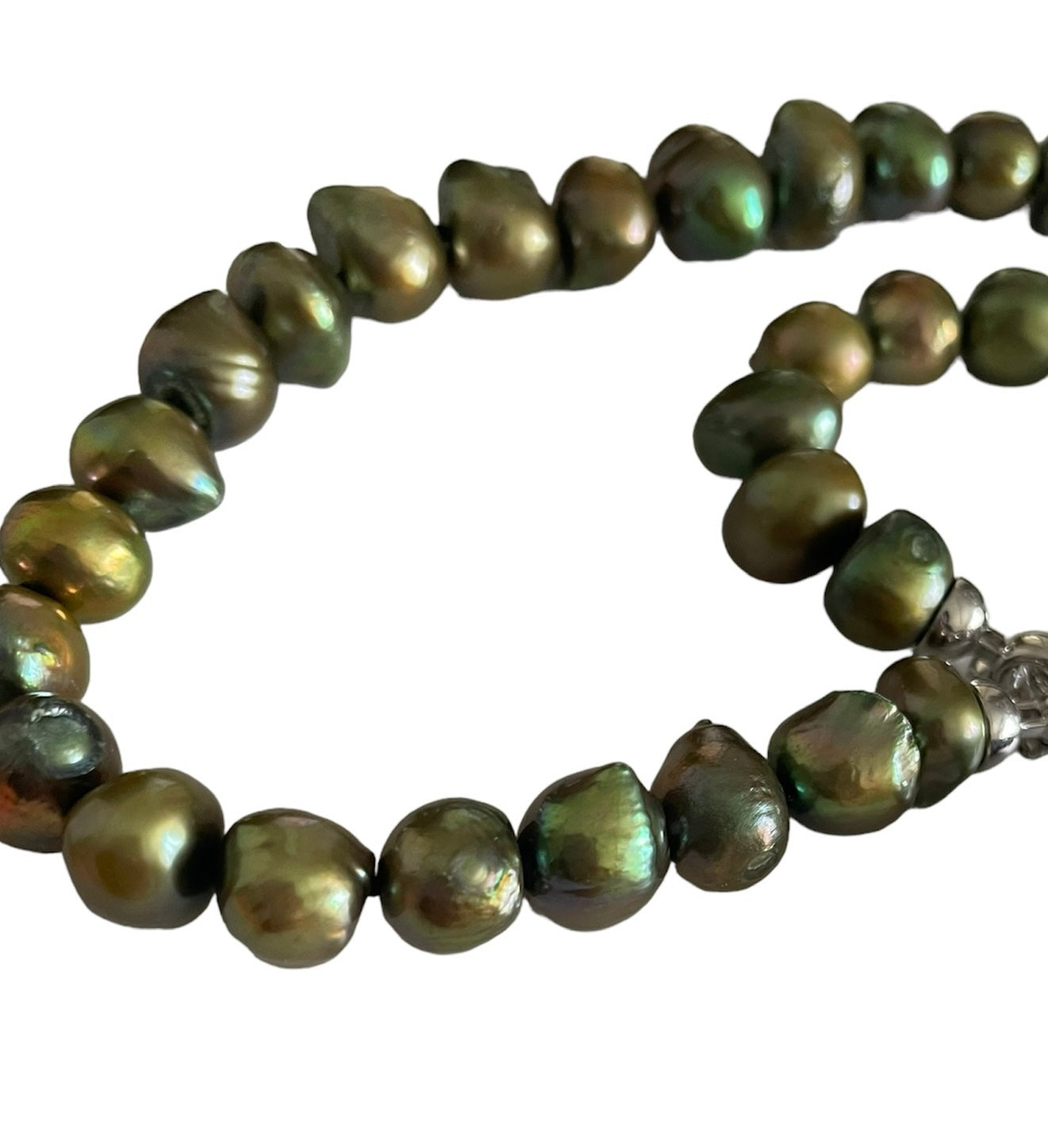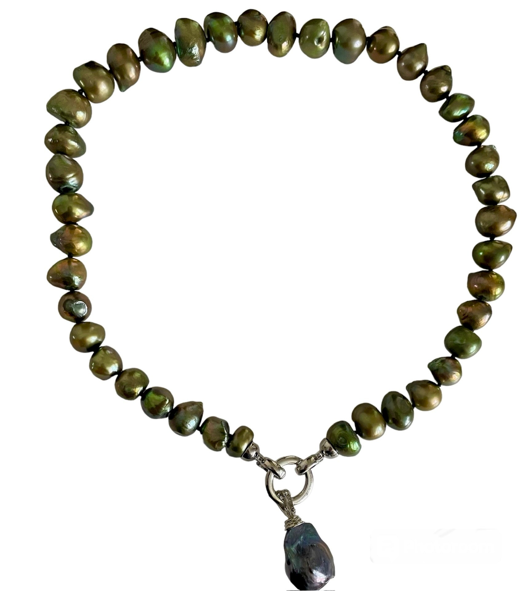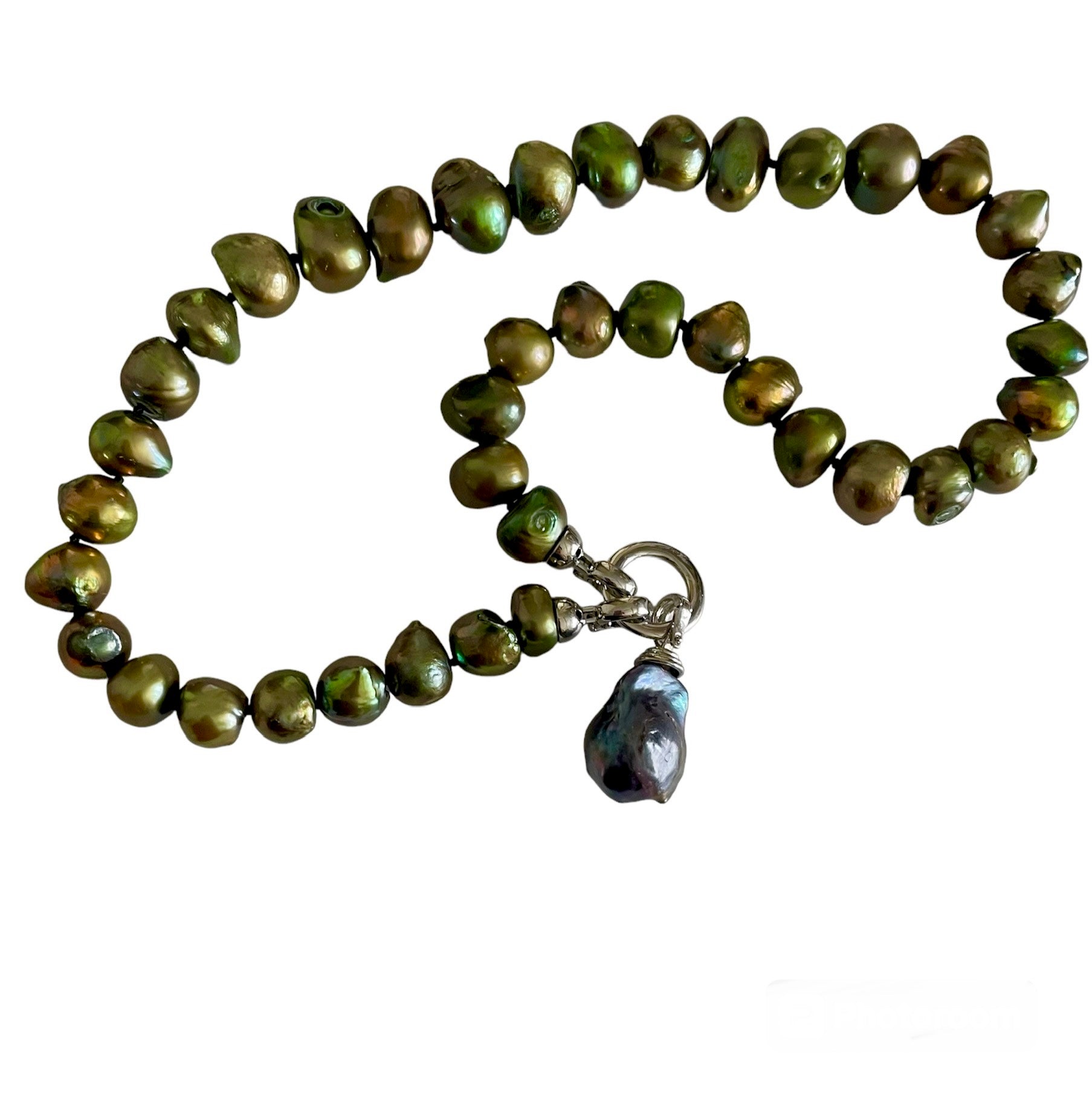 -Classic natural green fresh water pearl necklace with a black baroque pearl drop