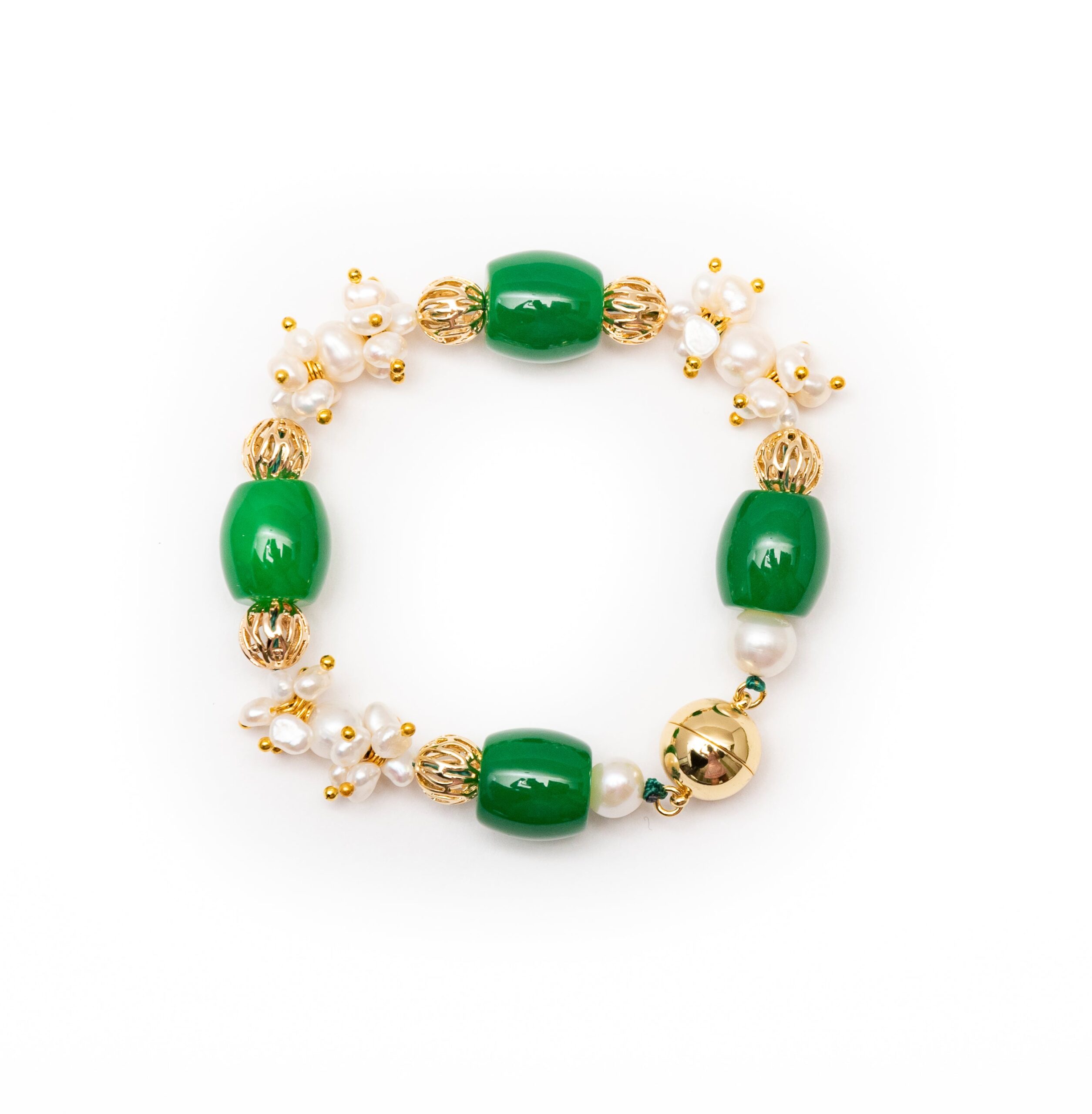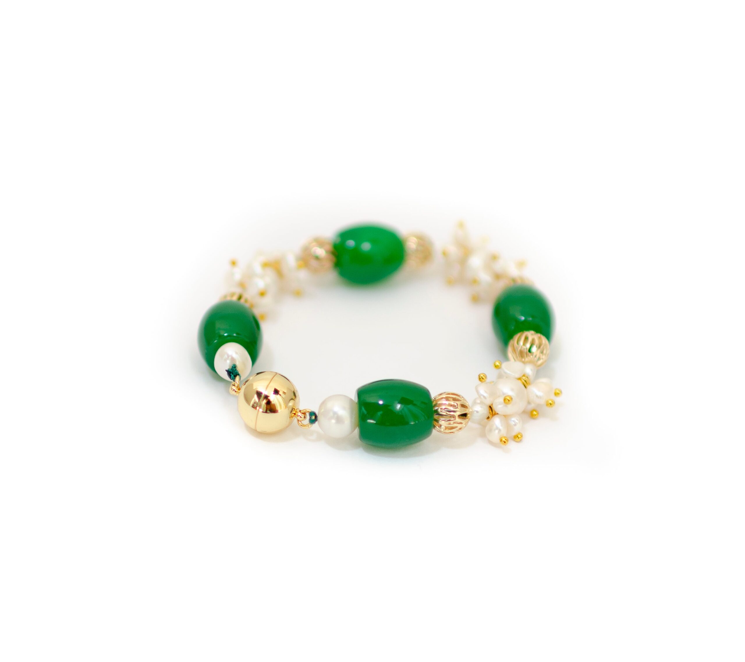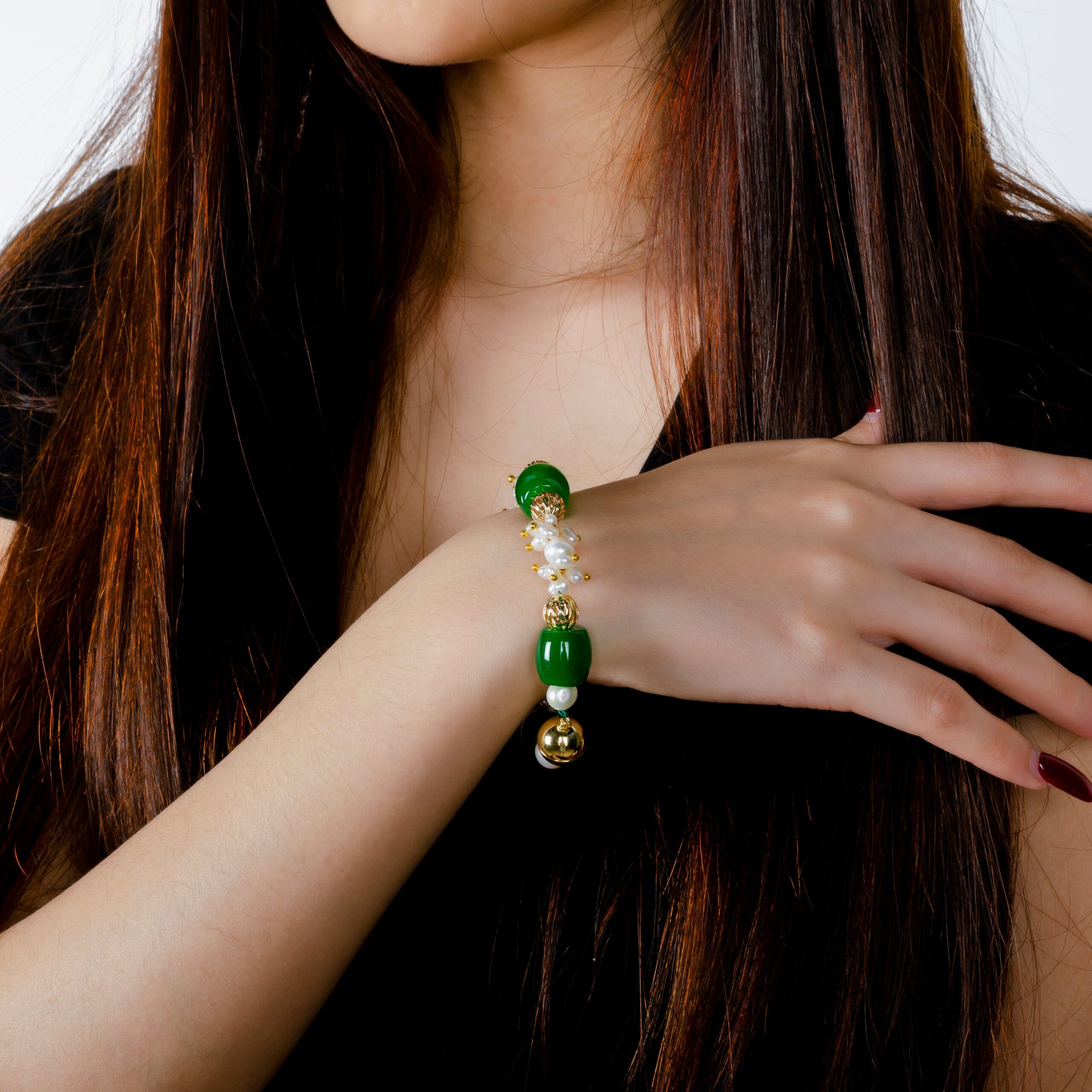 -Classic pearl and chunky jade bracelet with grape cluster of white fresh water pearls