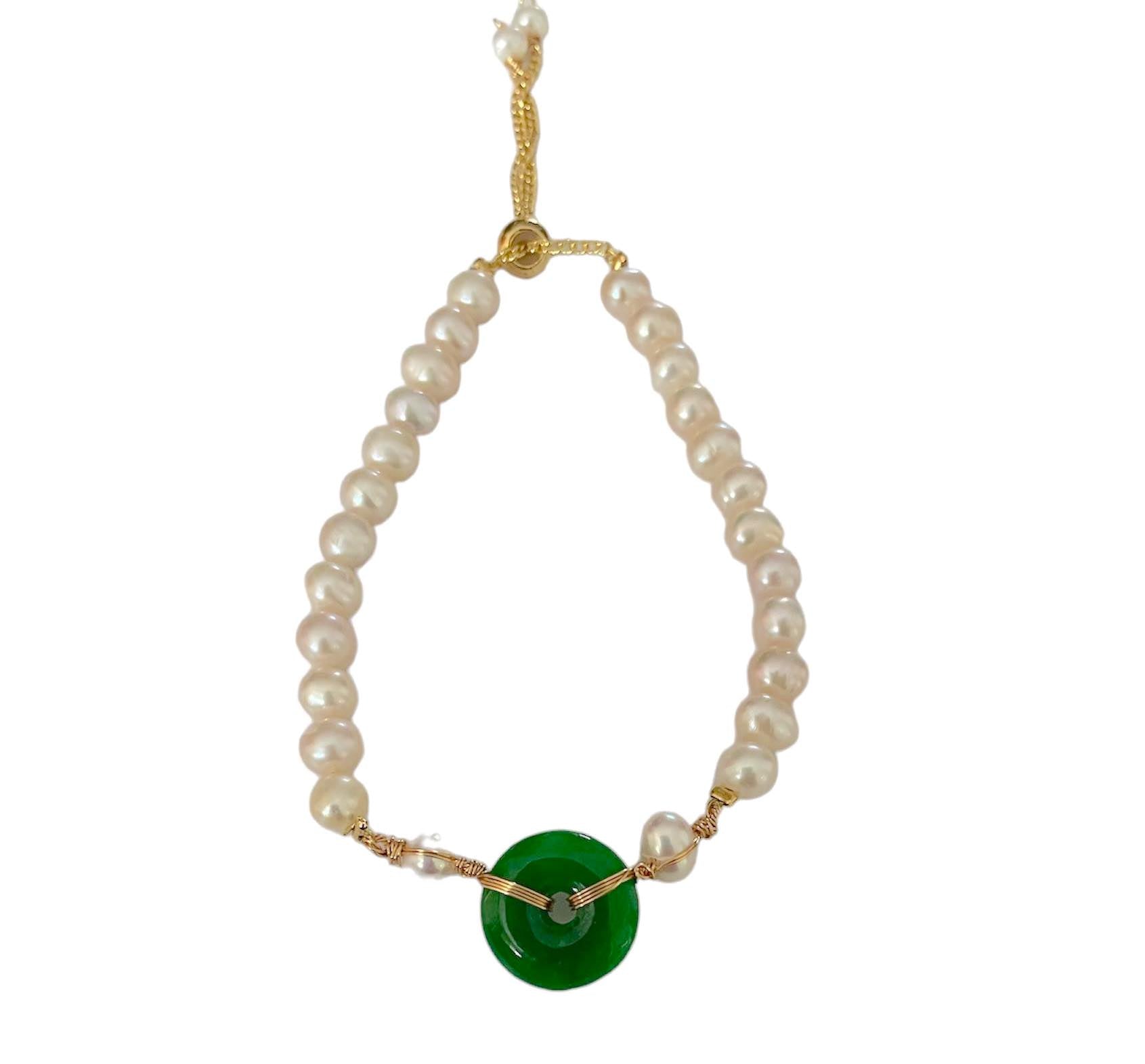 -Beautiful fresh water pearl and jade bracelet                                     -Hand made with gold plated chain