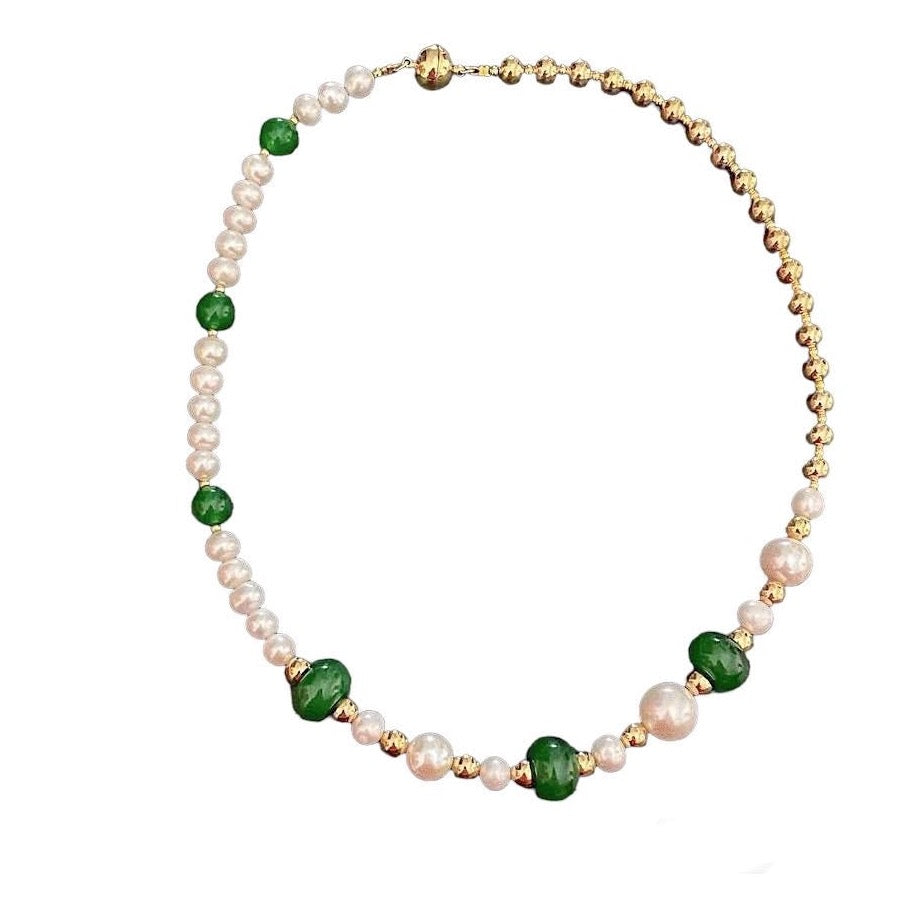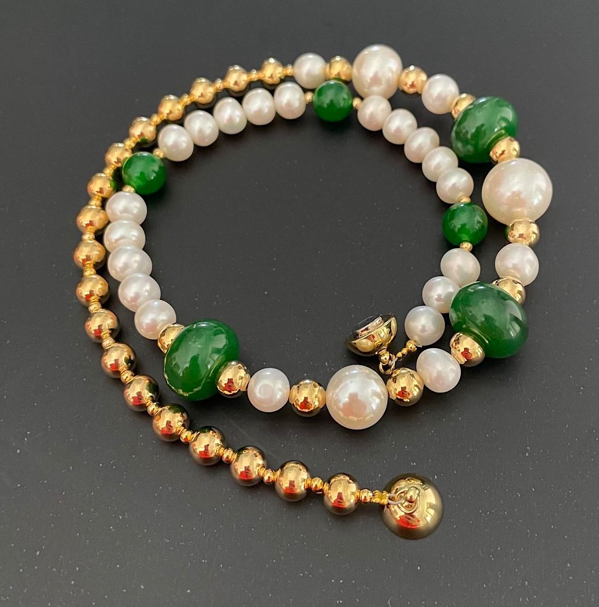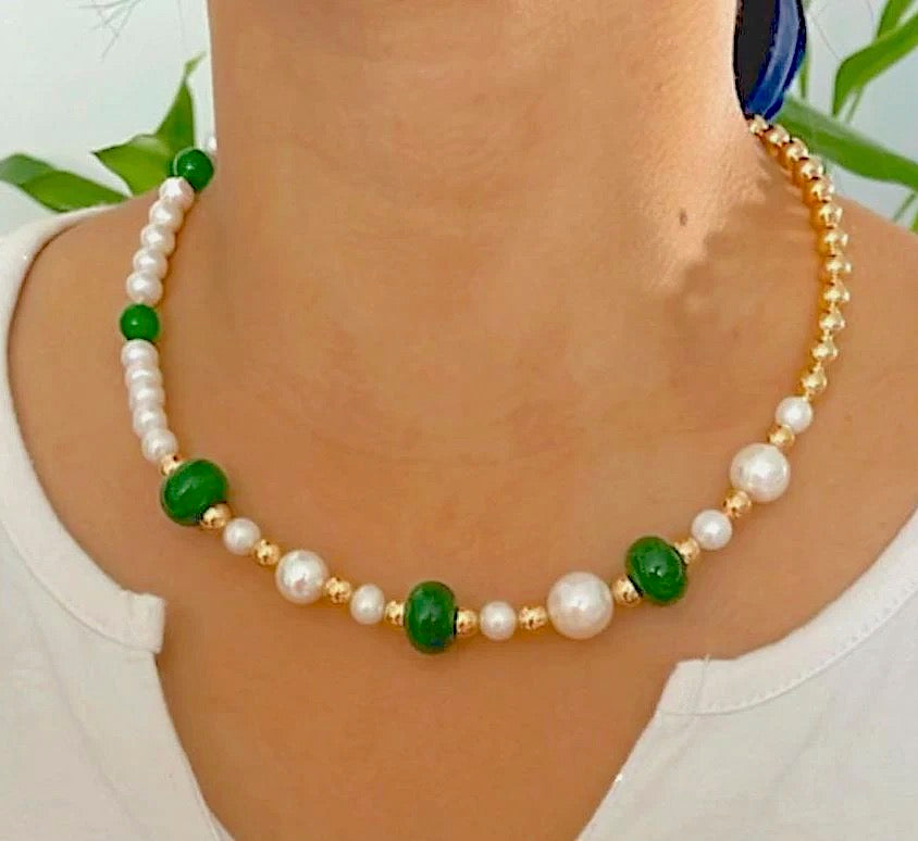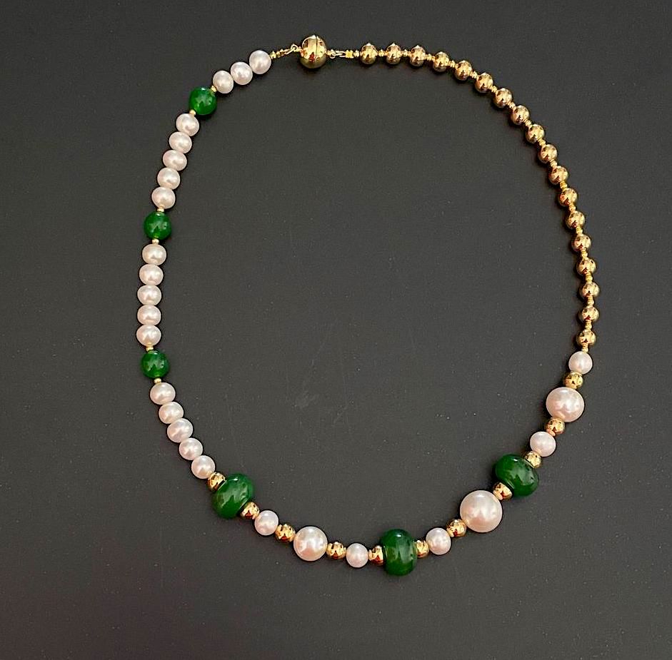 -Necklace is made with beautiful jade and pearls                                                  -The necklace is hand knotted with jade, pearls and gold beads                                                            -Length of the necklace is 20 inches and has a comfortable magnetic clasp