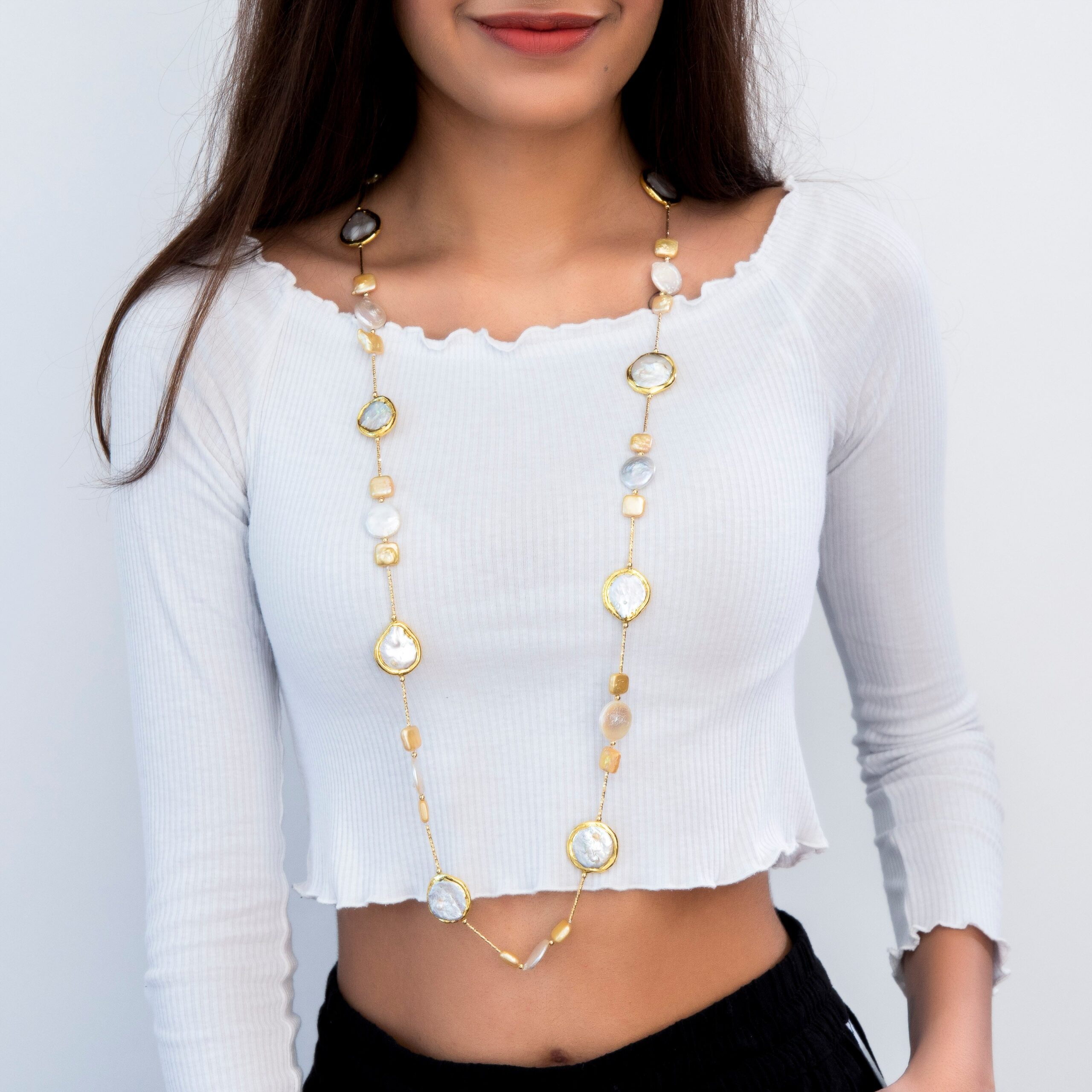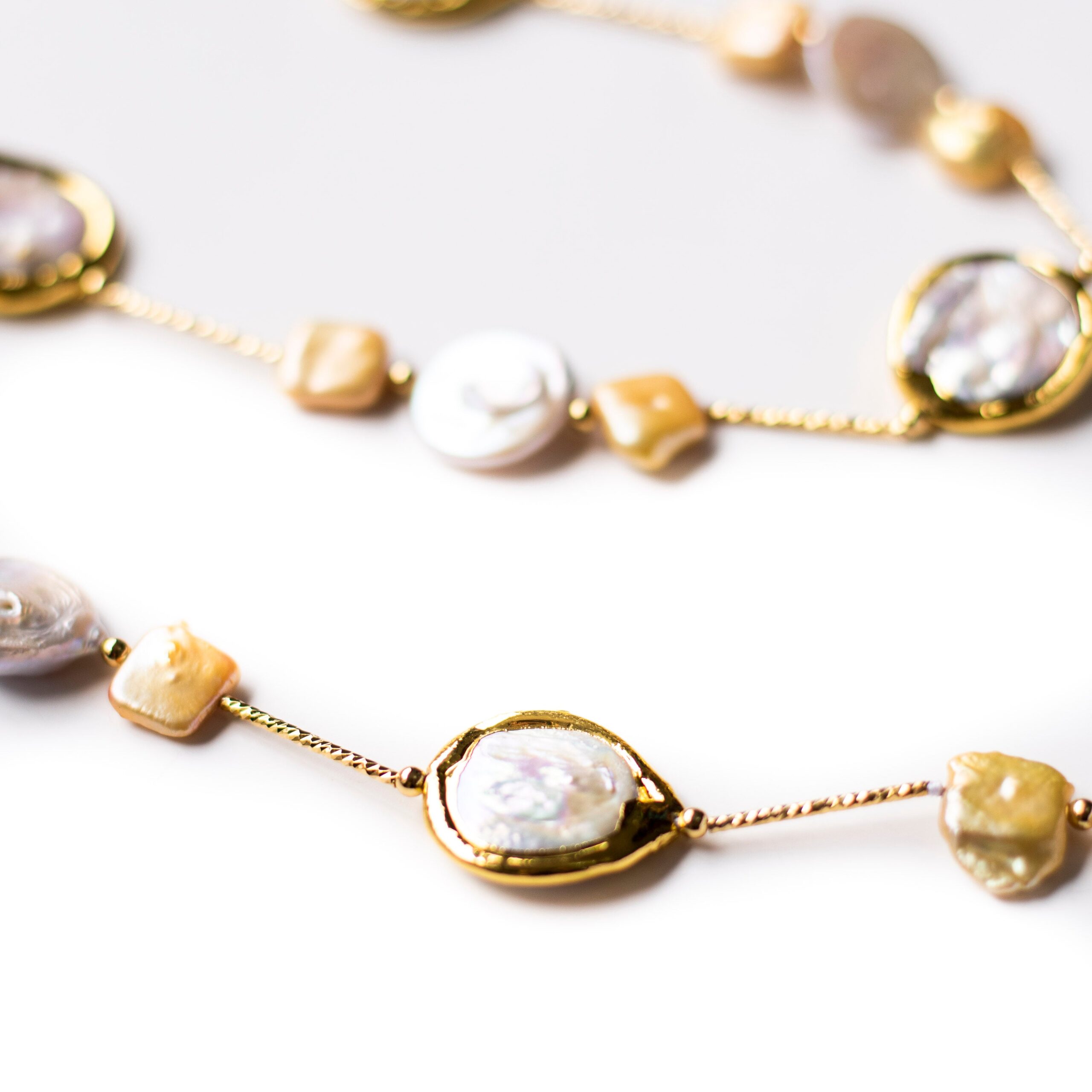 -Necklace is made with fine quality lustrous white and gold fresh water coin pearls                                                               -The necklace is hand strung in gold wire with gold square pearls and white fresh water coin pearls                                                      -The pearls are strung with special hand made gold plated pearl bed              -Length of the necklace is 40 inches