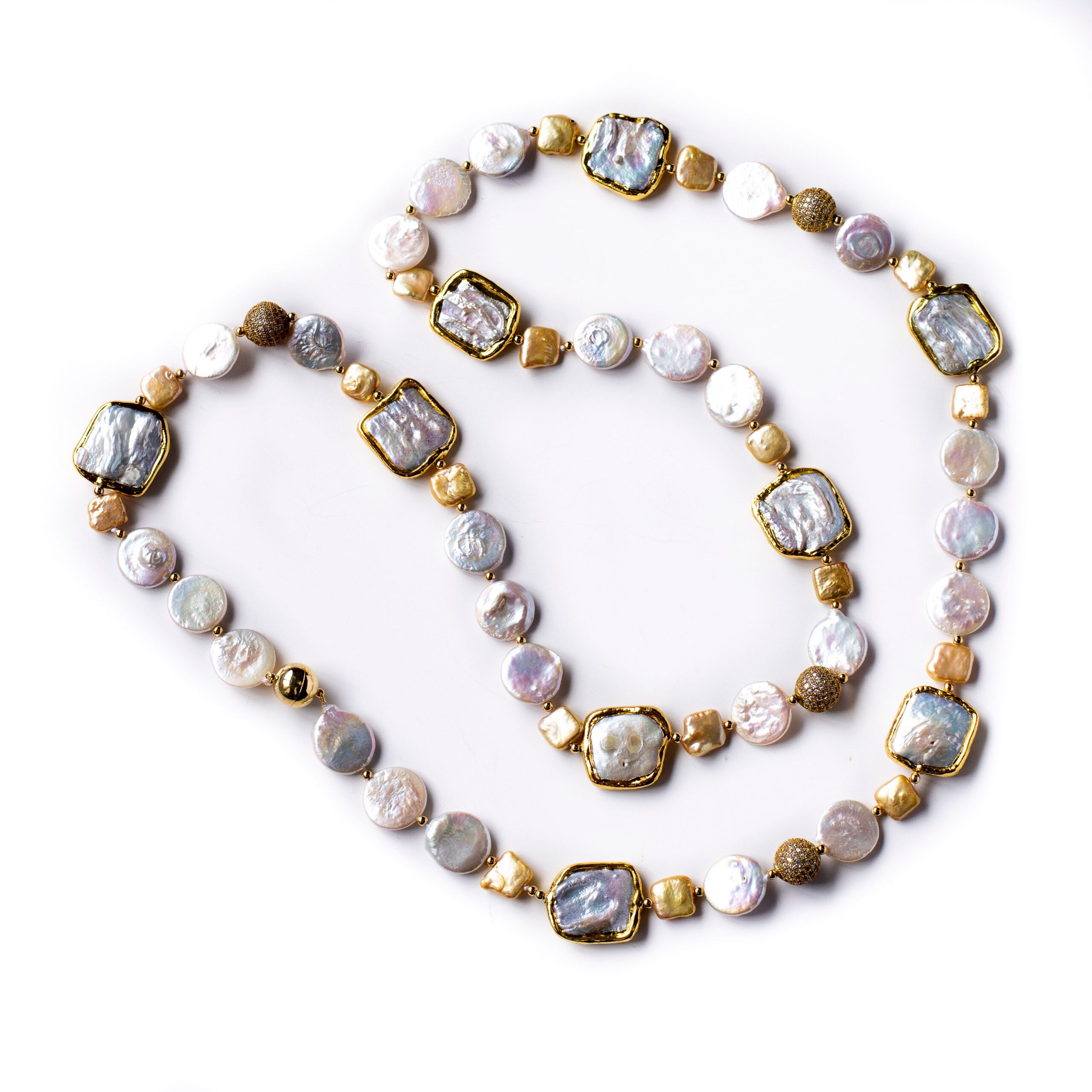 -Necklace is made with fine quality lustrous white and gold fresh water coin pearls                                                               -The necklace is hand knotted with gold square pearl and white fresh water coin pearls                                                                 -The pearls are strung with special hand made gold plated pearl square bed            -Length of the necklace is 40 inches