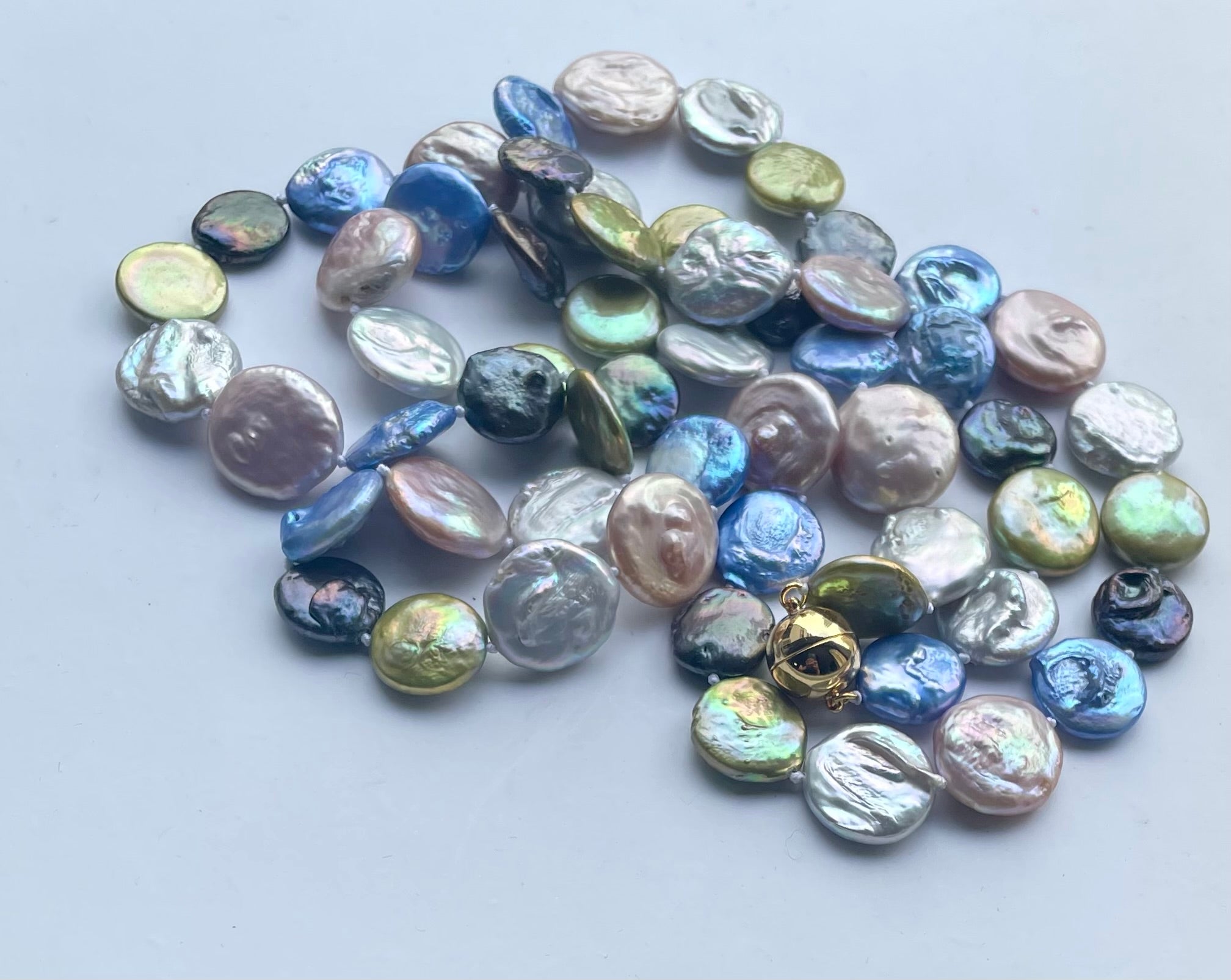 -Each pearl is knotted together and has a comfortable gold magnetic clasp