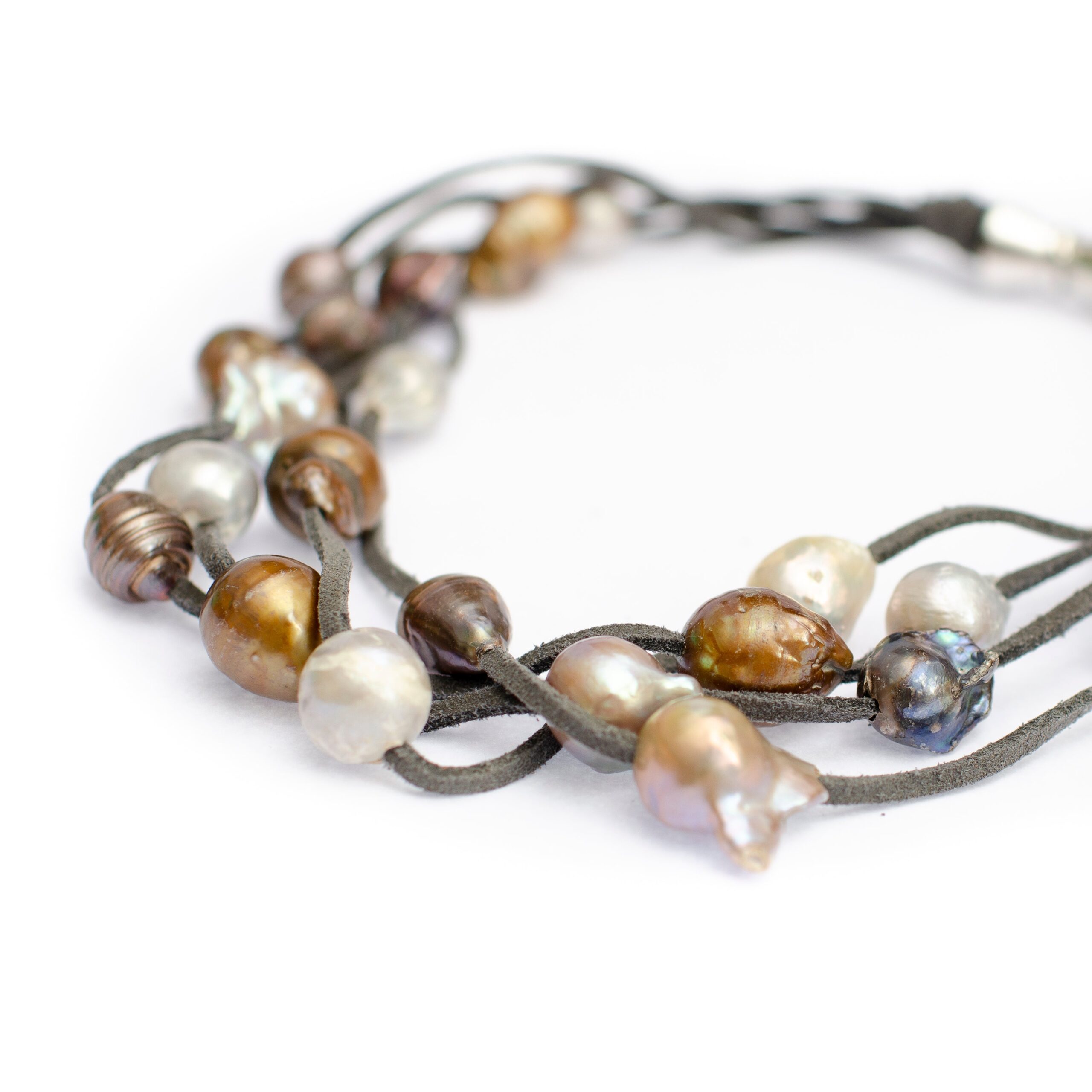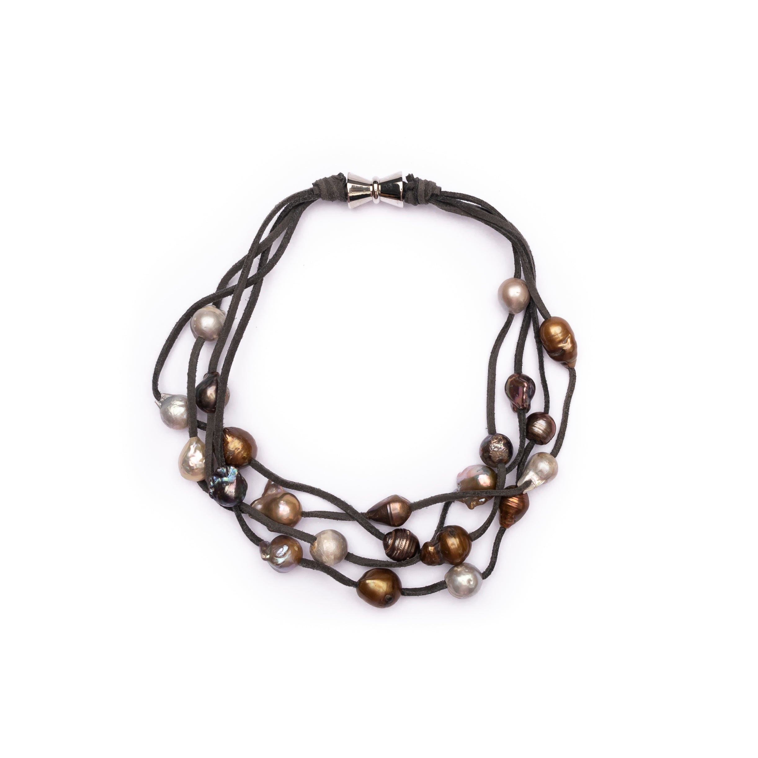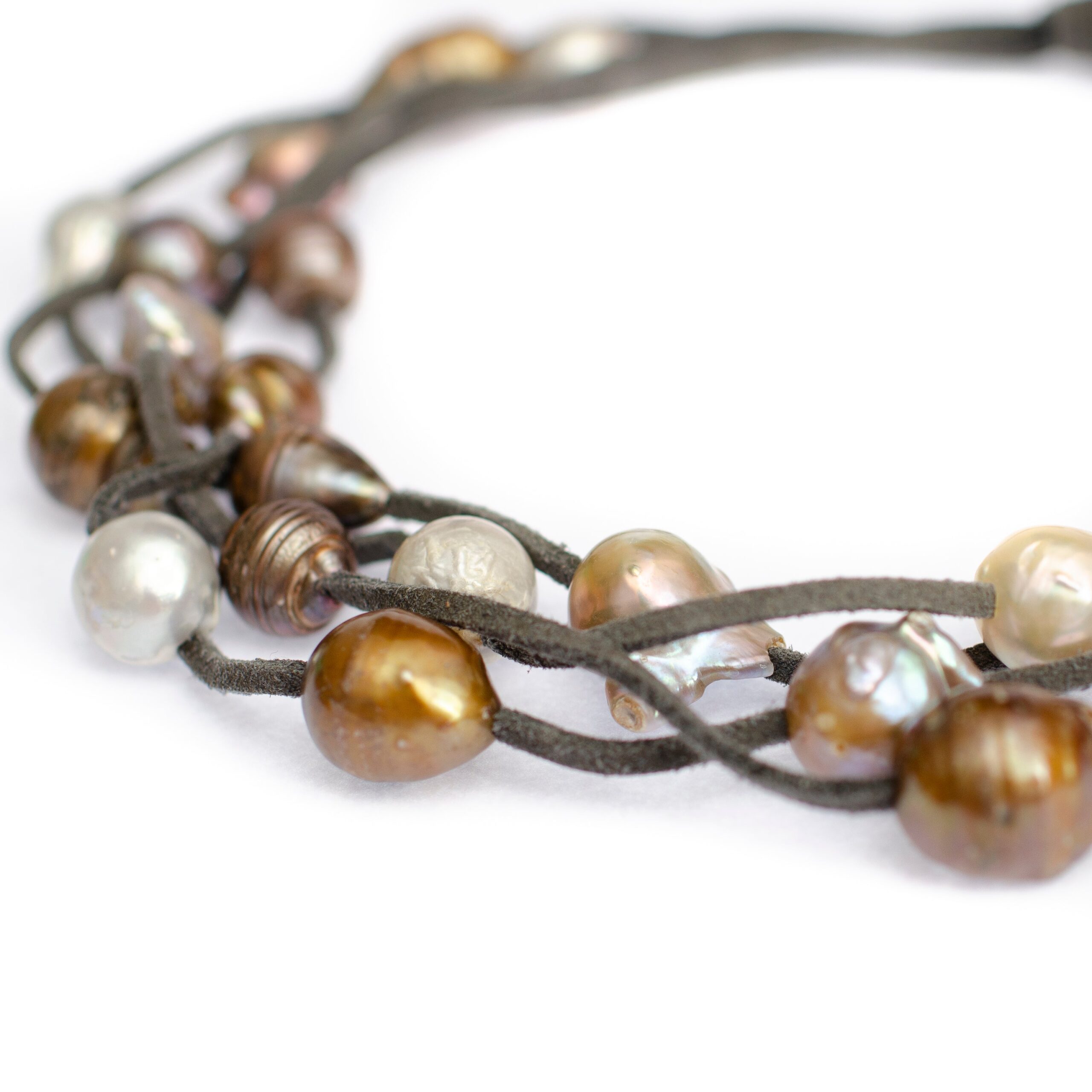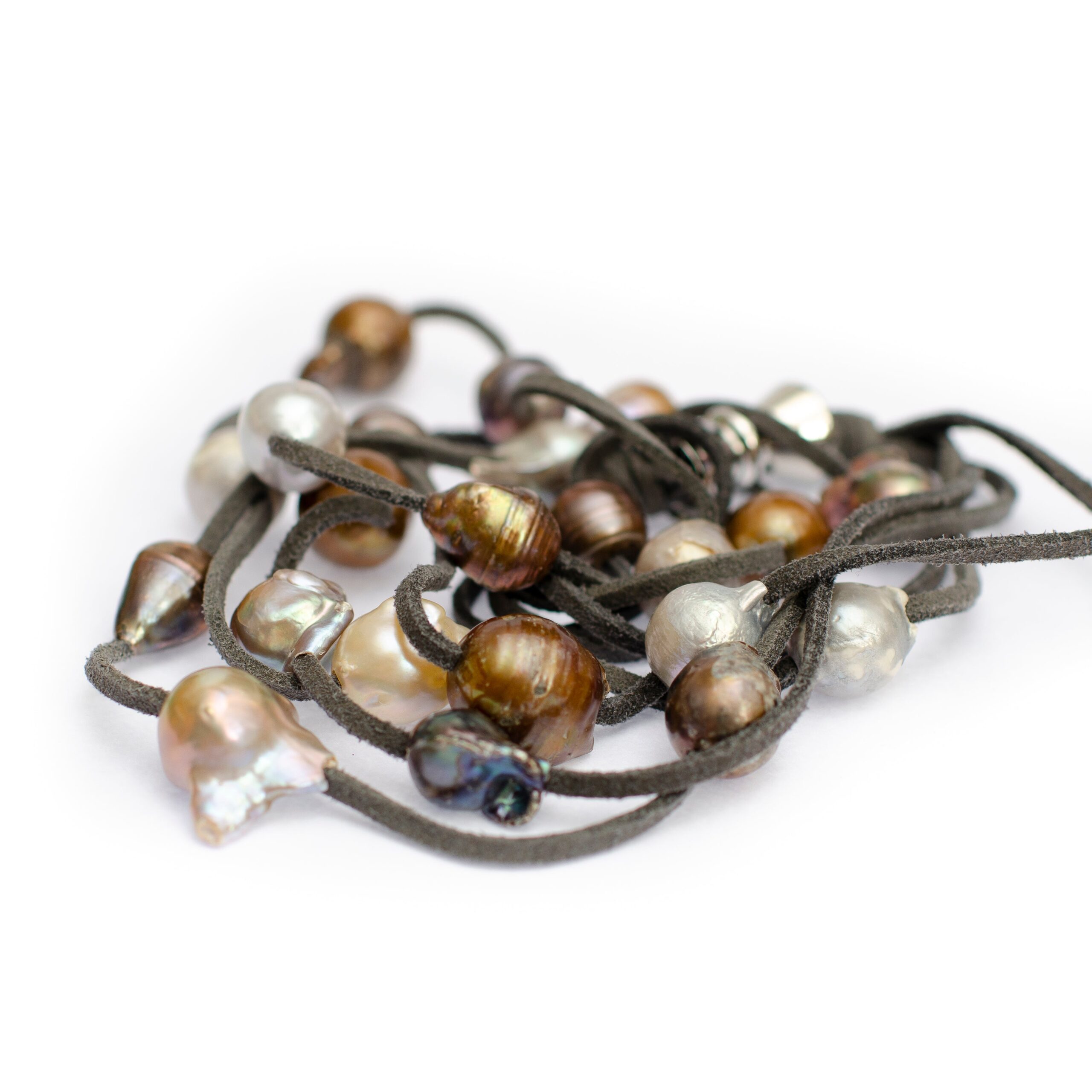 -Beautiful multi coloured baroque pearl necklace hand strung with brown suede