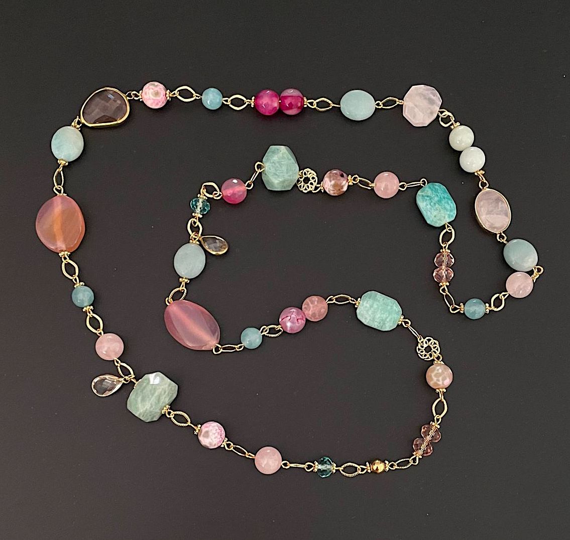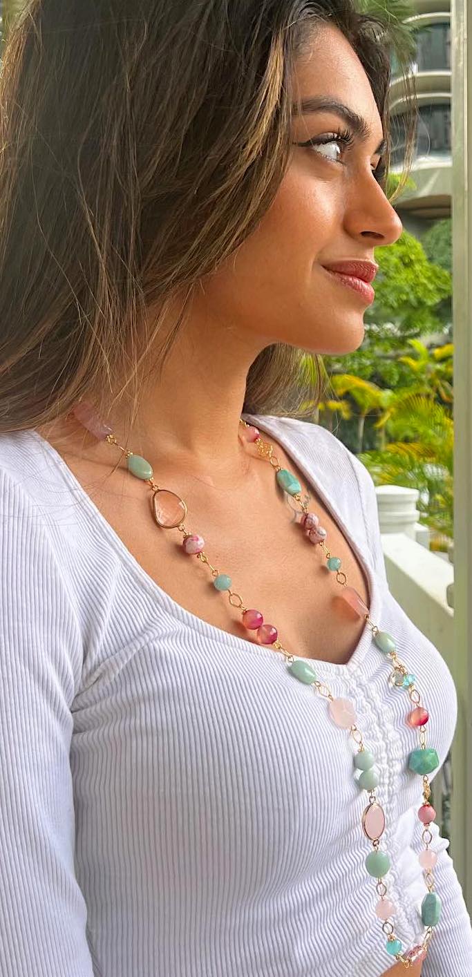 -Necklace is made with beautiful multi stones including agate, pink quartz, turquoise  and jade                                                                      -The necklace is strung on 18K gold plated chain                                                             -Length of the necklace is 40 inchesÂ