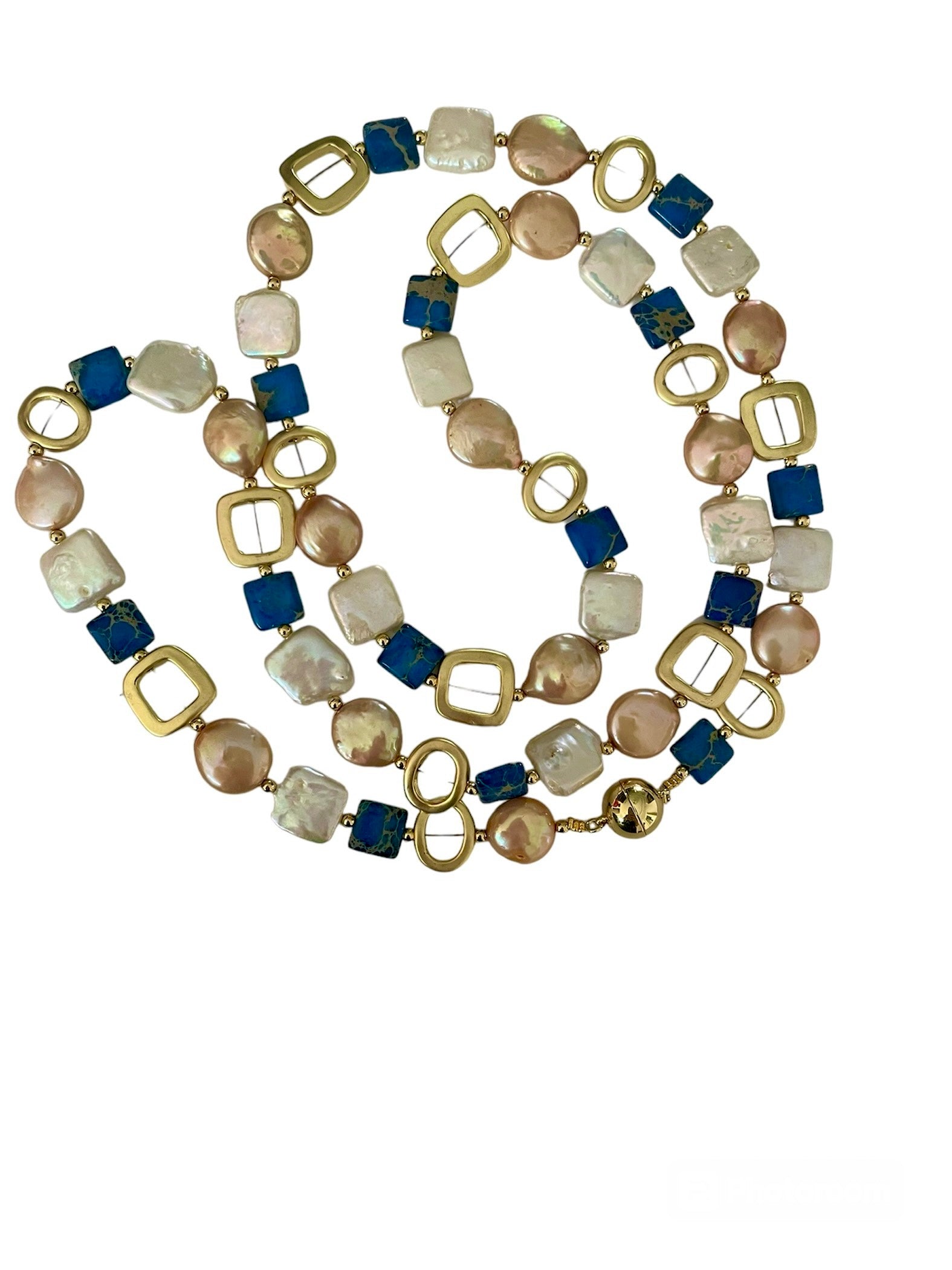 -Necklace is made with fresh water coin pearls and lapisÂ