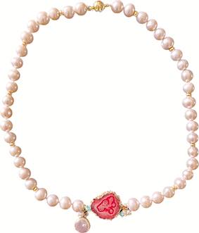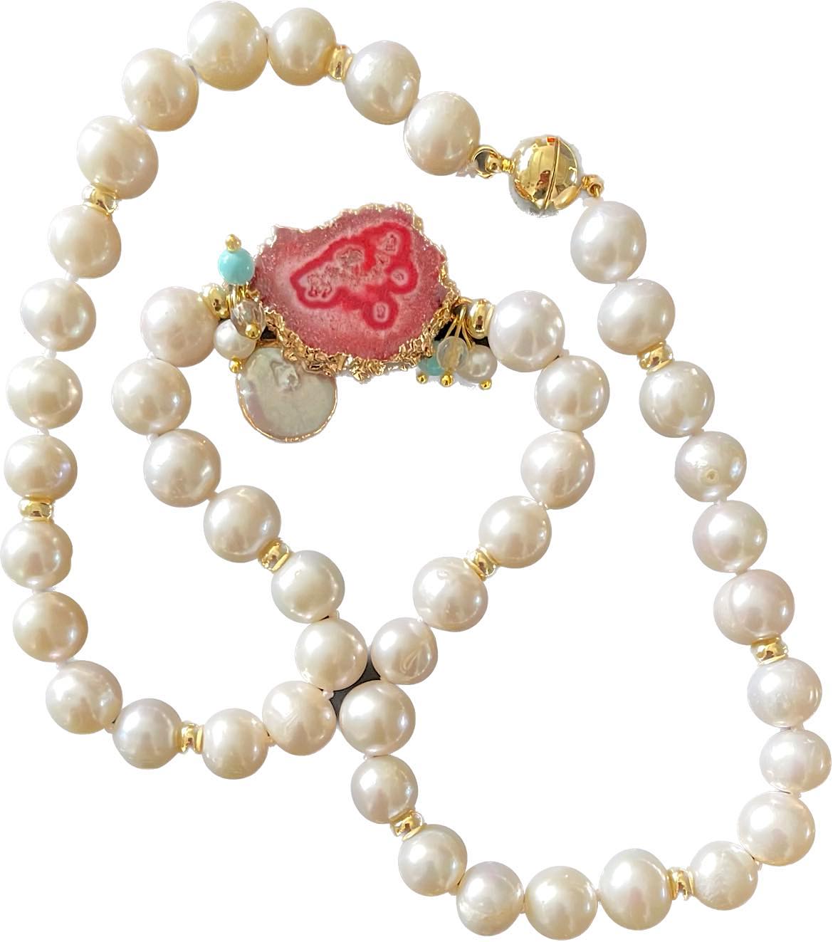-Beautiful white fresh water pearls necklace with peach shaded agate stone.           – The necklace has delicate pearl charms attached with the agate stone