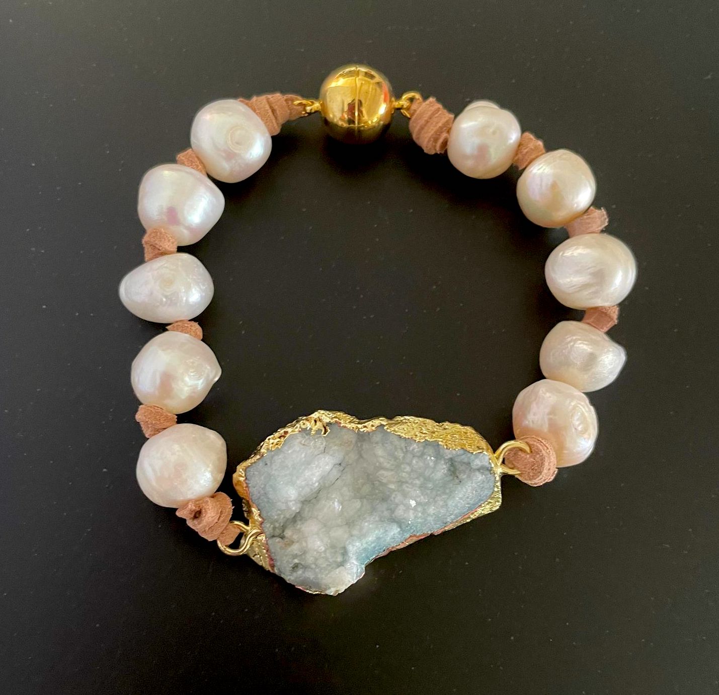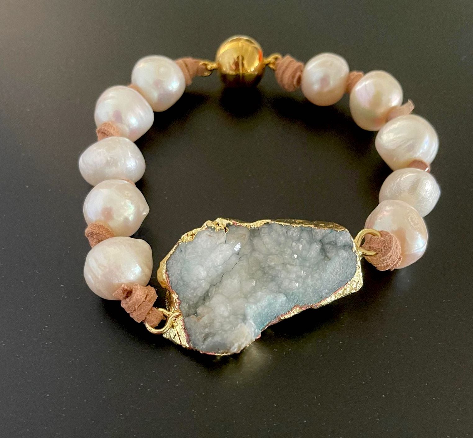 -The pearls are hand knotted with beige suede and has a striking chunky druzy stone  – The length of the bracelet is around 7.5″ and has a comfortable magnetic clasp