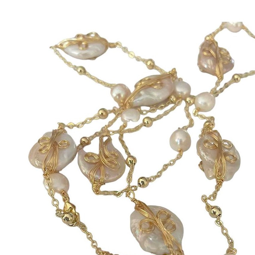 -Necklace is made with fine quality fresh water white pearls with gold wire scroll