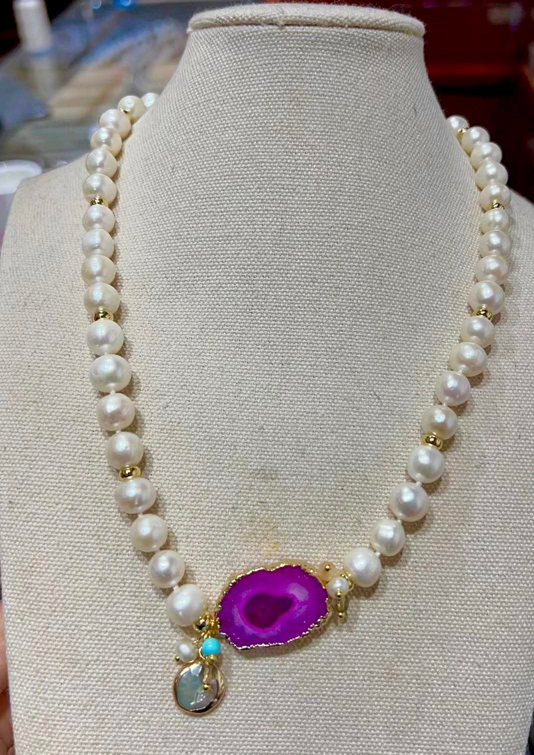 -Beautiful white fresh water pearls necklace with pink agate stone.                     – The necklace has delicate pearl charms attached with the agate stone