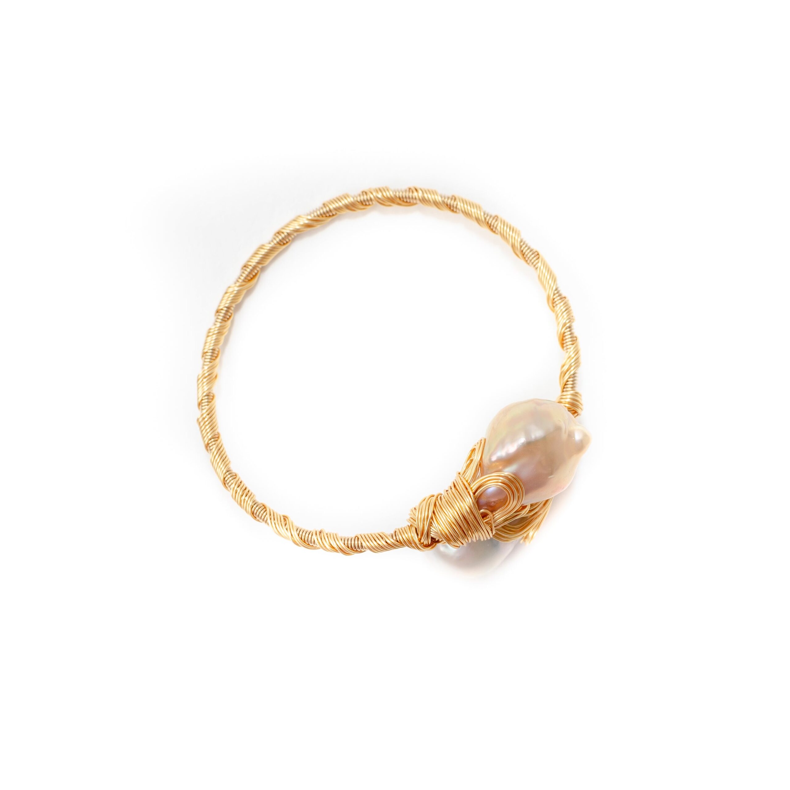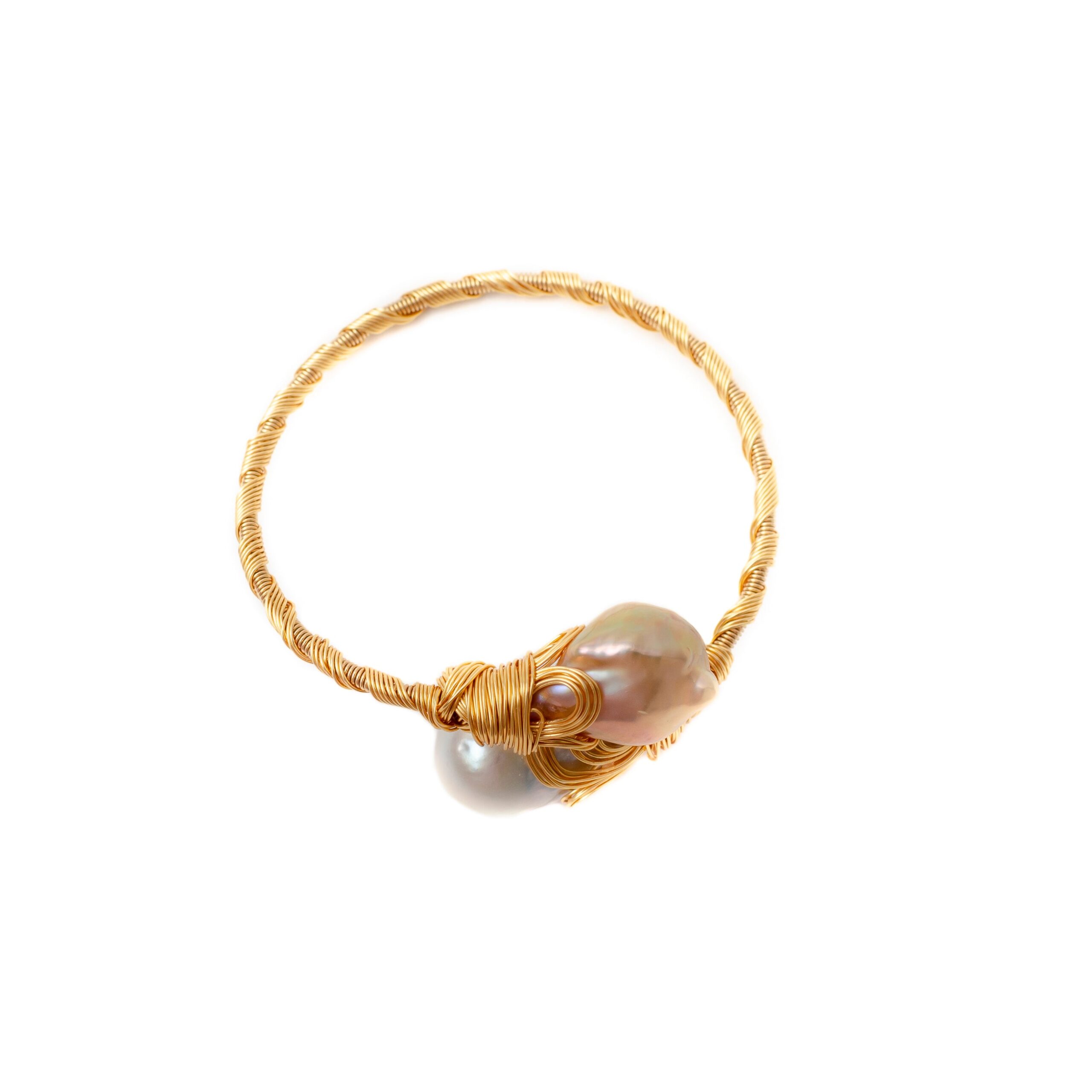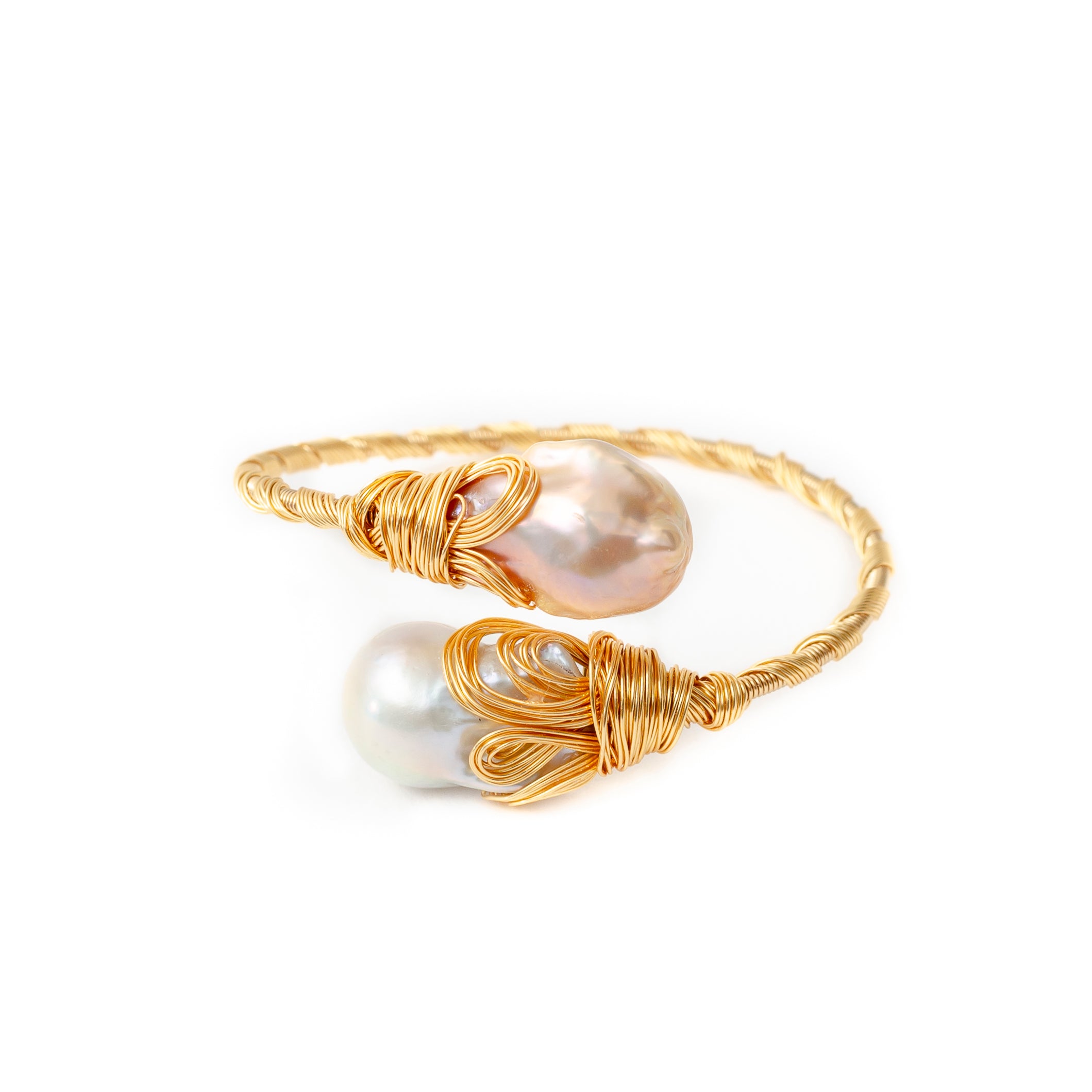 -Intricate pink and white baroque pearl with hand made gold wire wrap braceletÂ