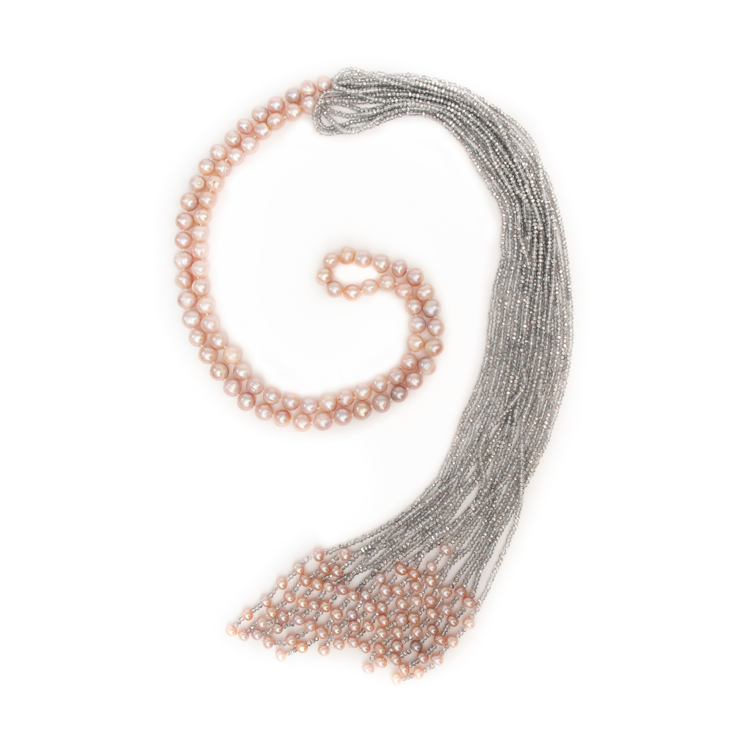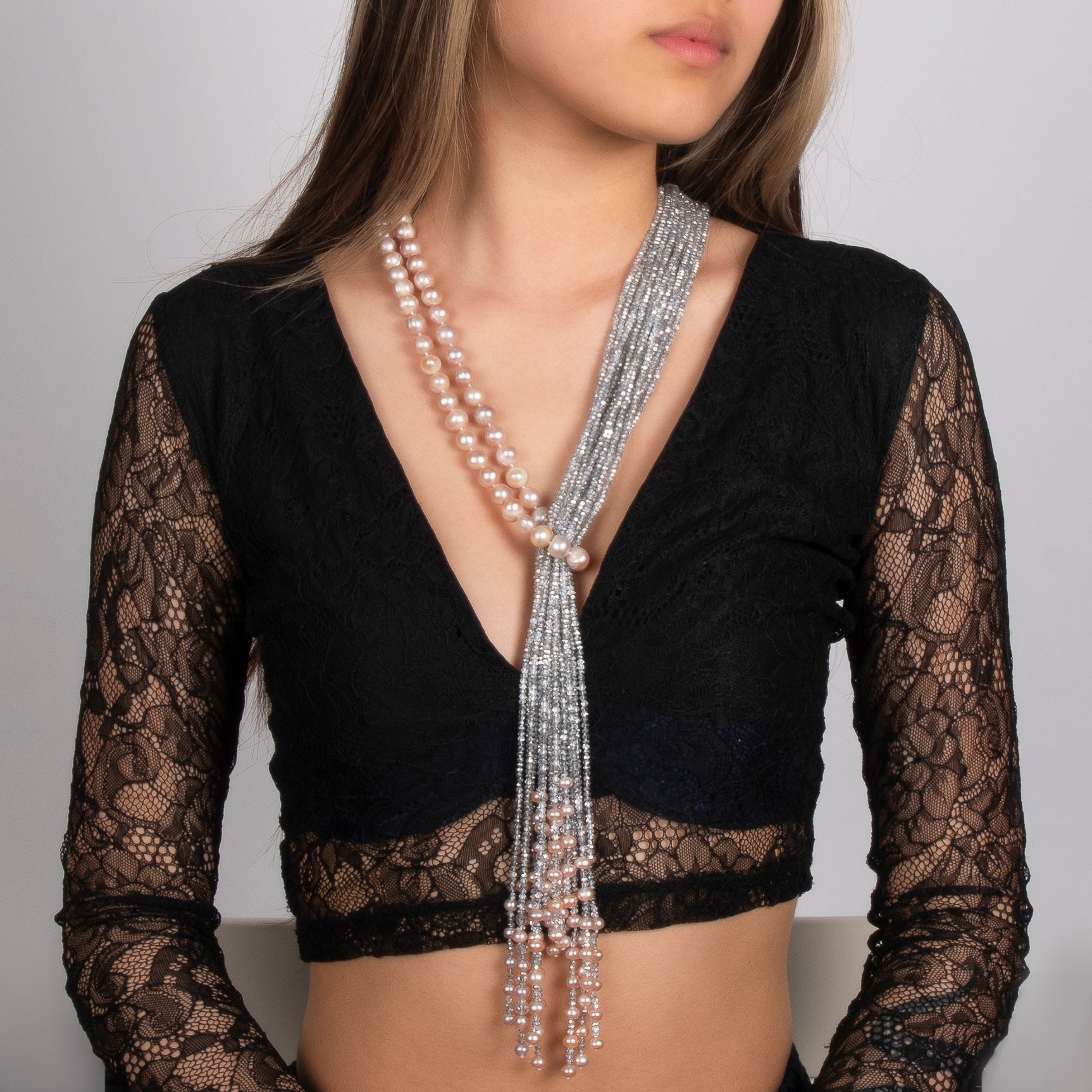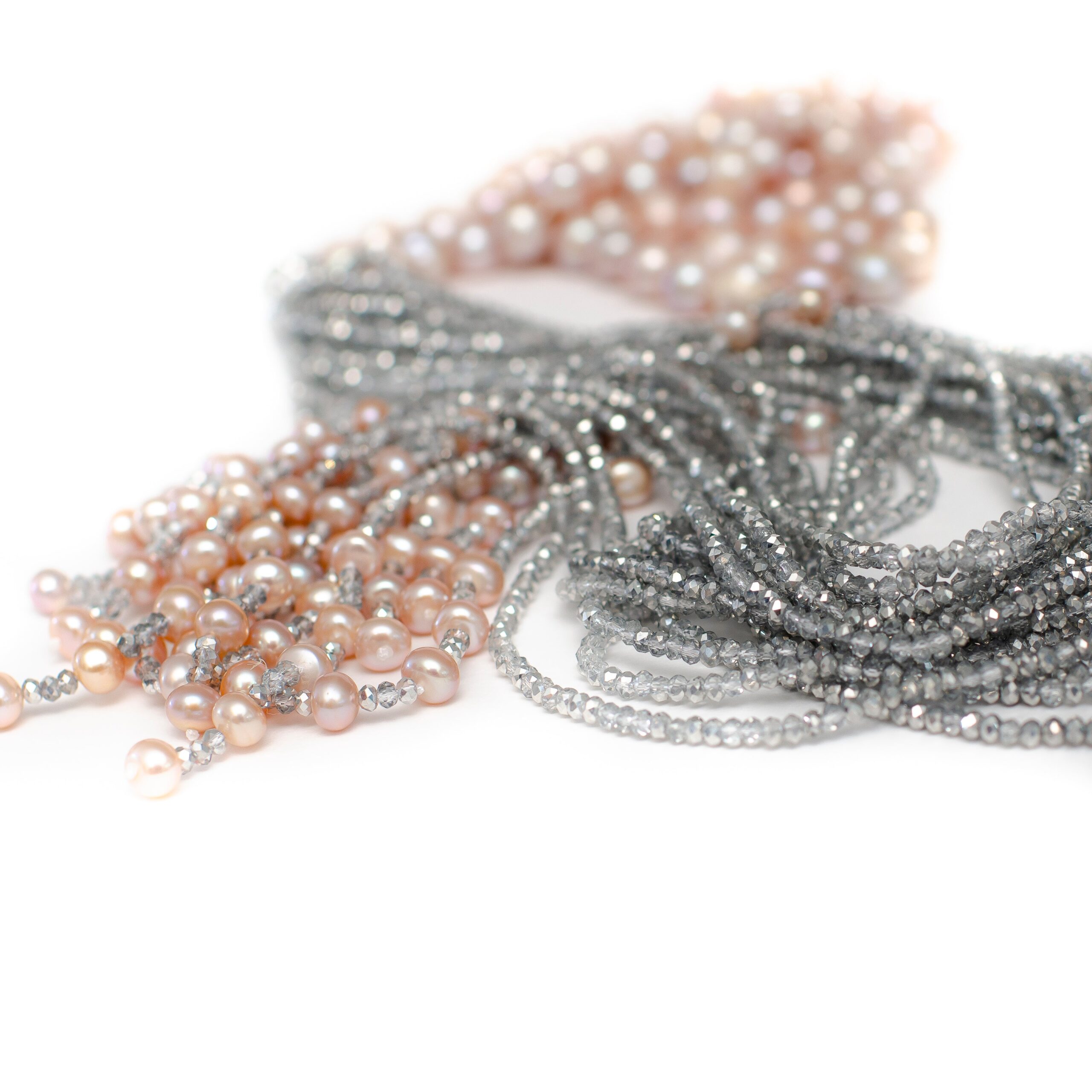 -Necklace is made with fine quality pink fresh water pearls and shimmery silver crystals                                                                   -The pearls are hand knotted with the crystals