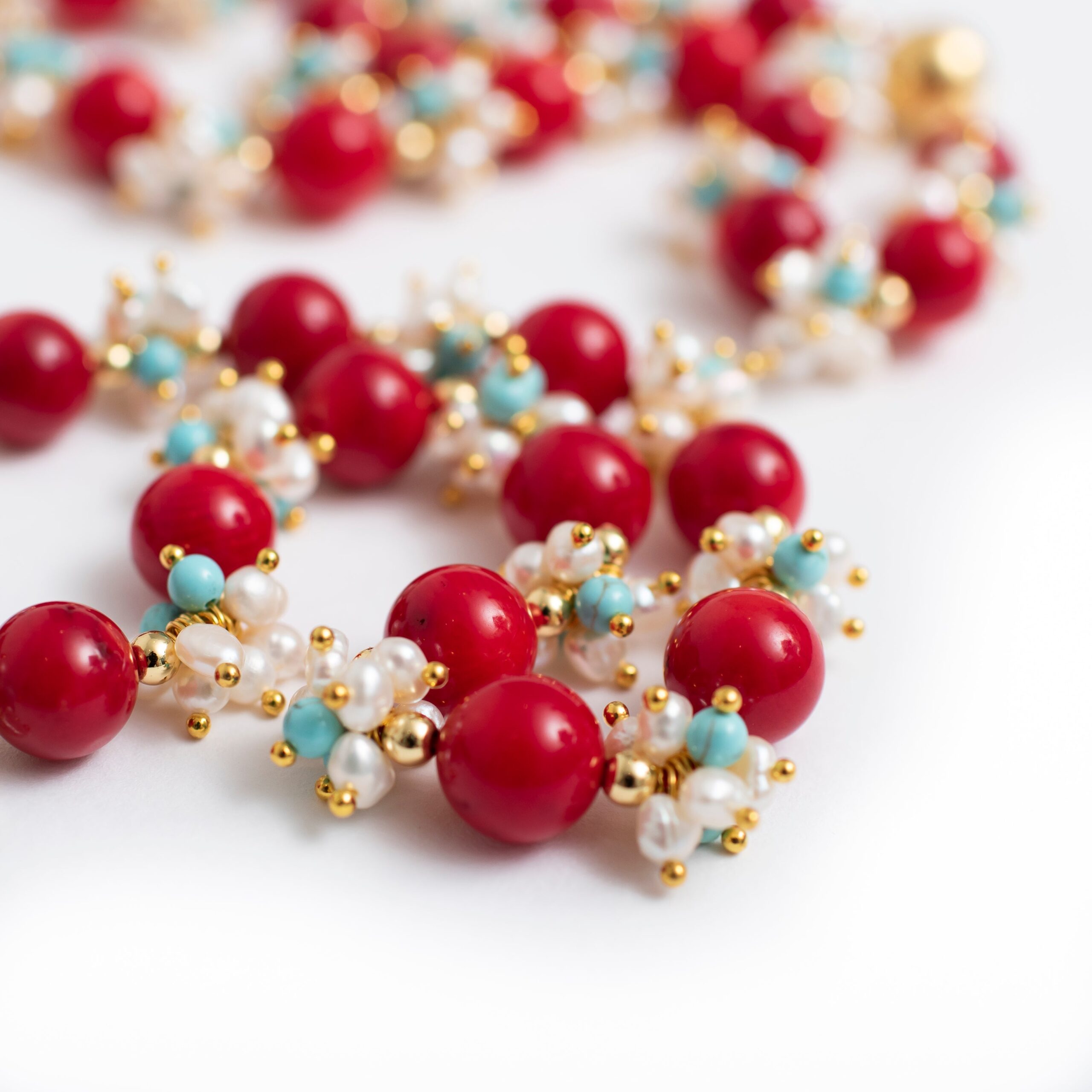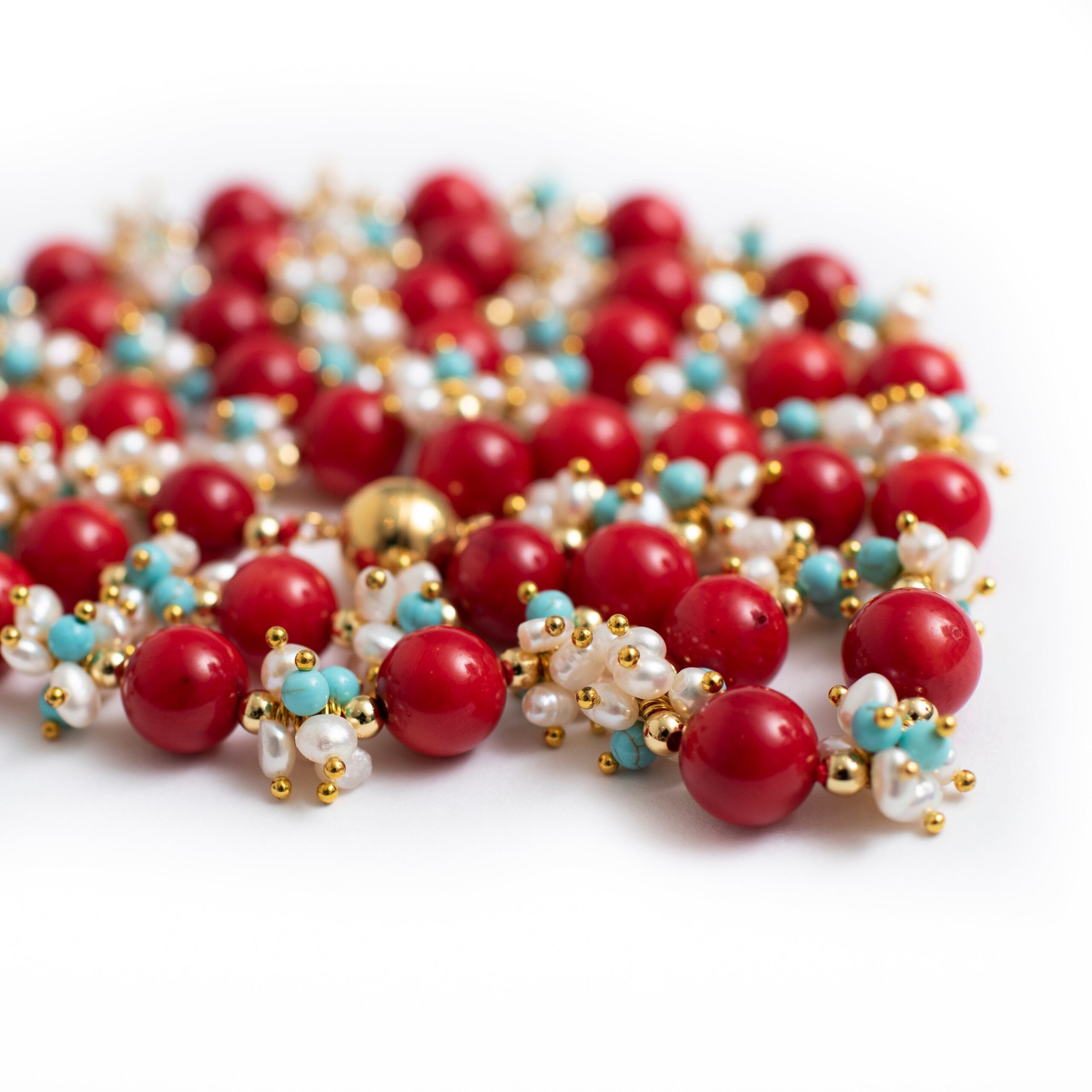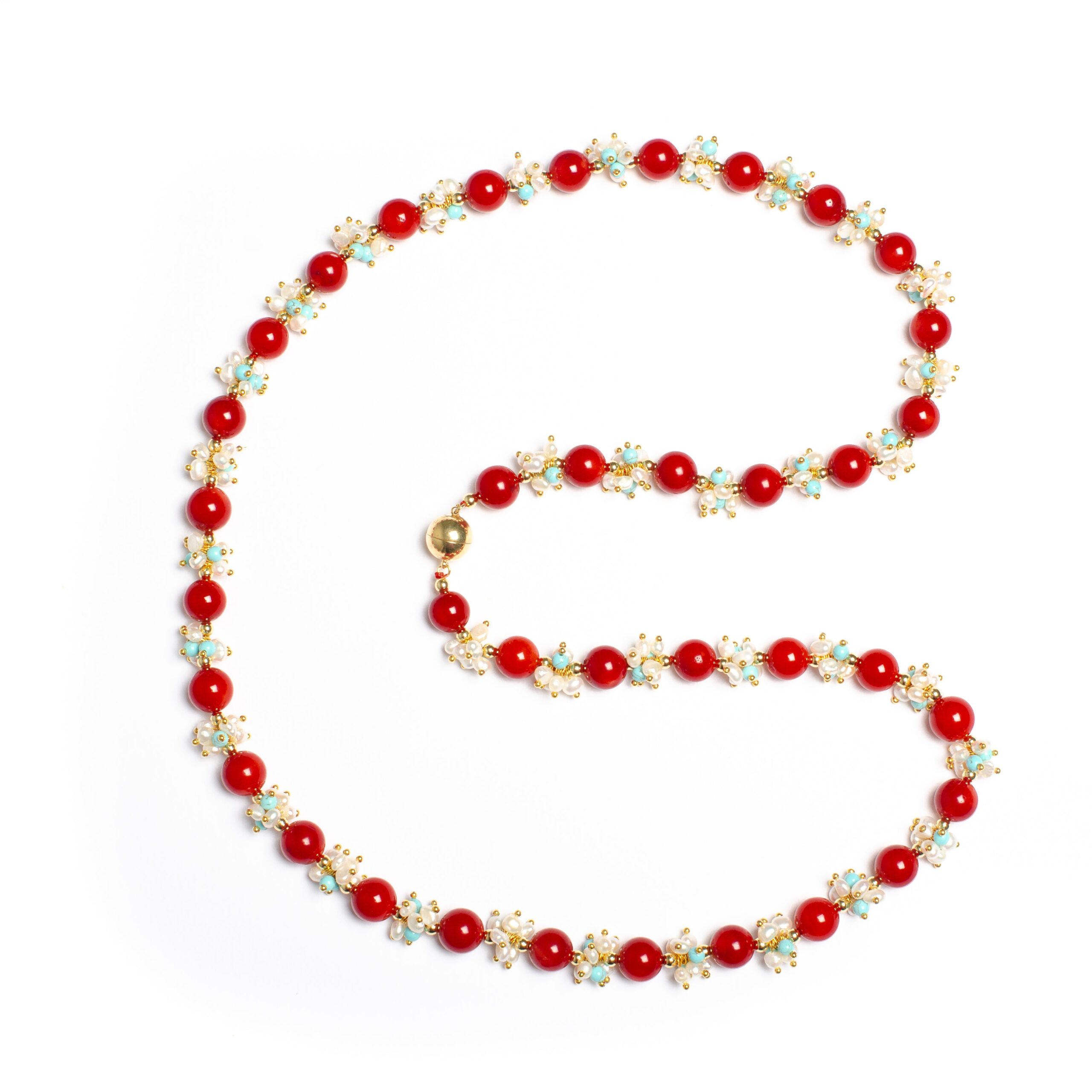 -Necklace is made with beautiful red coral, turquoise and white fresh water pearls