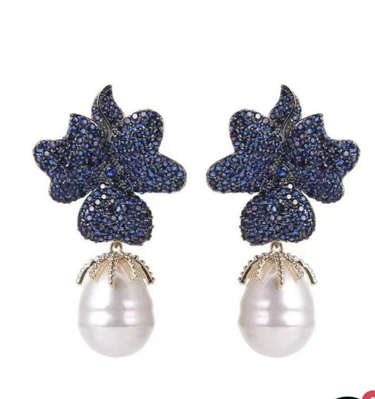 -Classic cultured pearl earrings with floral top set with cultured blue sapphire