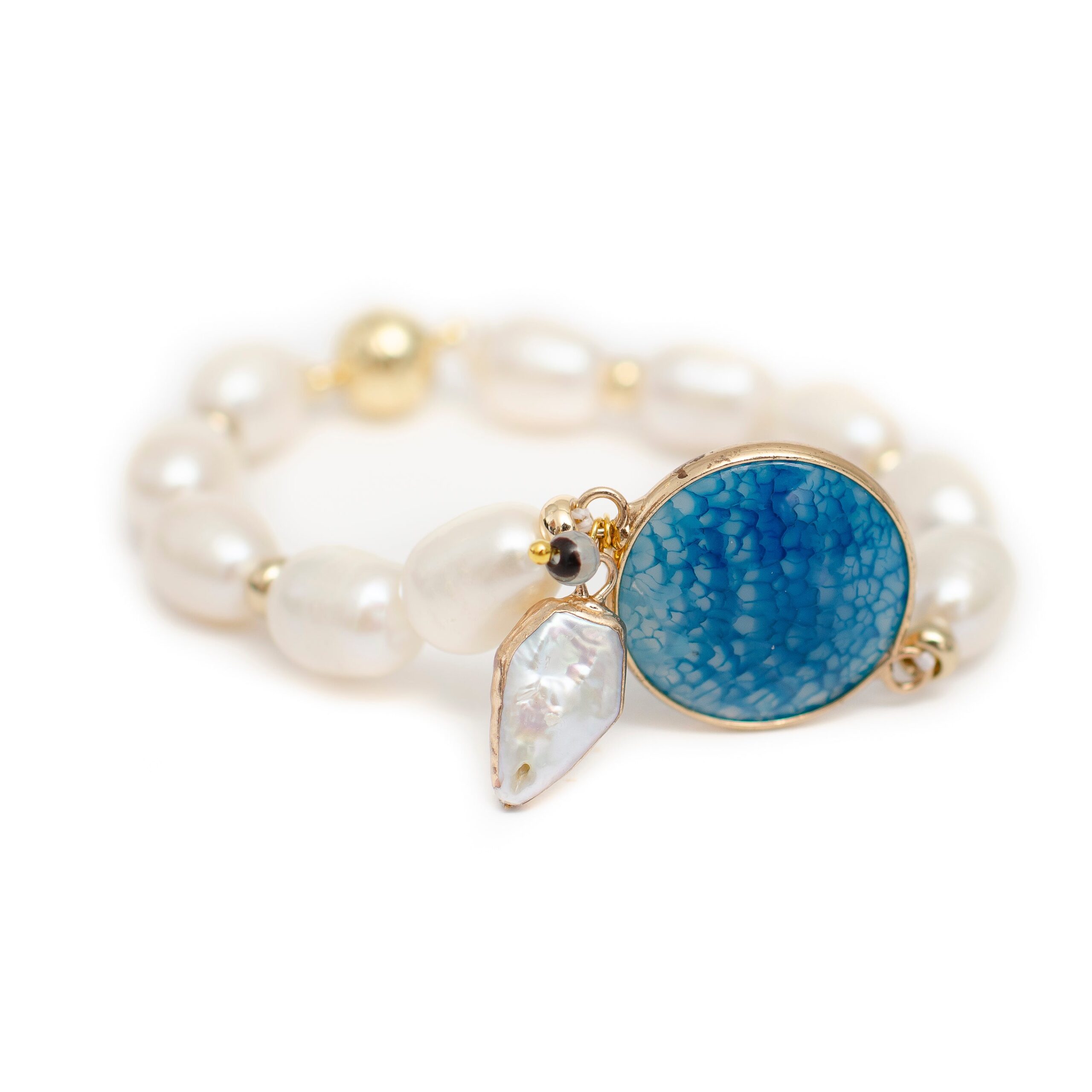 -Beautiful white fresh water pearls bracelet set with dark blue agate and pearl charms hanging