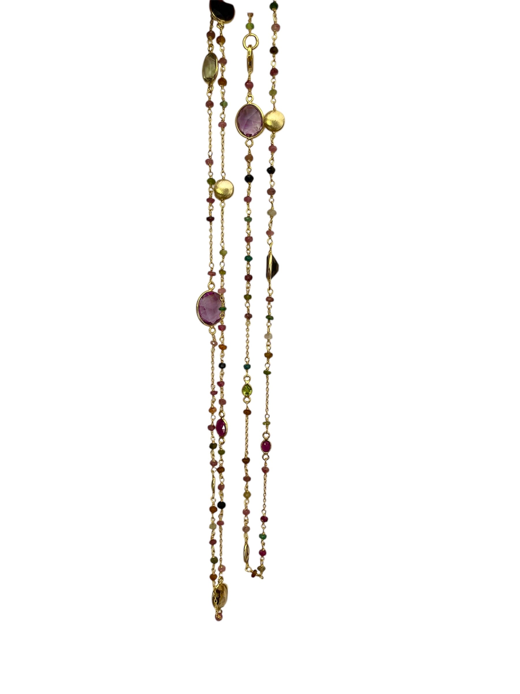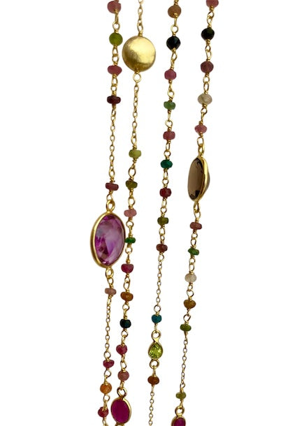-Mix Faceted Gemstones include Amethyst, Citrine, Lemon Quartz, Peridot, Rose Quartz, and Smoky Quartz                                                    – Chain used is Gold Plated on Sterling Silver                                                     -Length of the necklace is 38 inches