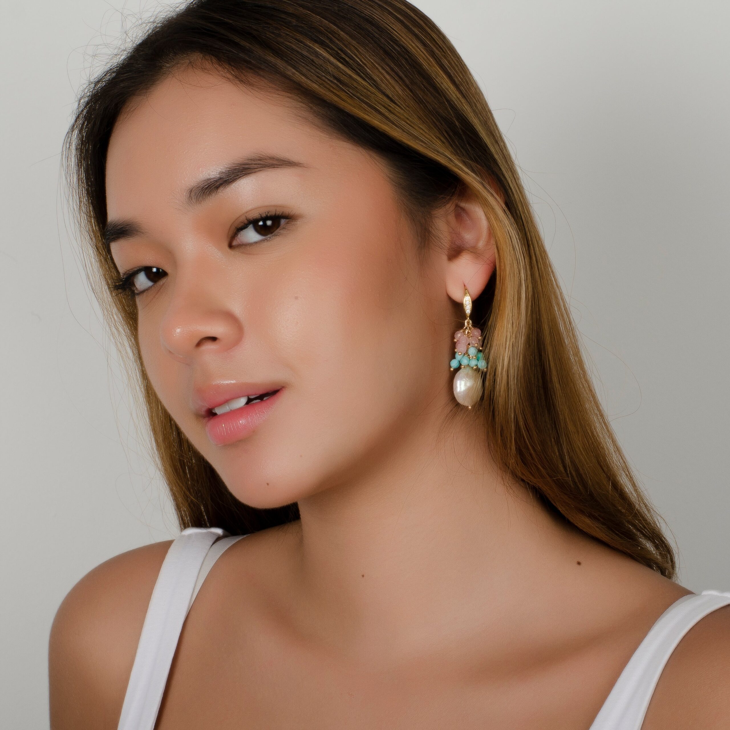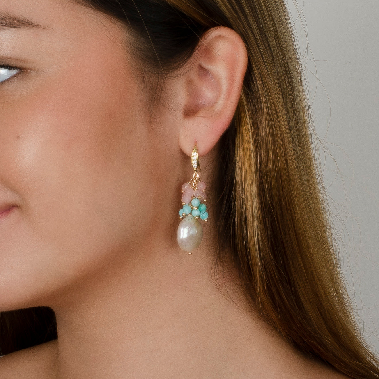 -Beautiful white coin pearl earrings with pink and blue tourmaline cluster