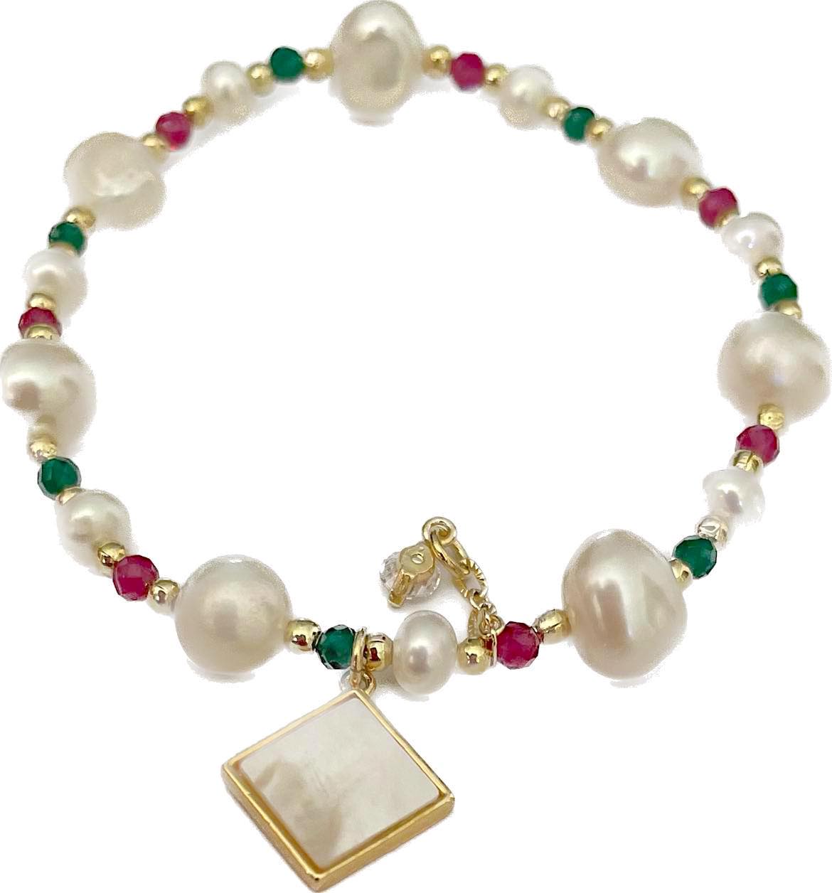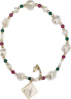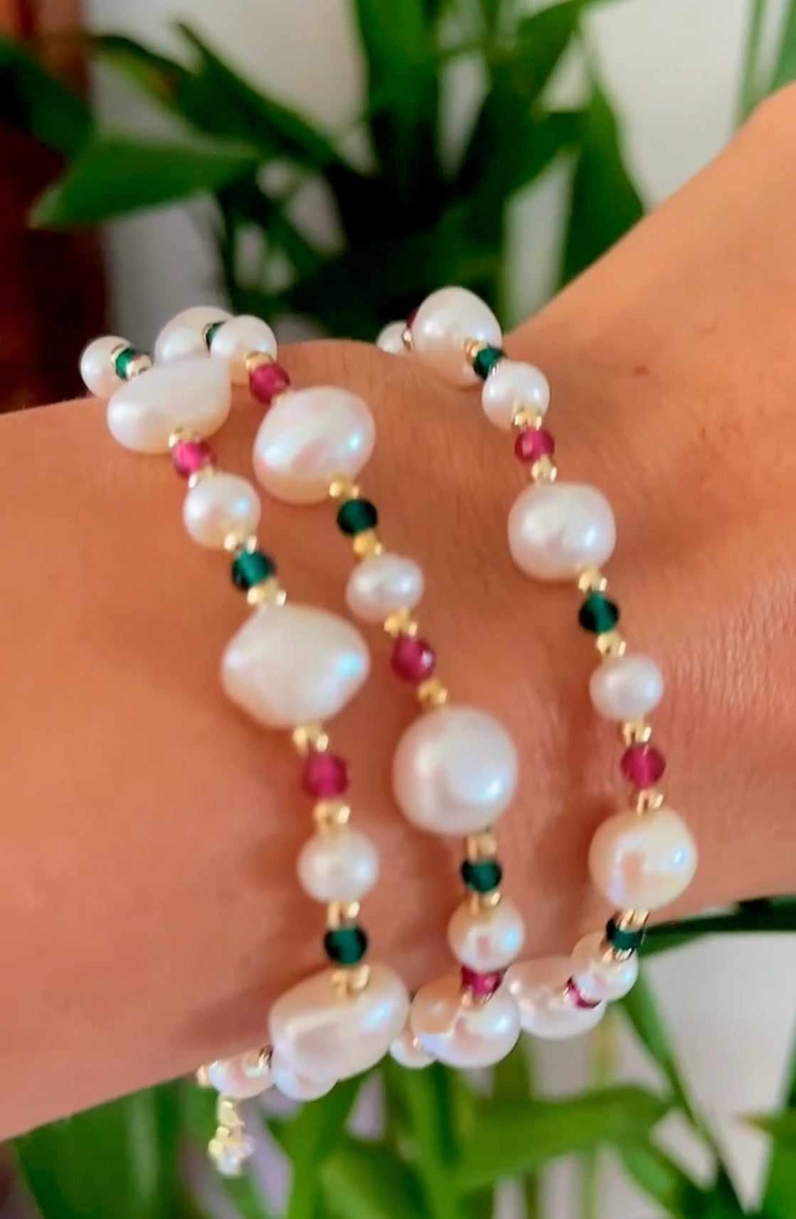 -Beautiful white fresh water pearl bracelet with tourmaline in 18K gold plated chain