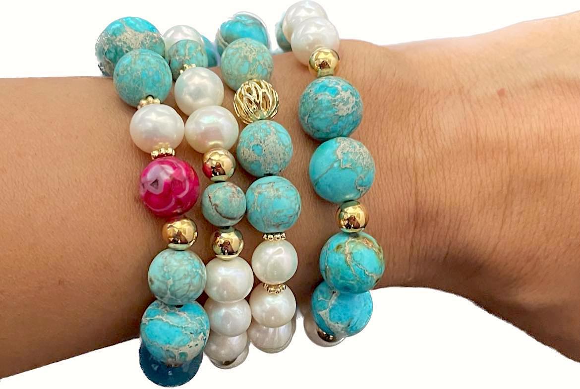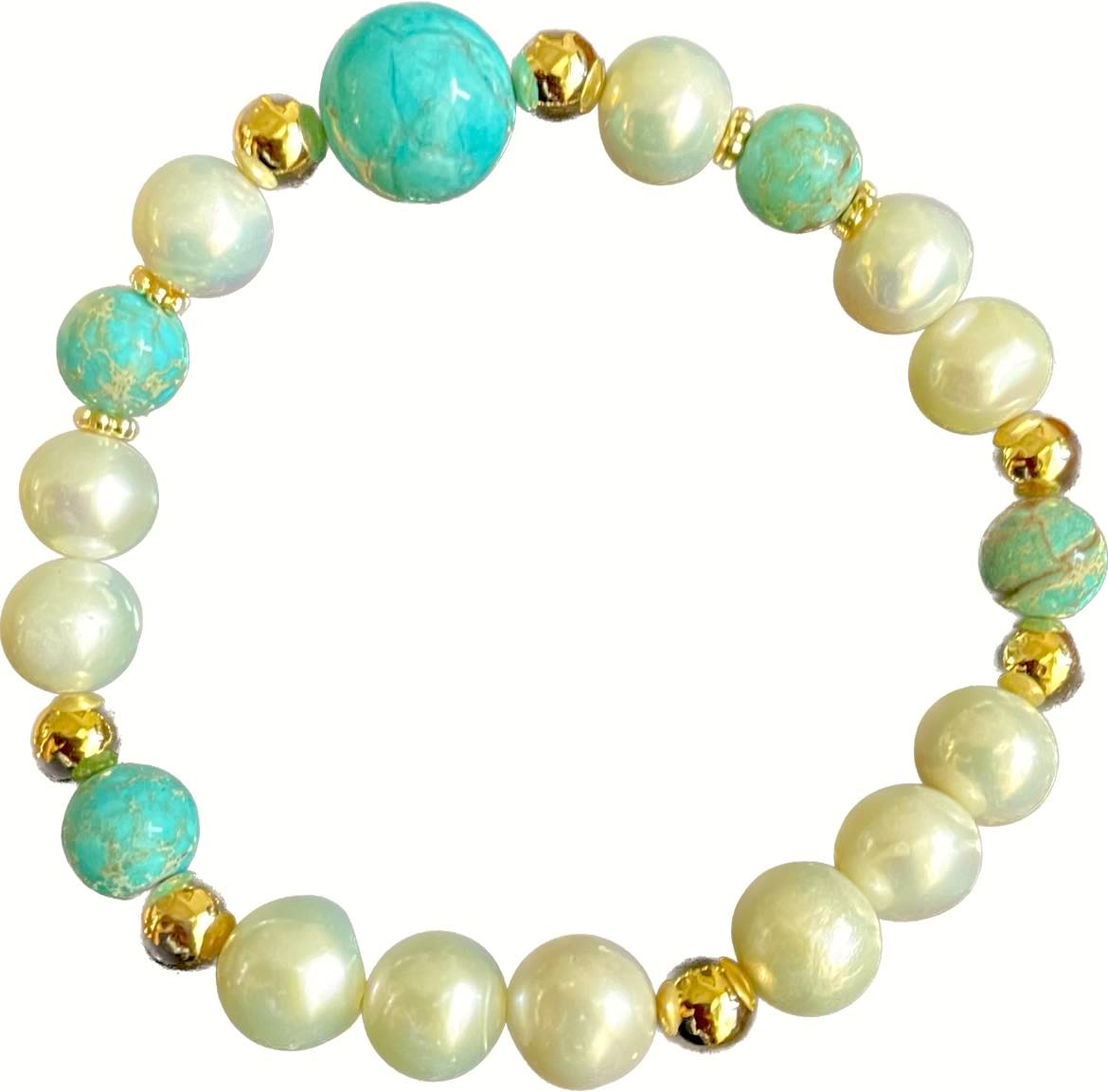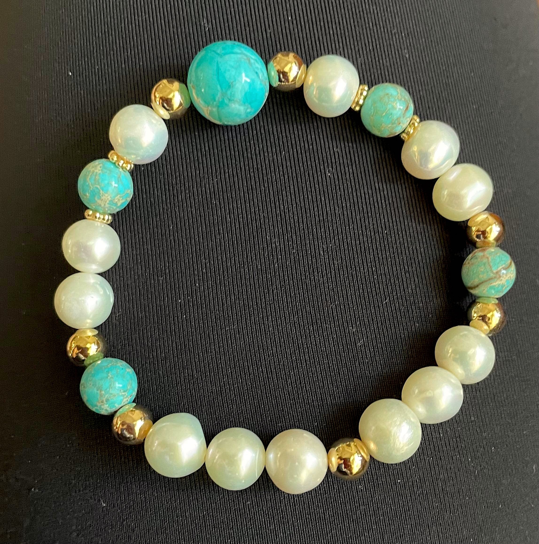 -Classic  white fresh water pearls,Agate and turquoise bracelet