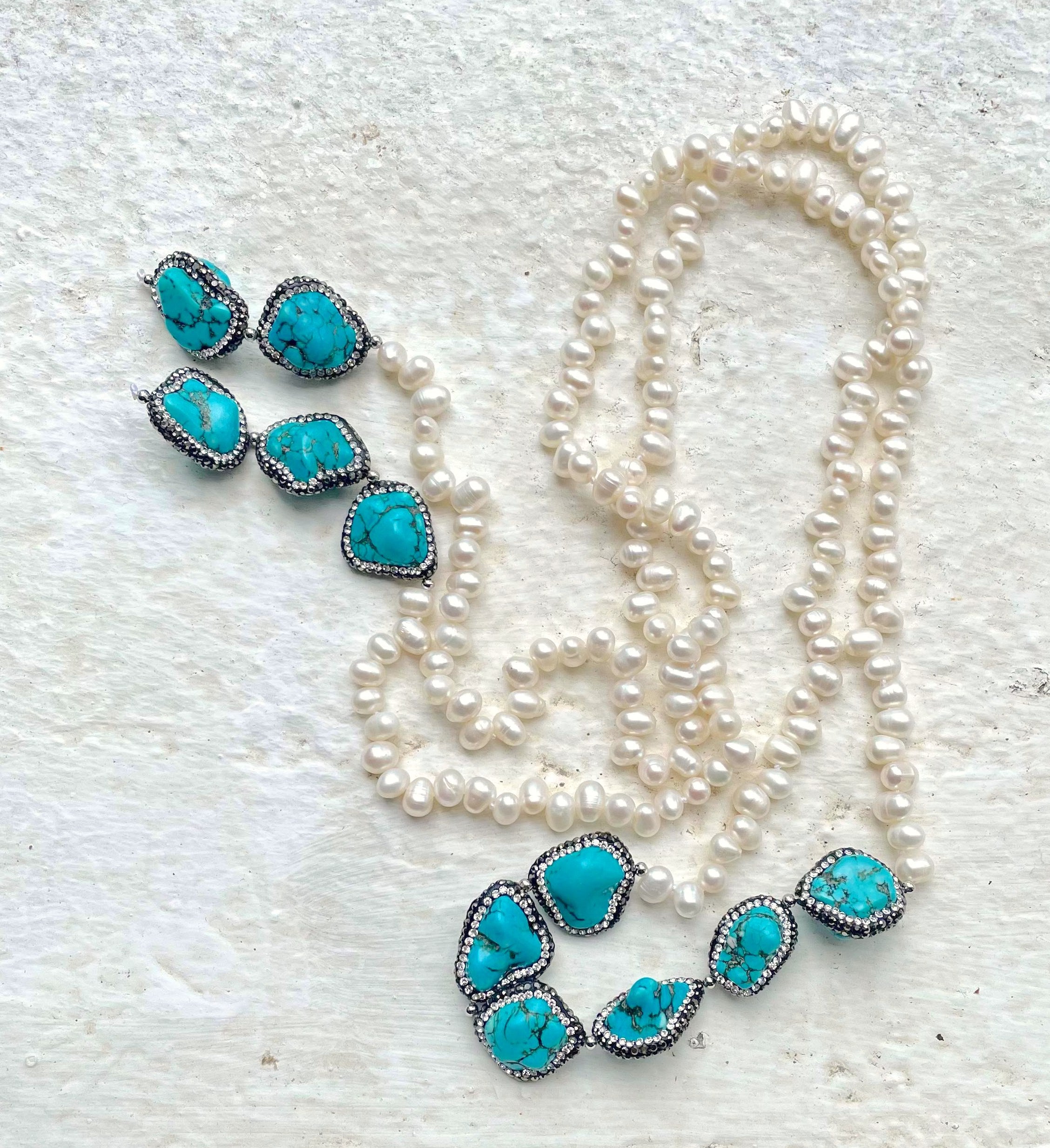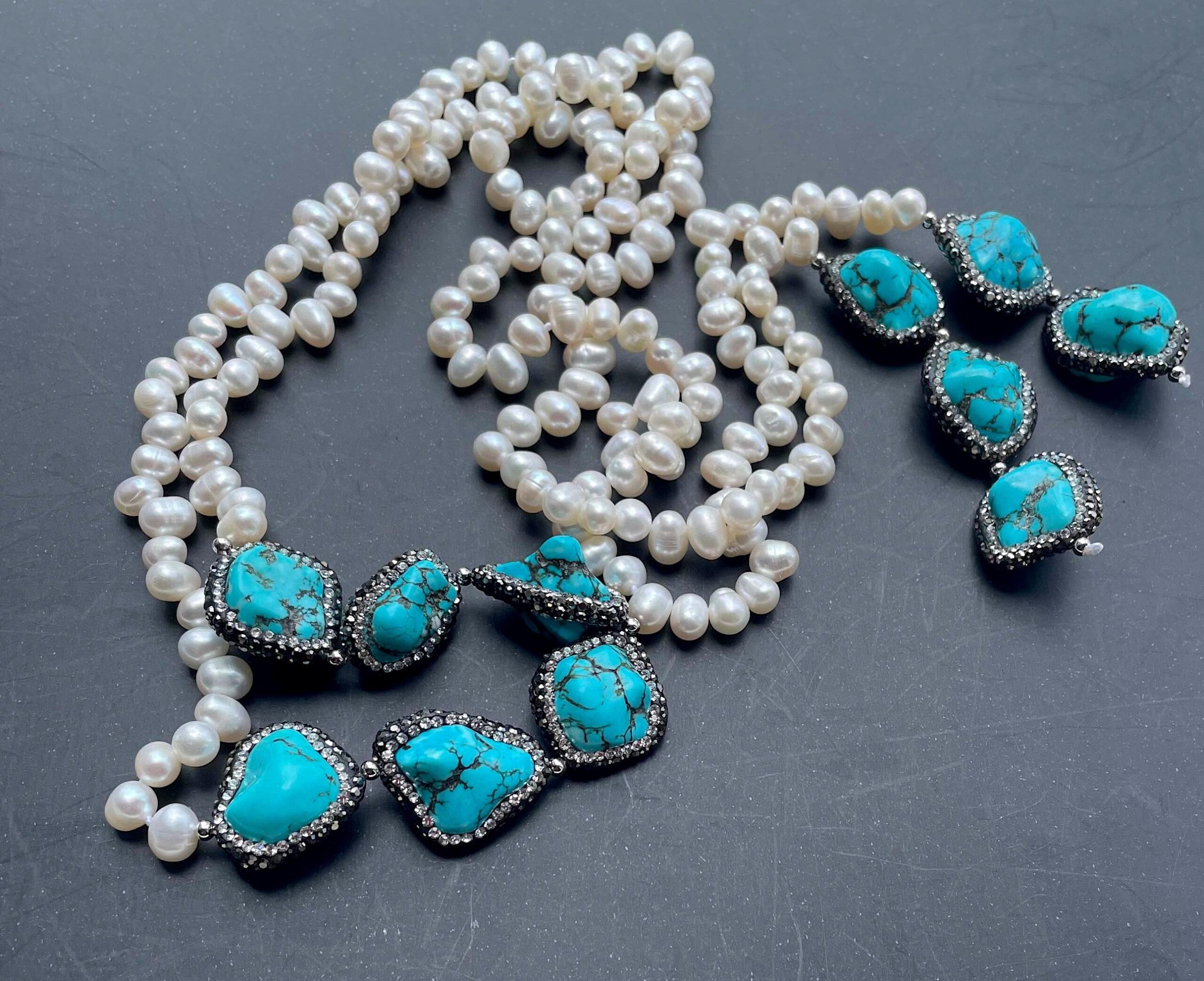-Necklace is made with fine quality white fresh water pearls and chunky turquoise                 -The pearls are hand knotted with the turquoise thats outlined with shimmery crystals