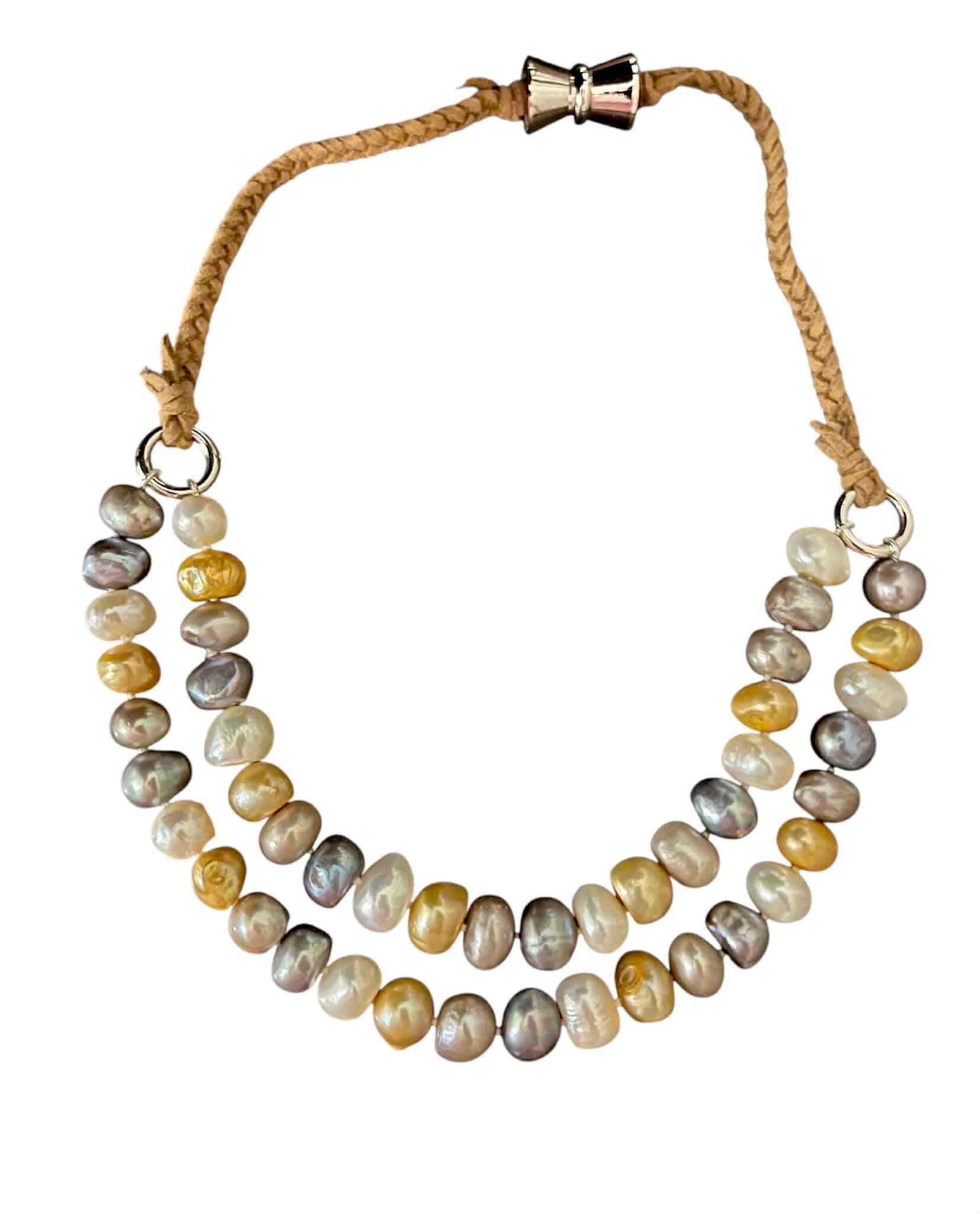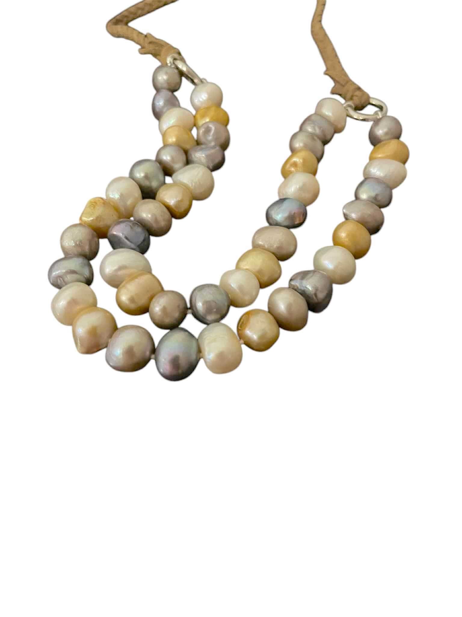 -Beautiful multi coloured pearl necklace hand strung with braided brown suedeÂ