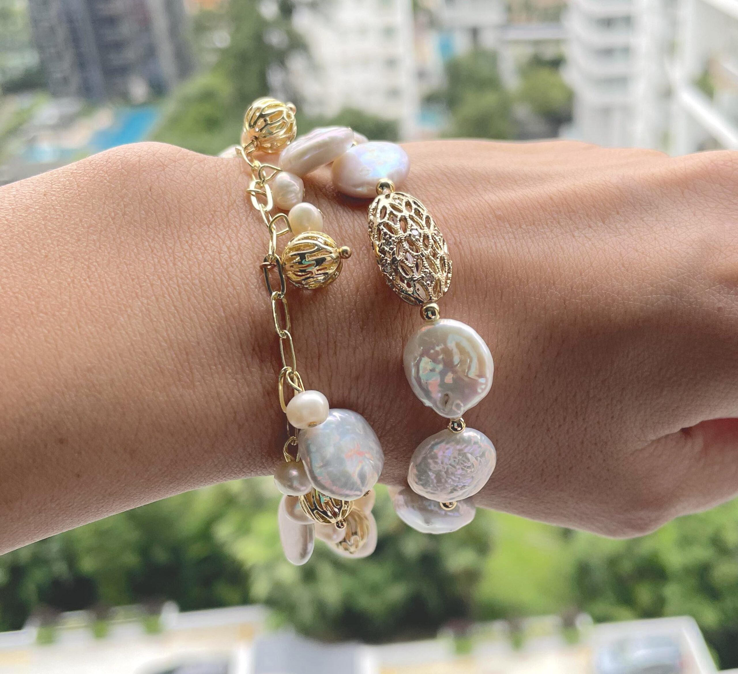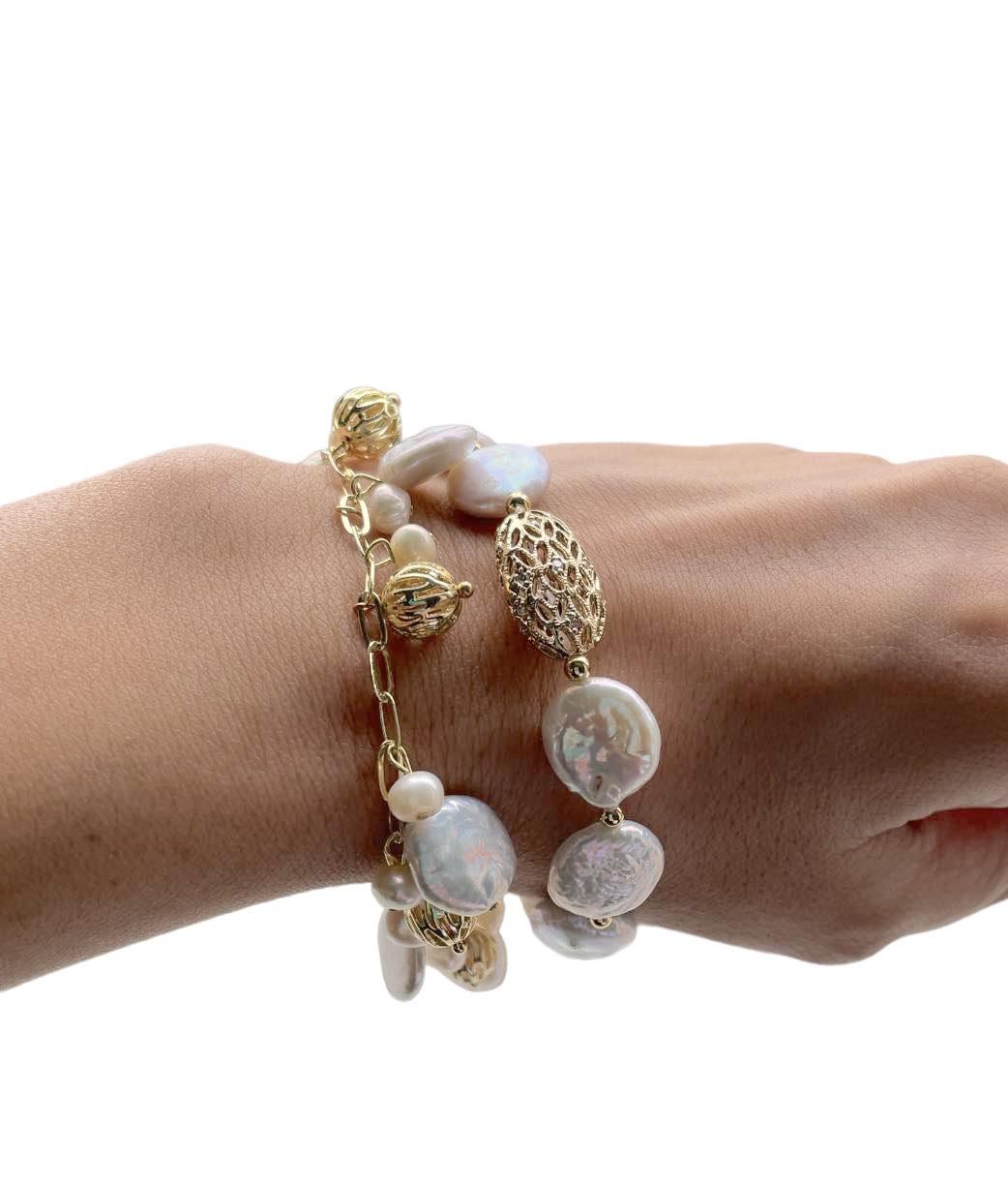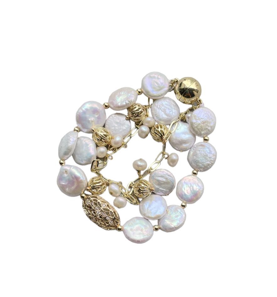 -Beautiful two tier white pearl bracelet with a mix of coin pearls and small fresh water pearls strung with gold filigree balls
