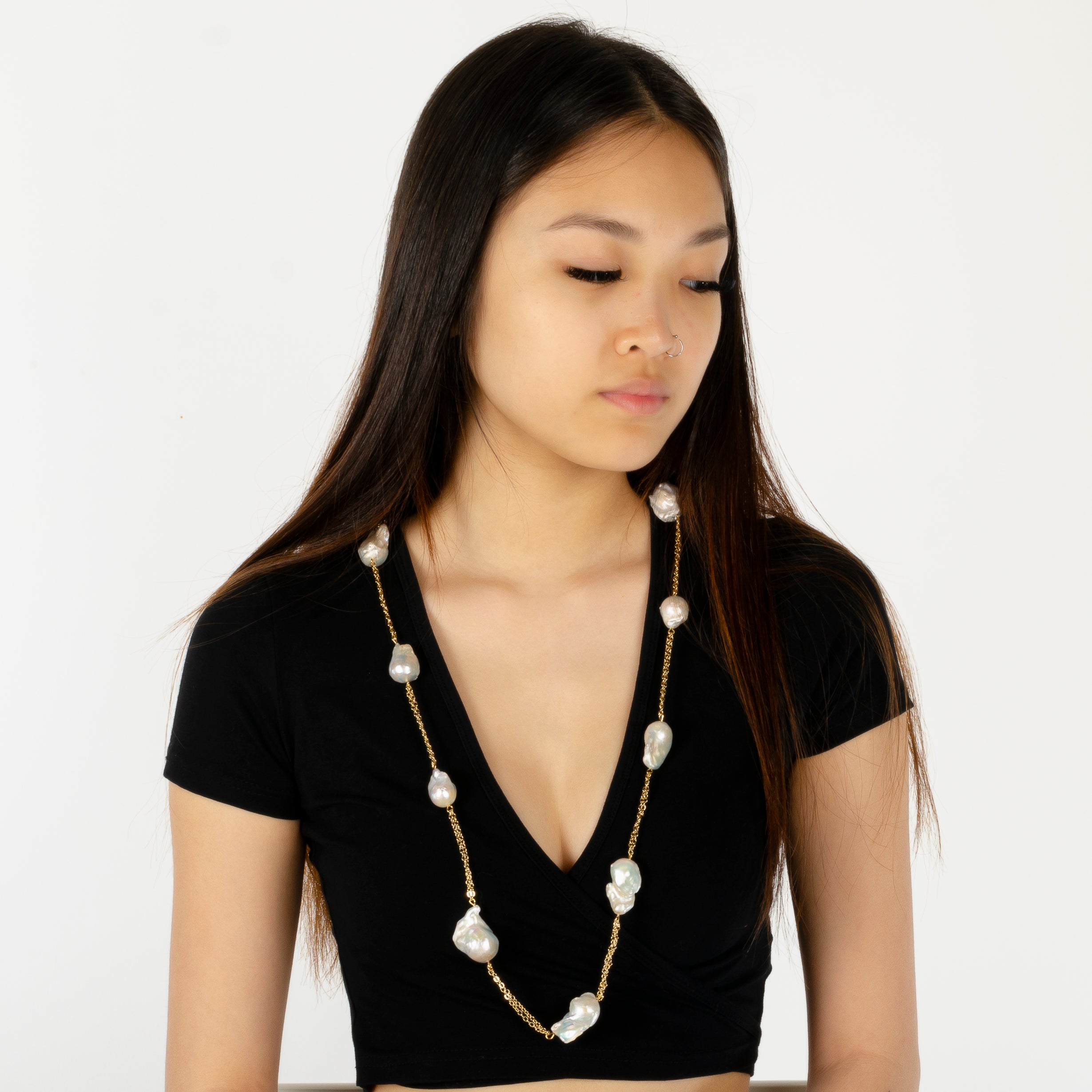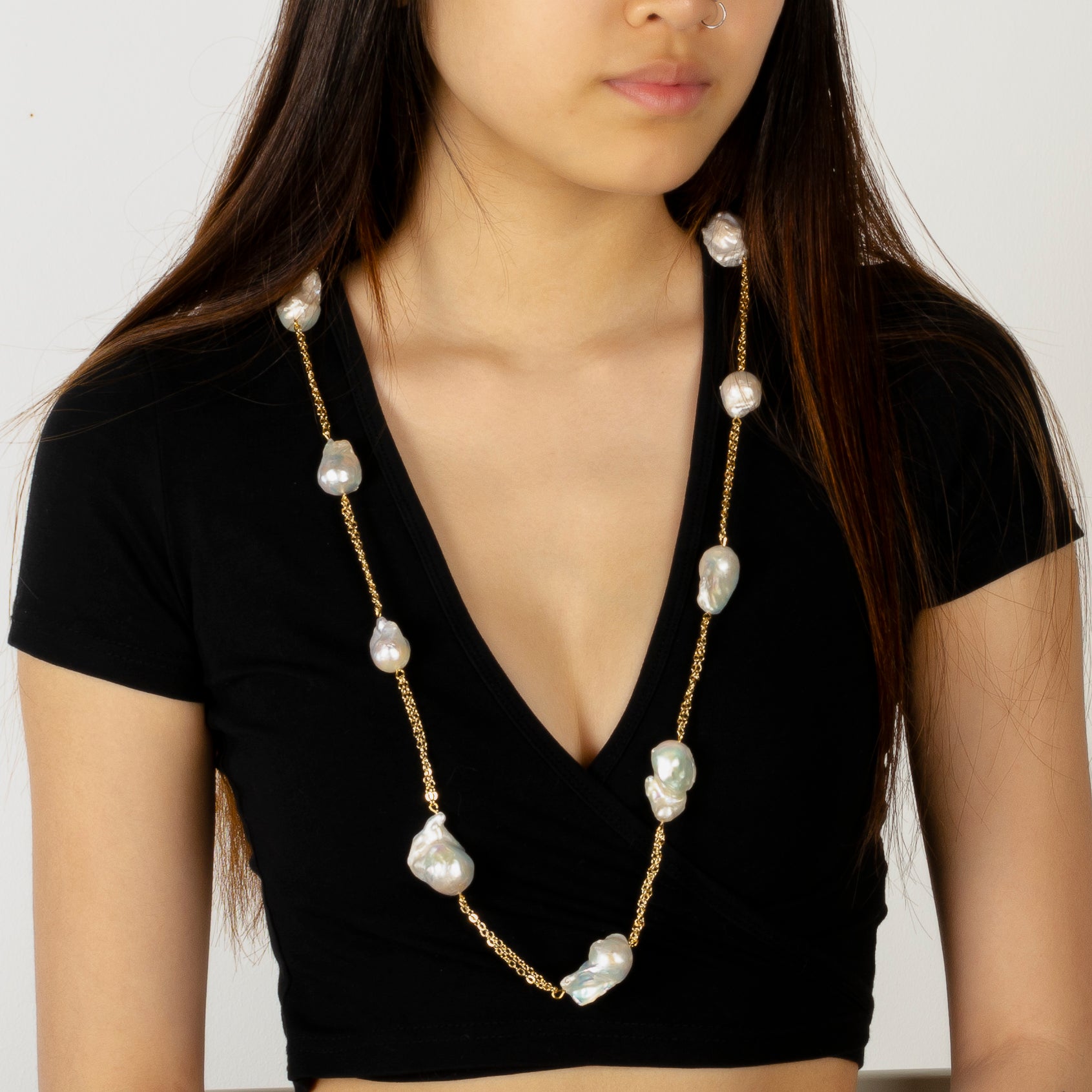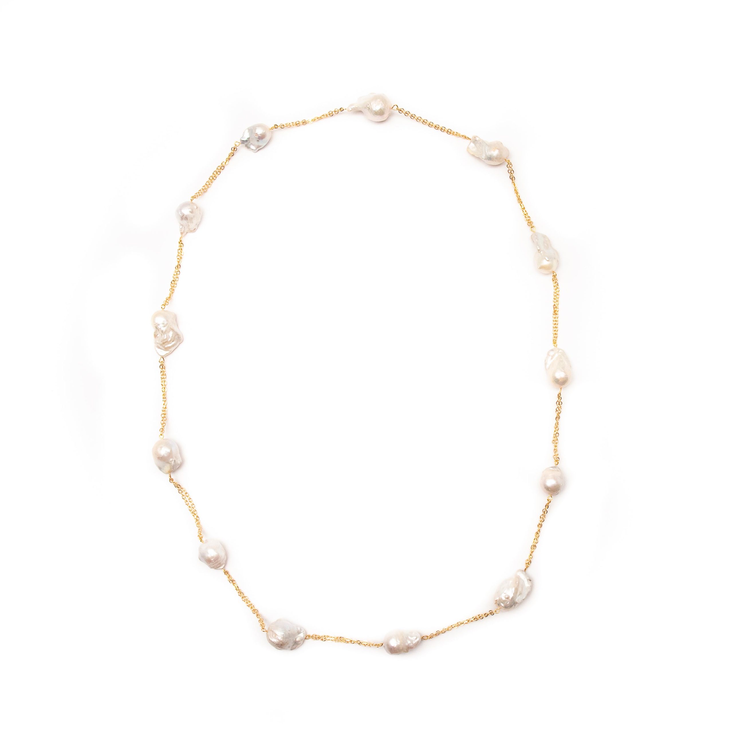 -Necklace is made with fine quality white baroque pearls with dual gold chain                                                                      -The necklace strung on 18K gold plated chain                                                             -Length of the necklace is 40 inchesÂ