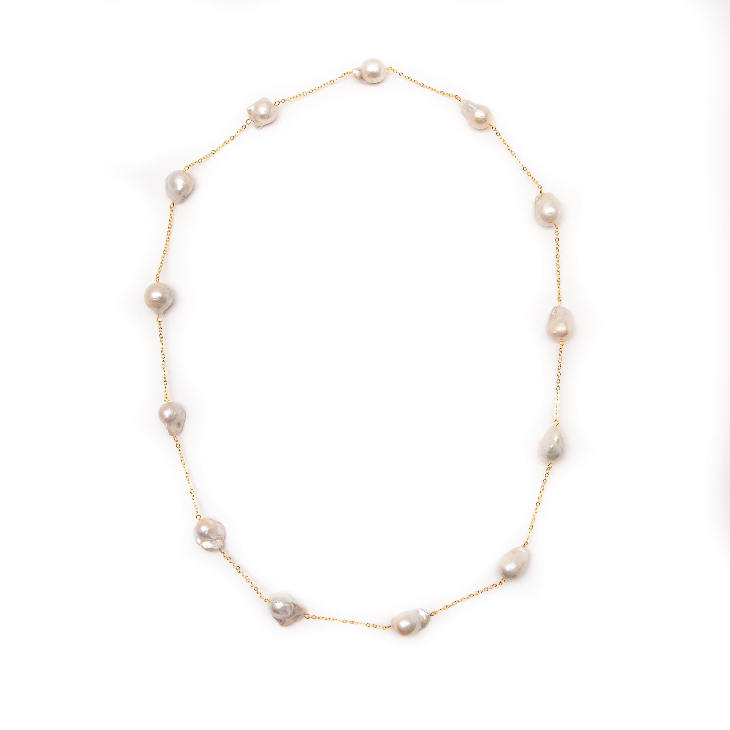 -Necklace is made with fine quality white baroque pearls with gold chain                                                                      -The necklace strung on 18K gold plated chain                                                             -Length of the necklace is 40 inchesÂ