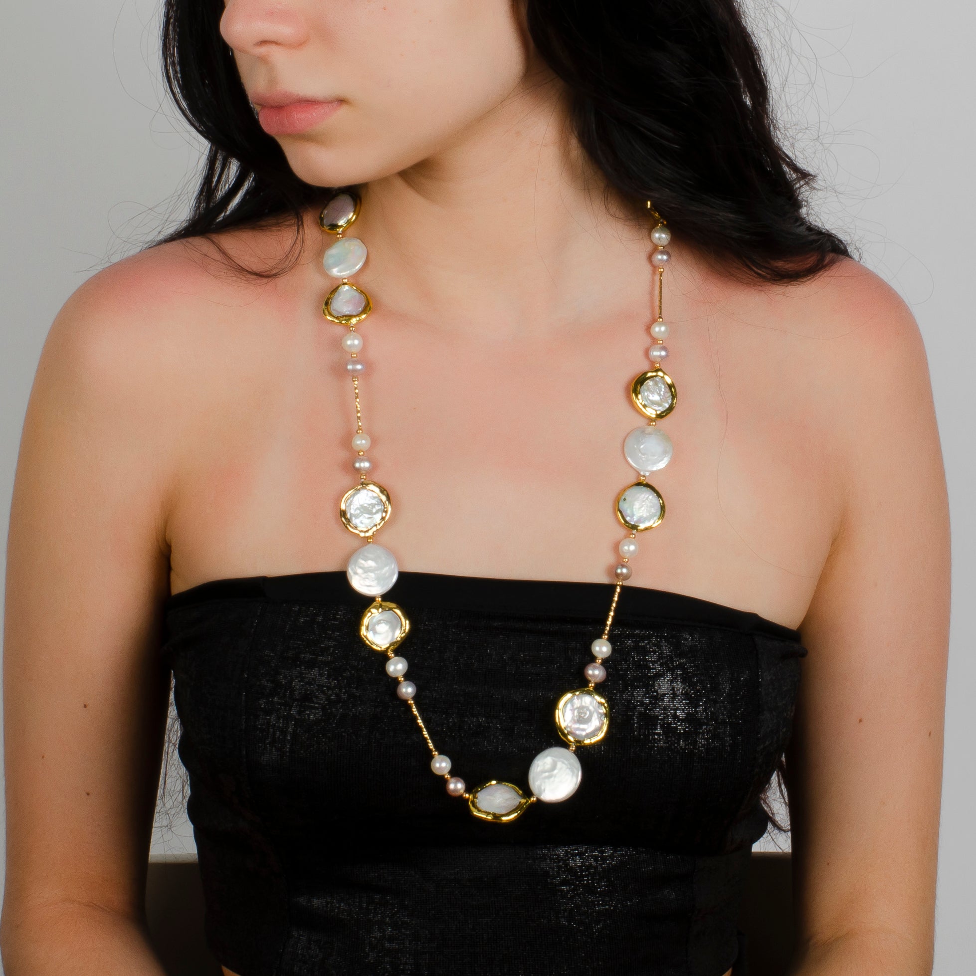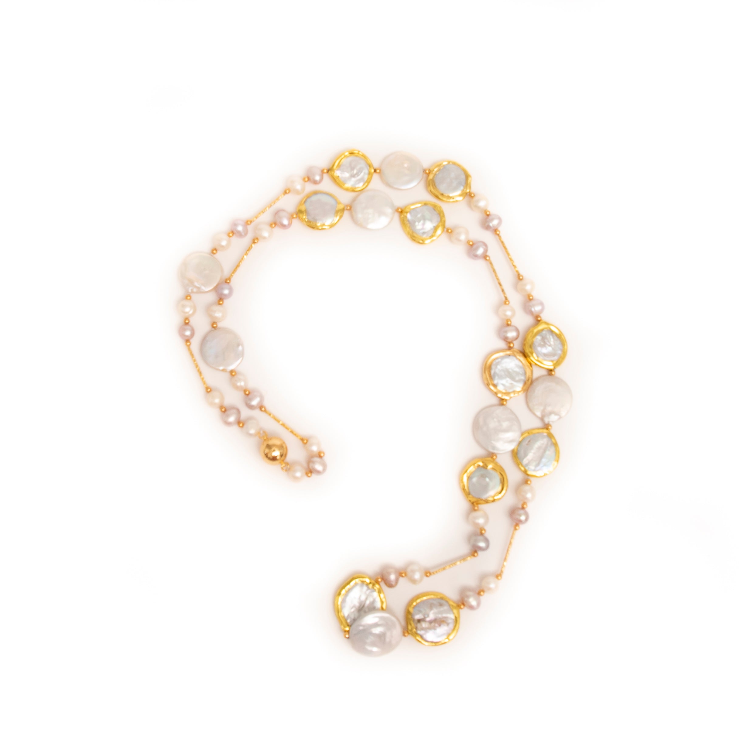 -Necklace is made with fine quality white coin pearls outlined in gold and chunky    -The pearls are hand knotted with small round white and pink fresh water pearls with   18K gold plated wireÂ