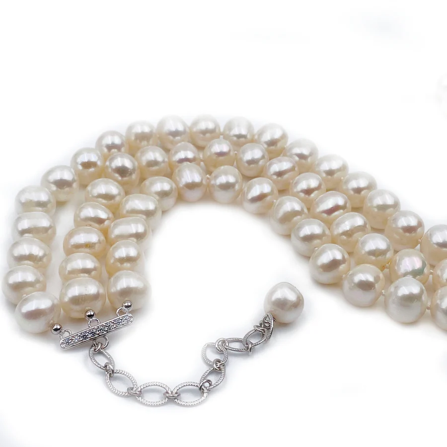 - The pearls are hand knotted with three strands of white pearls and it has a silver clasp that can be adjusted according to your neck size.