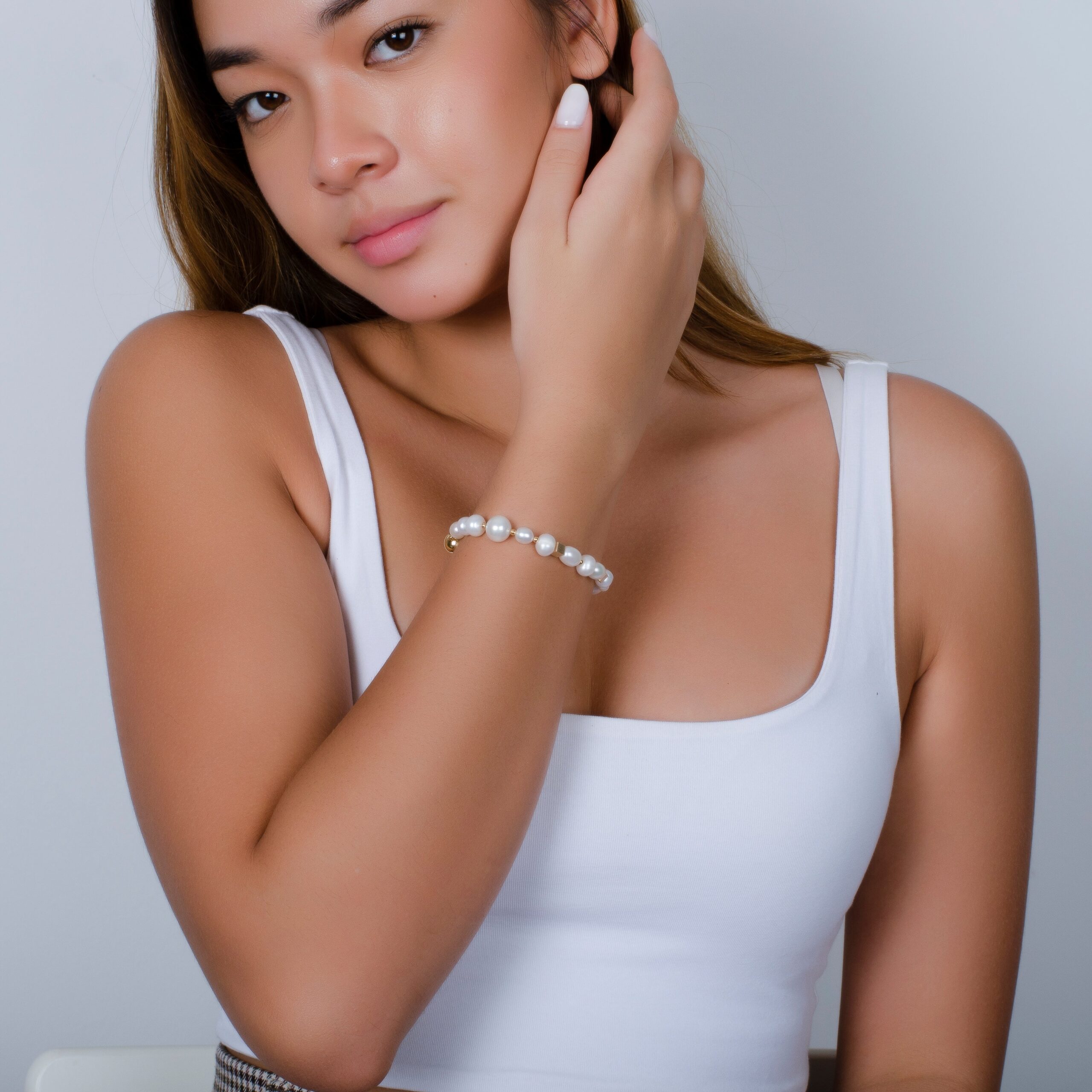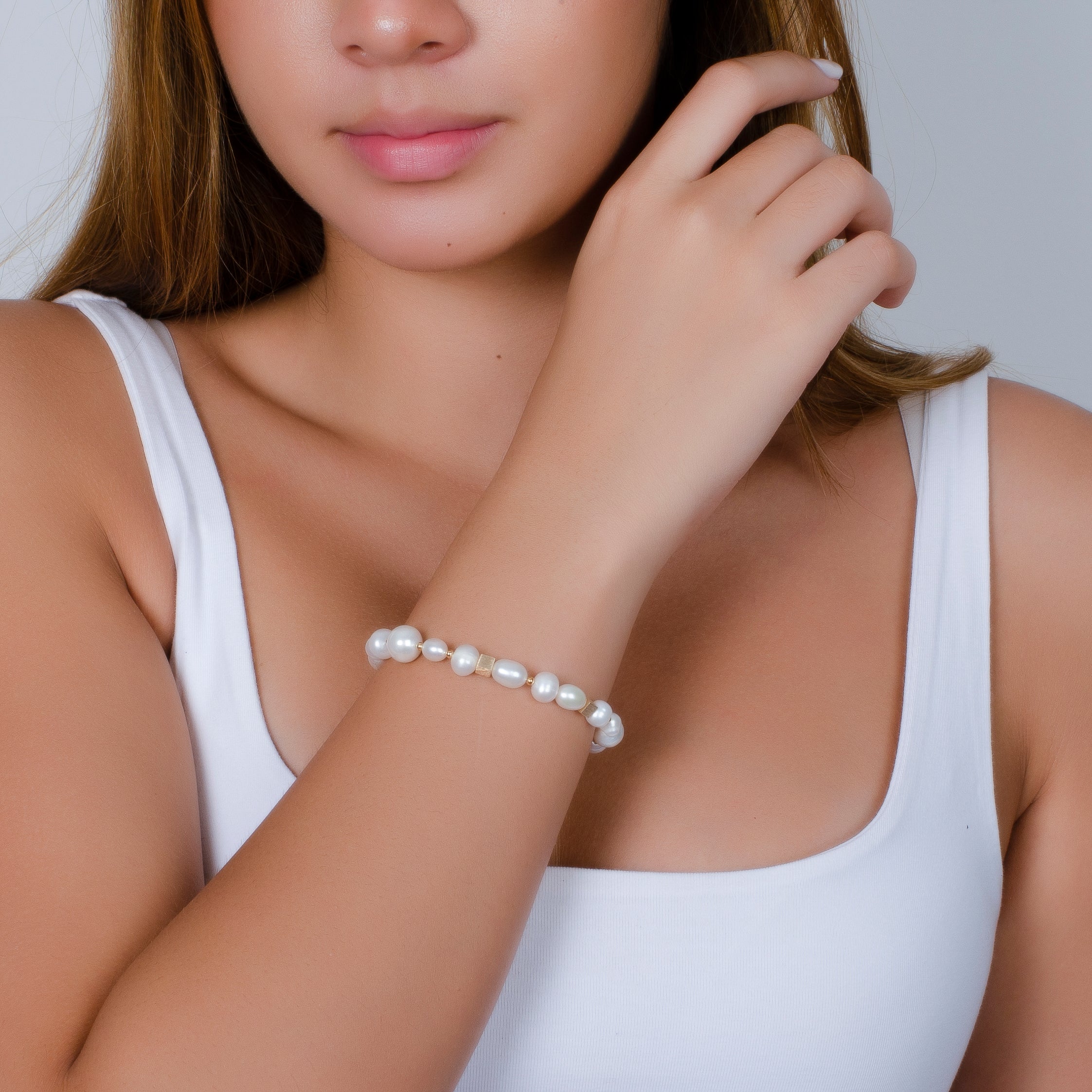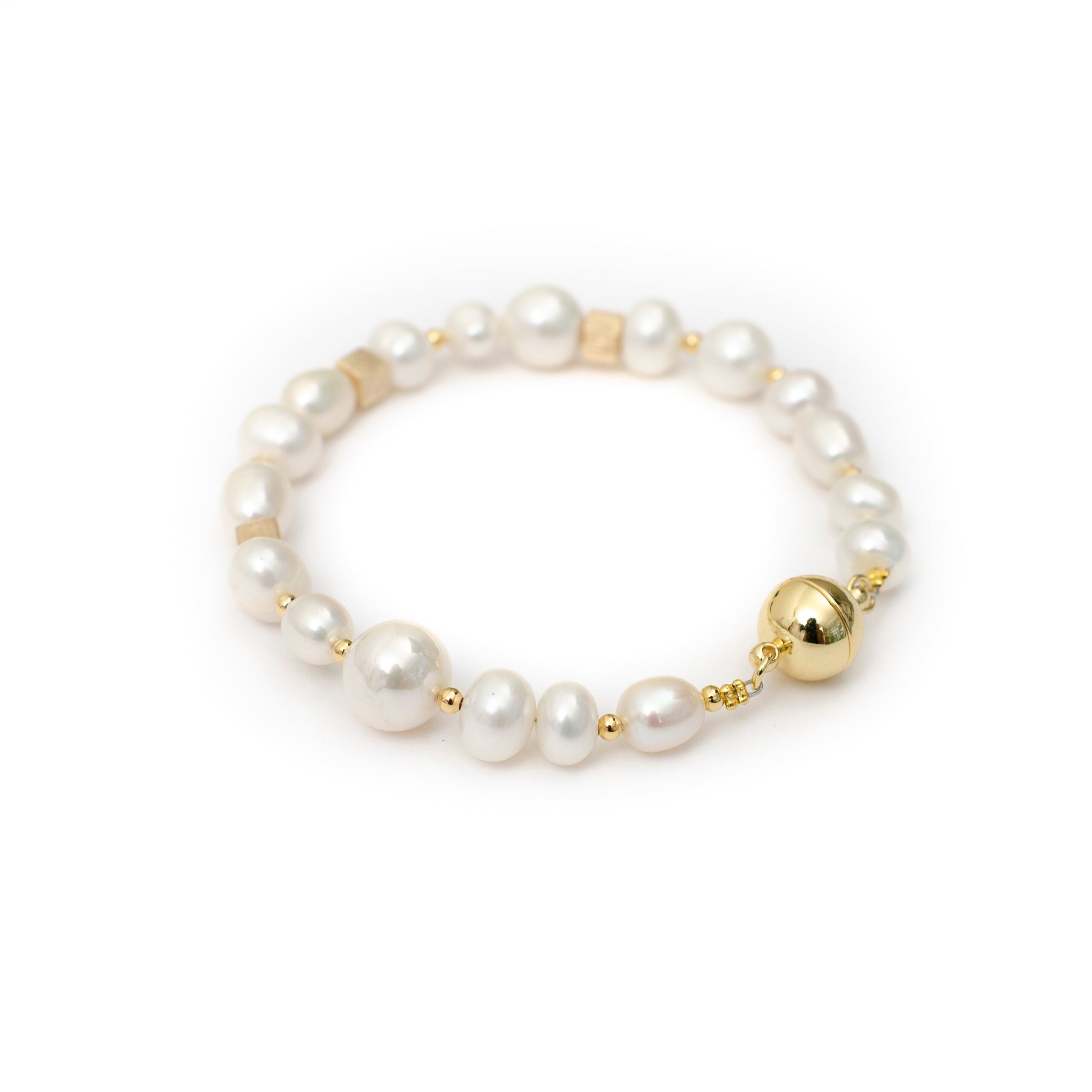 -Beautiful white fresh water pearl bracelet                                      -Set in with 18K Gold plated squares