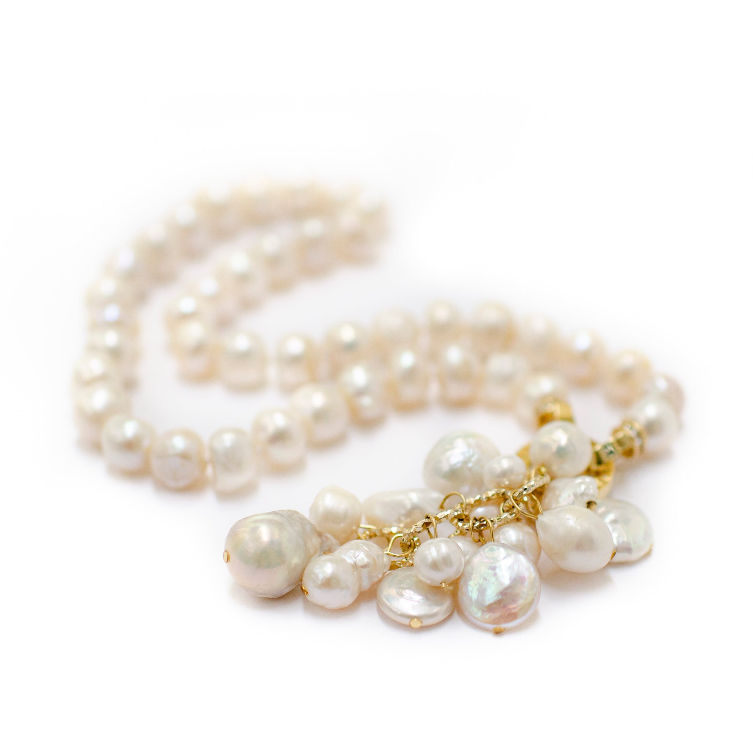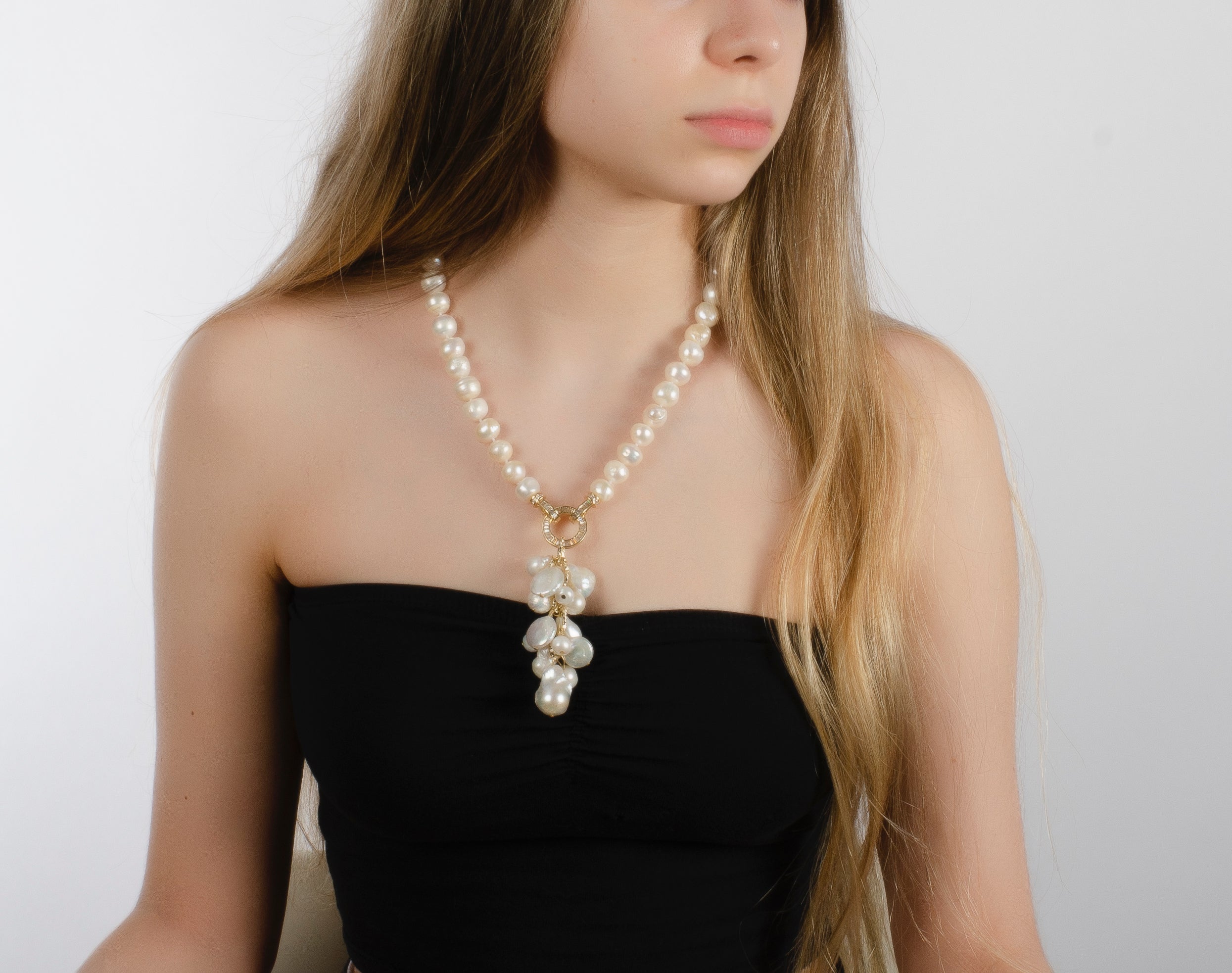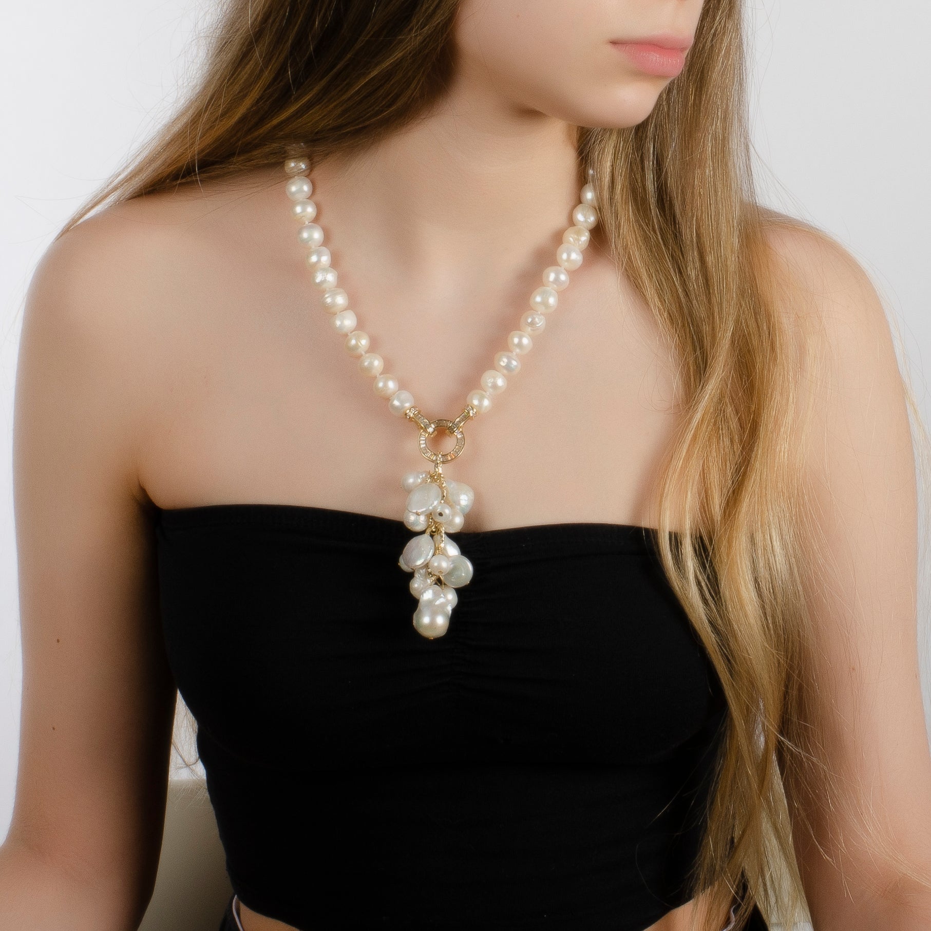 -Classic white fresh water pearl necklace with a multi pearls drop