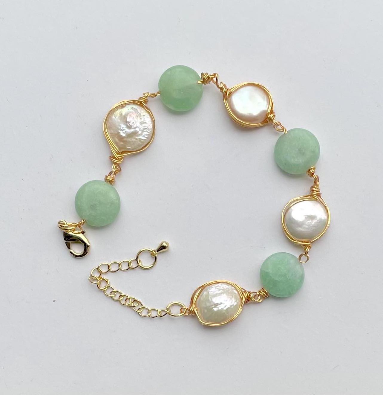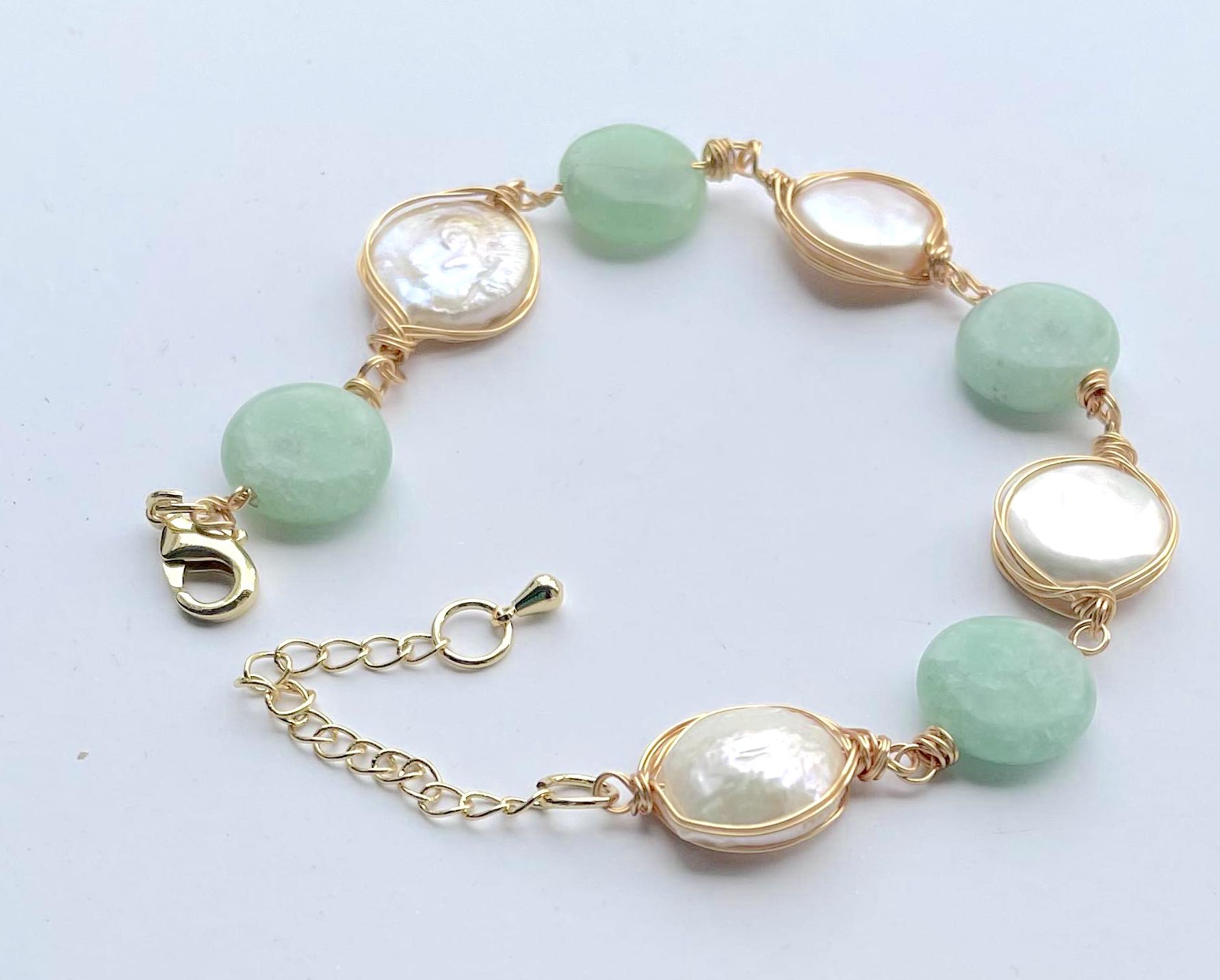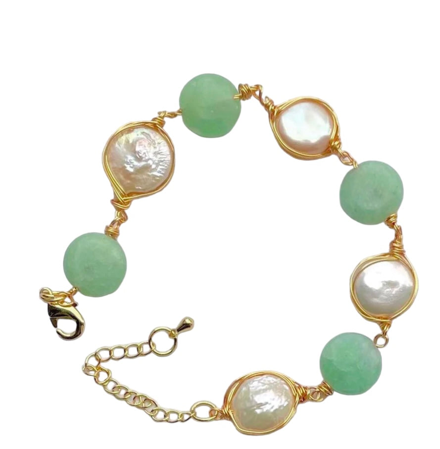 -Beautiful white fresh water pearl coin pearl bracelet with gold wire with natural jade stone
