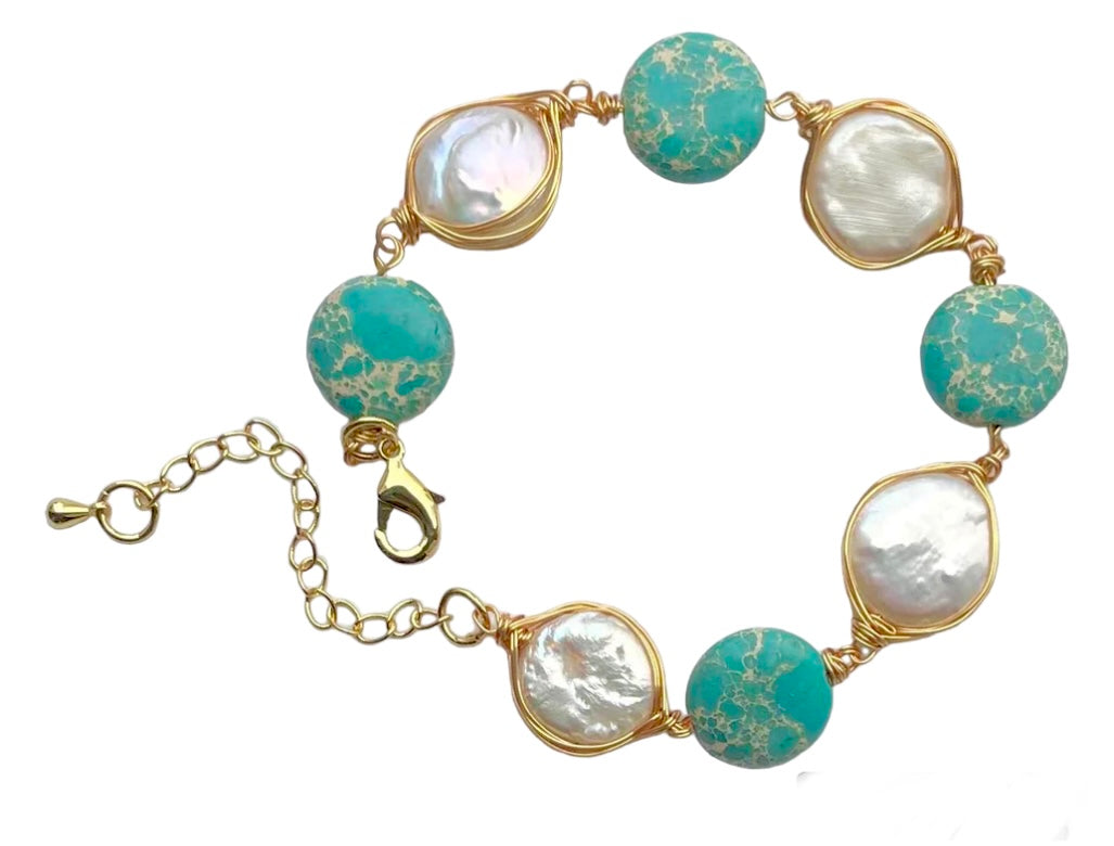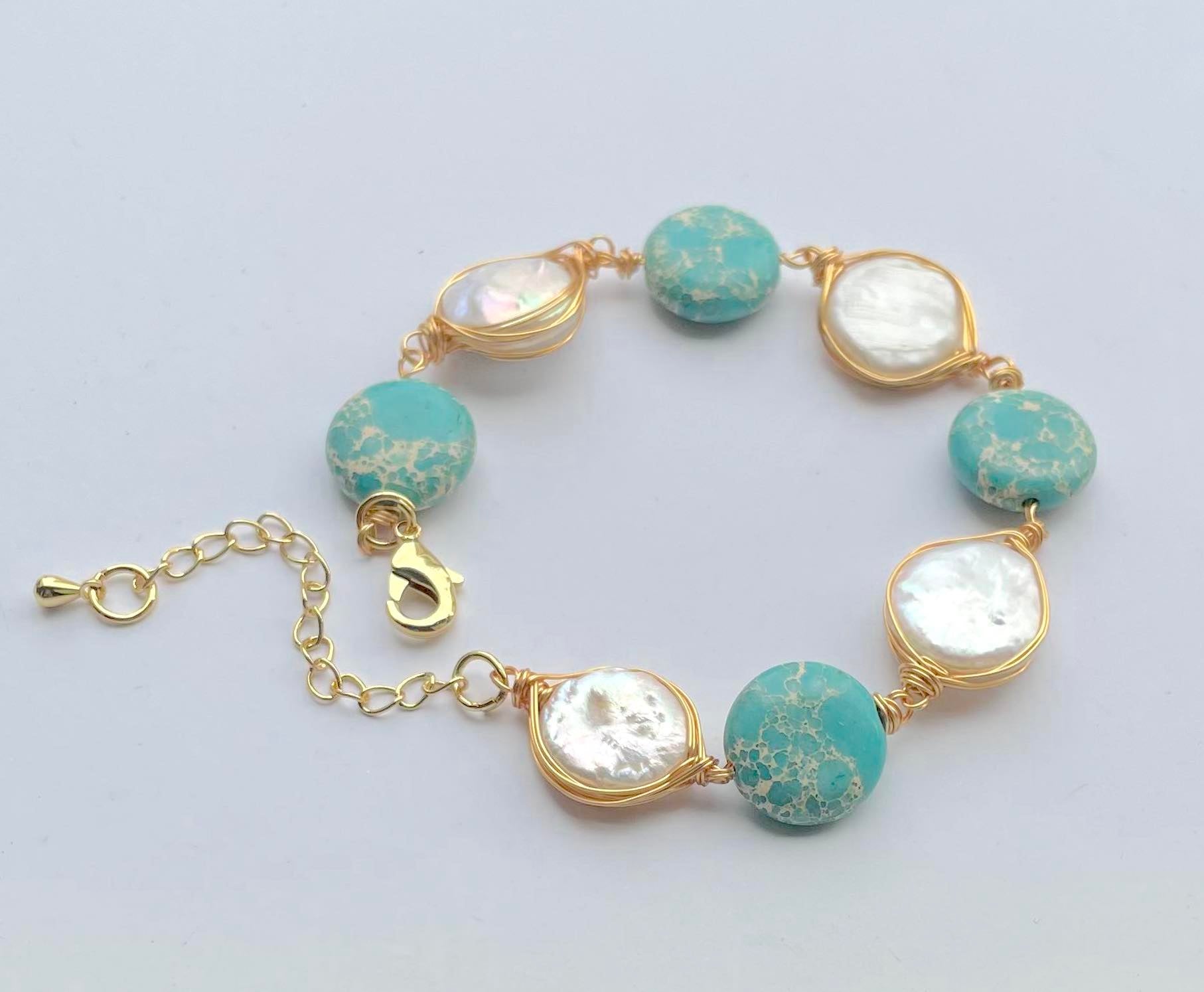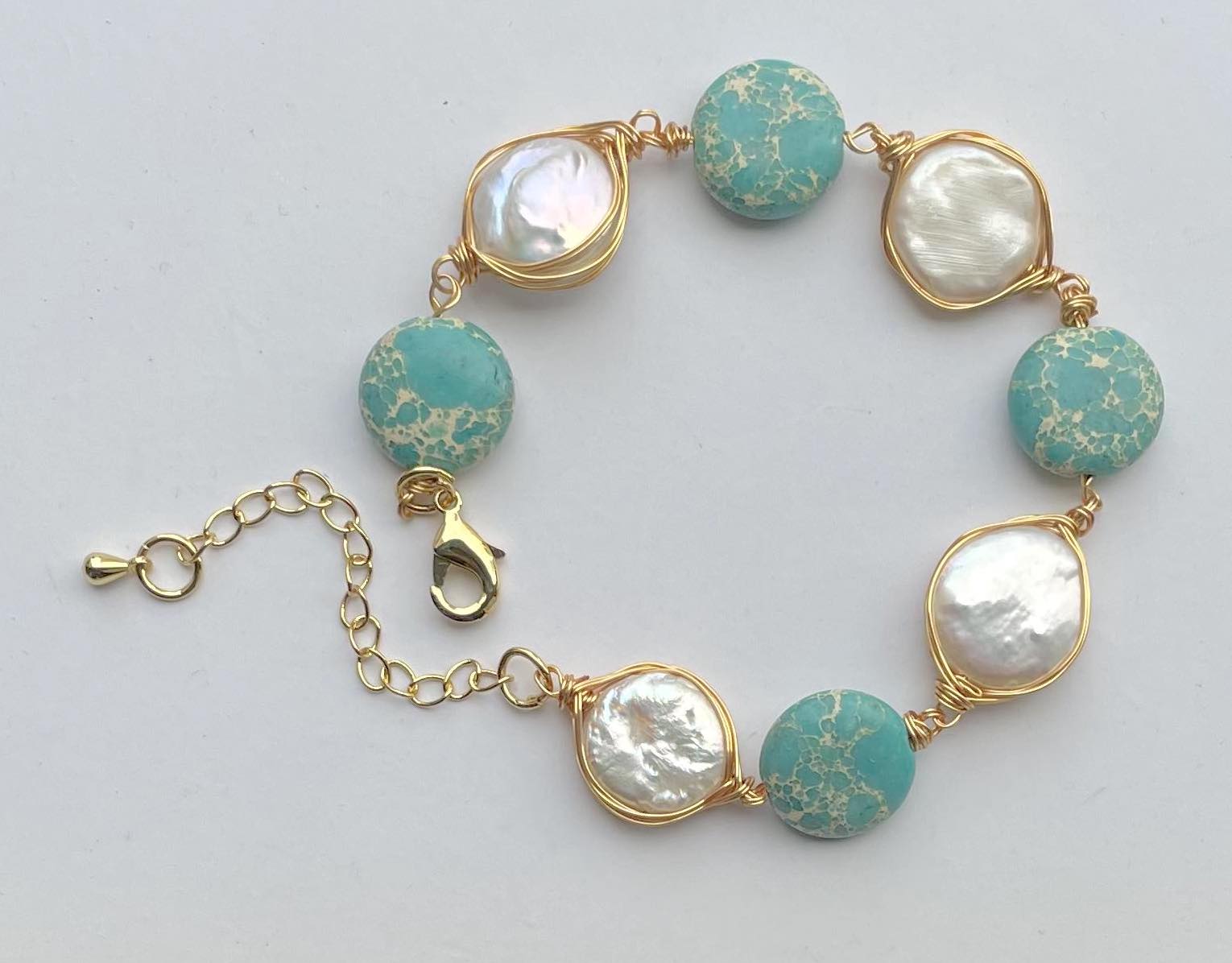 -Beautiful white fresh water pearl coin pearl bracelet with gold wire with natural jade stone
