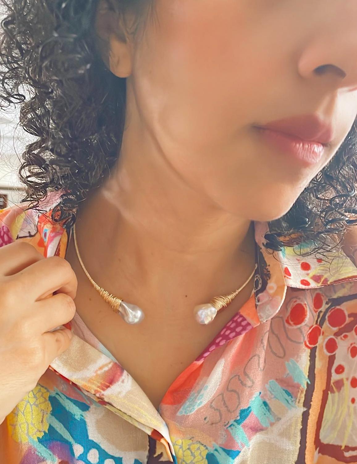-Lustrous pink and grey baroque pearl choker necklace                                           -Handmade with 18K gold plated wireÂ